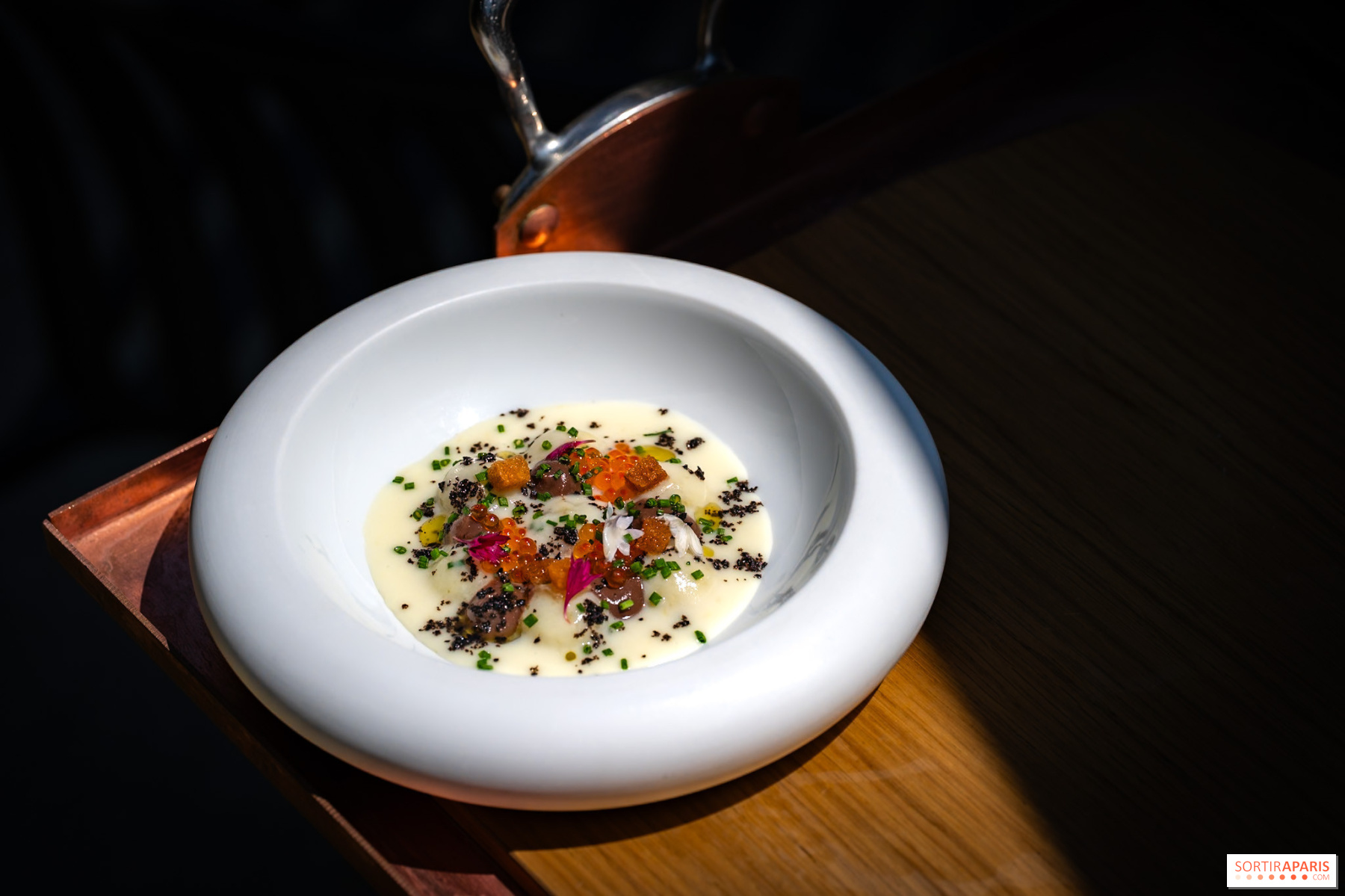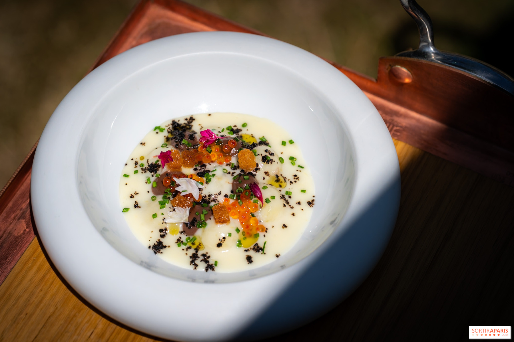 Es folgt ein hübscher pflanzlicher Teller: Julien Favrys neue Kartoffel in Vichyssoise-Samt, schwarze Oliven und geräucherte Forellenrogen, für einen zugleich süßen und jodhaltigen Bissen.