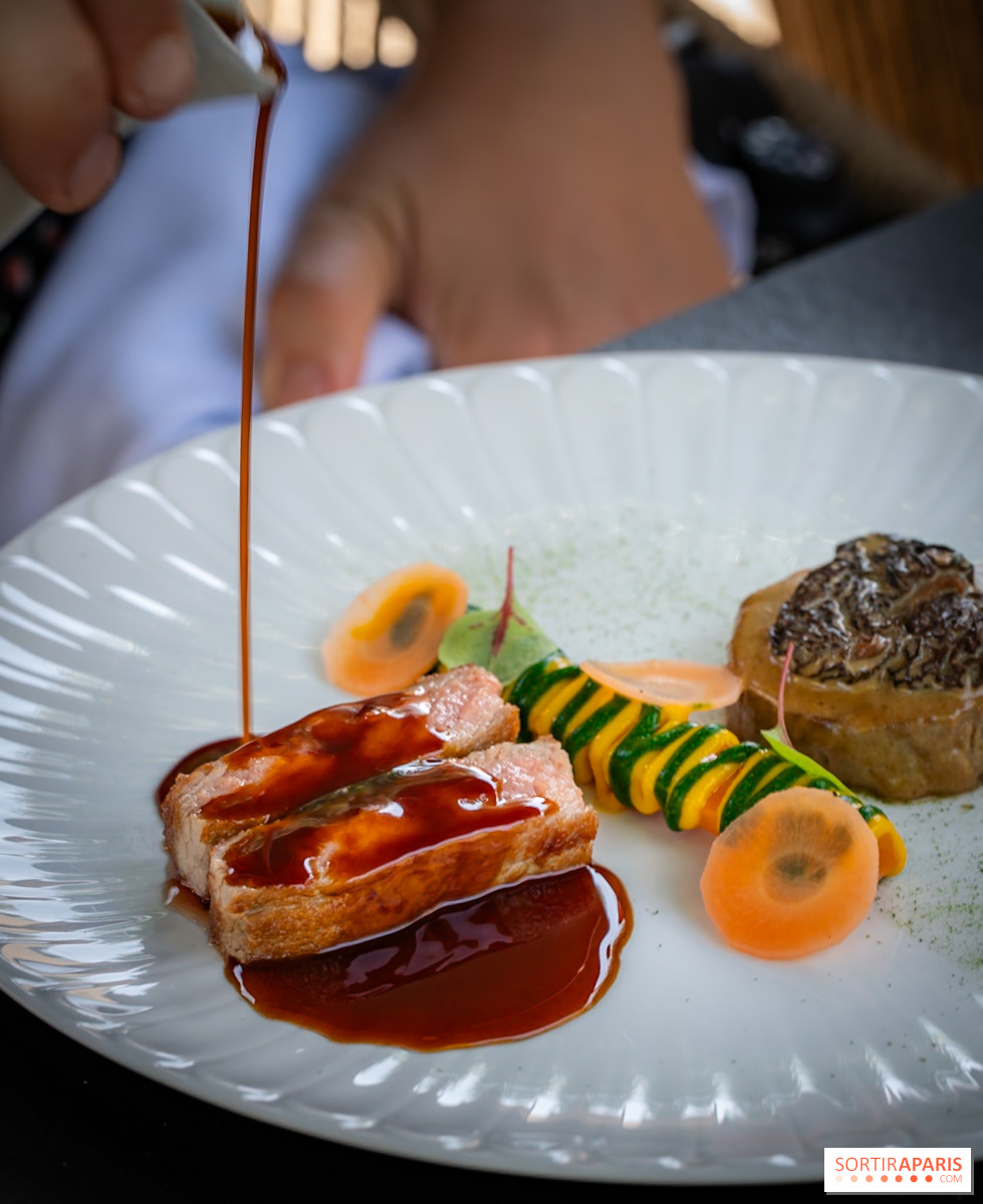Das Kalb aus dem Cantal, das in drei Gängen angeboten wird, rundet das Menü kraftvoll ab: sorgfältig gegart, Gemüse von der Farm Les Gogottes und besondere Aufmerksamkeit für die Jus und die Beilagen. Man schätzt auch das Kalbstartar, das dem Ganzen Frische verleiht.