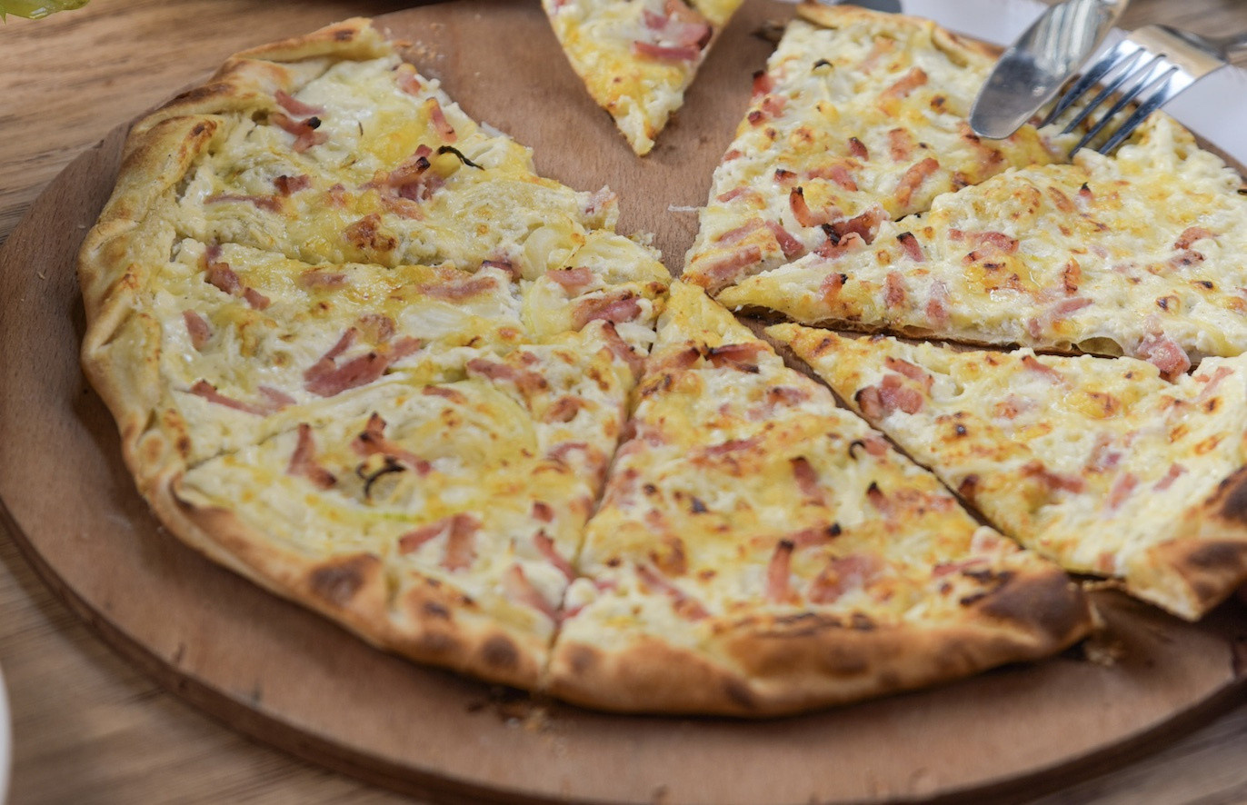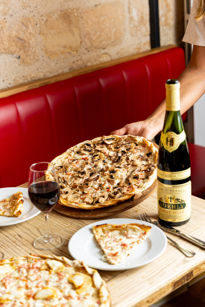 Die Stars im Haus? Die Flammekueches, knusprig, dünn und großzügig belegt. Doch die echte Überraschung, die alle begeistern, sind die Stücks: typisch elsässische Tapas, von jedem für nur 5,50 € zu haben. Perfekt zum Mitessen, um verschiedene Geschmacksrichtungen zu testen und den Aperitif ohne großen Aufwand zu verlängern.