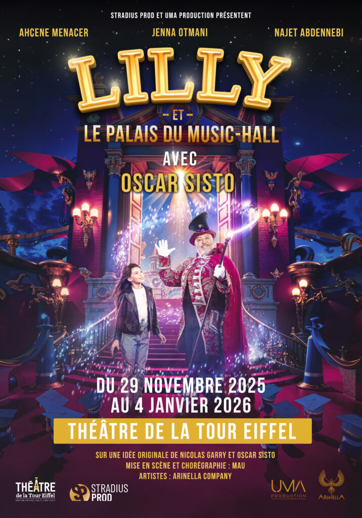 Το Théâtre de la Tour Eiffel παρουσιάζει από τις 29 Νοεμβρίου 2025 έως τις 3 Ιανουαρίου 2026 το Lilly et le Palais du Music-Hall, μια οικογενειακή παράσταση που συνδυάζει μουσική, χορό, κωμωδία και θεατρική φαντασία. Σχεδιασμένη από την Stradius Production και την UMA Production, η παράσταση παρουσιάζει ένα ταξίδι μύησης που οδηγεί μια νεαρή ηρωίδα σε ένα μαγικό κόσμο εμπνευσμένο από τα μεγάλα καμπαρέ του Παρισιού. Η καλλιτεχνική διεύθυνση και η σκηνοθεσία έχουν ανατεθεί στον Oscar Sisto, γνωστή προσωπικότητα του θεάτρου και της μετάδοσης, ο οποίος ερμηνεύει επίσης έναν από τους κύριους ρόλους.