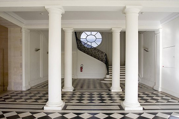 Au rez-de-chaussée, on découvre un hall traversant de80 m2, magnifique avec ses 8m de hauteur sous plafond. Puis, en empruntant l'escalier en fer forgé, on peut profiter d'une salle à colonnes au sol en marbre noir et blanc ouvrant sur les jardins du Carrousel et sur une jolie salle au deuxième étage, laquelle est plus moderne avec des murs blancs, un sol en résine grise et des murs équipés de cimaises.