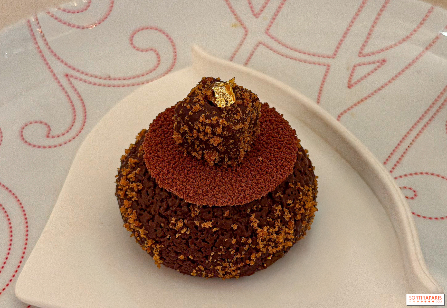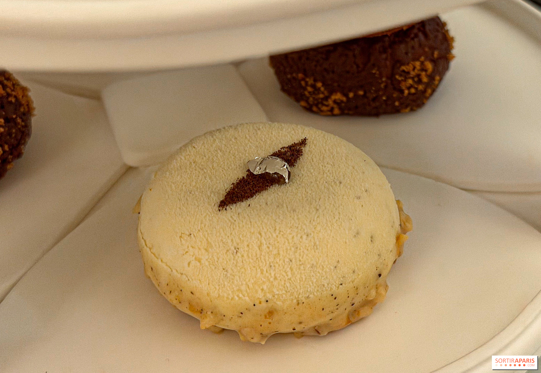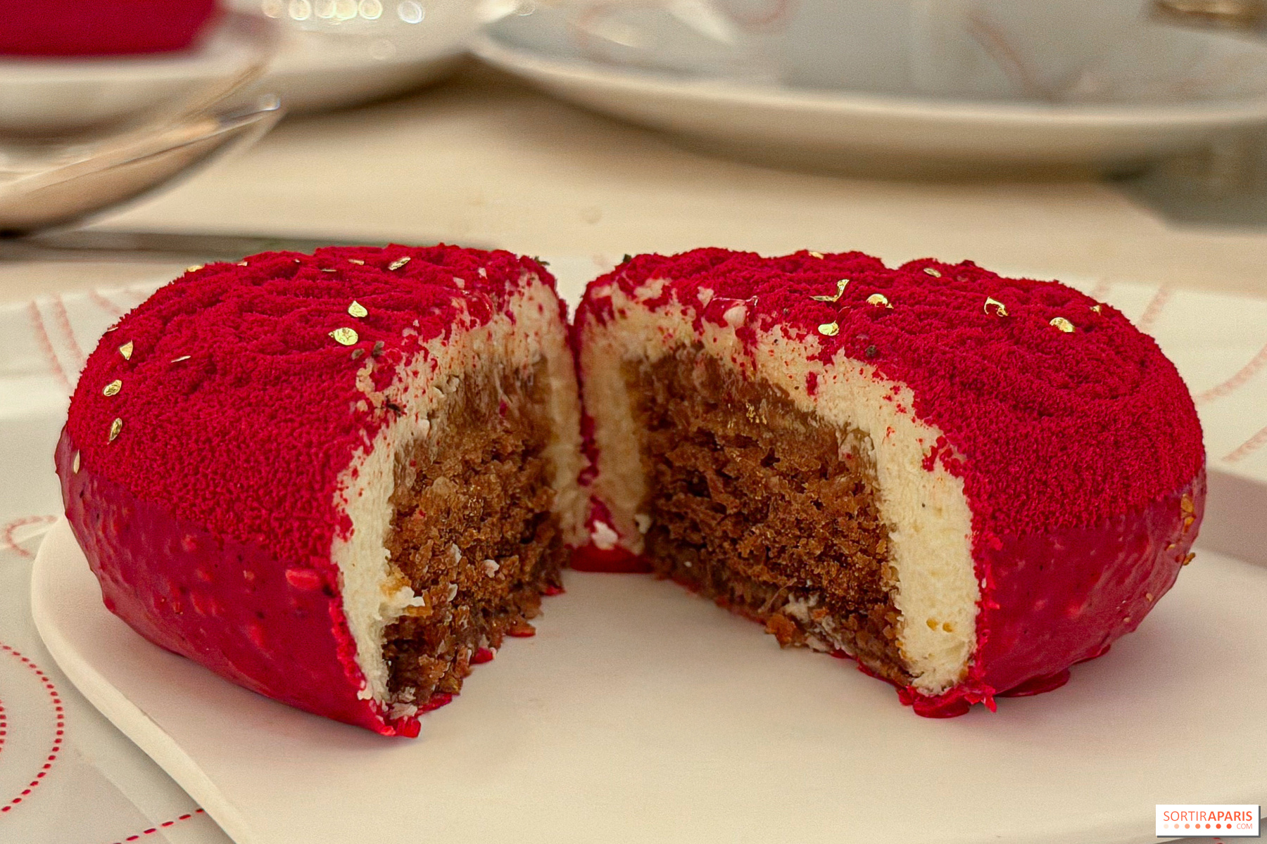 The display, whose design echoes the iconic façade of the Plaza, then showcases six exquisite pastries. At the top, a champagne crème brioche, soft and flawlessly crafted, alongside the "100% Plaza"—a nod to the upcoming 2025 Christmas log: pecan biscuit, honey crunch, citrus marmalade, honey caramel, and citrus-honey mousse, all dressed in the house’s signature red. This bold honey-citrus pairing offers an elegant yet somewhat polarizing flavor profile. In the center, a chestnut tartlet filled with chestnut confit and delicate tuile wafers will delight connoisseurs, while the airy, melt-in-the-mouth pear-bergamot roulade provides a nostalgic taste that recalls the lightness of a Japanese cheesecake. At the bottom, the "100% vanilla" entices with its Madagascar vanilla-infused mousse, a well-hazelnutted praline center, and a crisp biscuit, while the Christmas choux filled with gingerbread and chocolate sparks debate, thanks to its pronounced spices and subtle bitter notes.