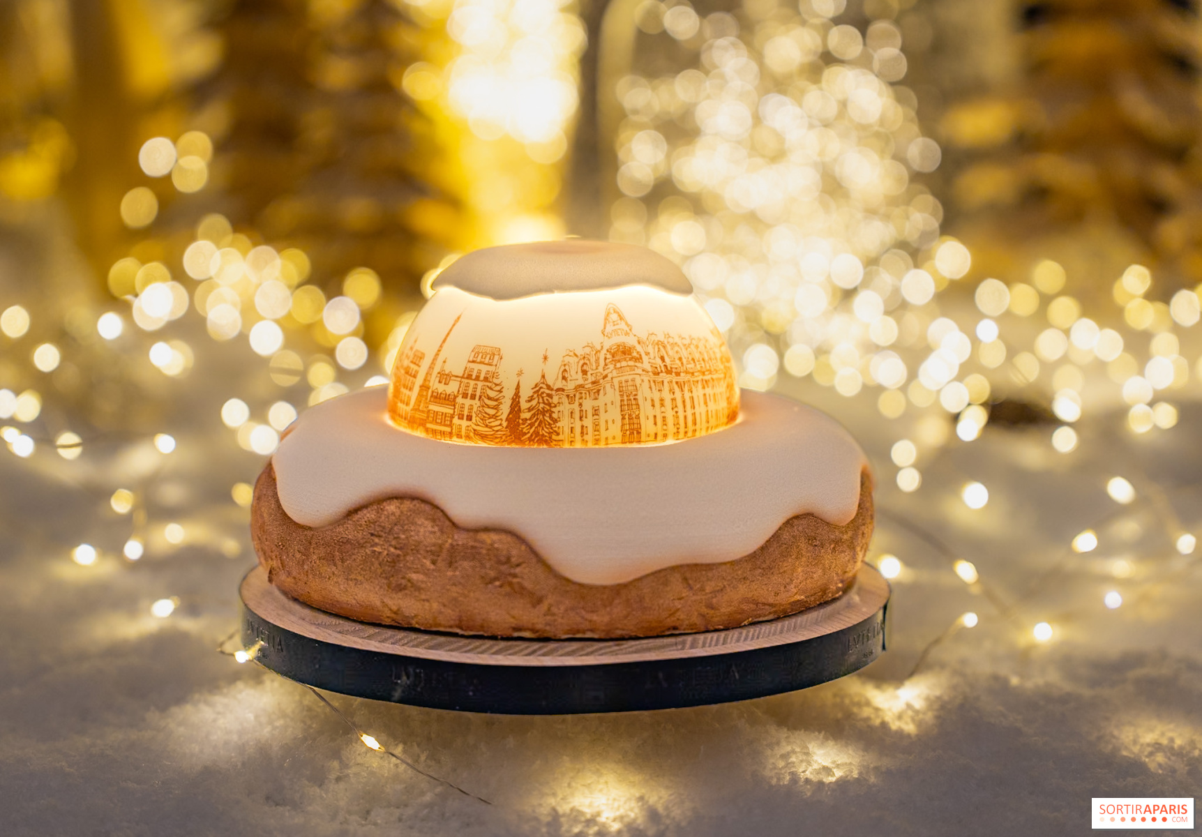 The real highlight of this Yule log is its white chocolate dome, decorated with lithophanied copper motifs of Paris. This refined technique creates translucent reliefs that light up thanks to a nightlight hidden inside. Once the light is switched on, the capital's monuments seem to dance and sparkle, offering a magical spectacle that echoes Paris's winter illuminations. It's a veritable celebration of the City of Light that comes to life before our very eyes, transforming dessert into a visual as well as a gustatory experience.