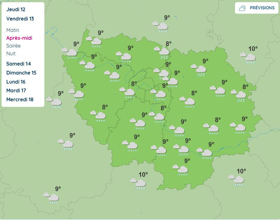 According to Météo-France, the heaviest rainfall amounts are expected in the Seine-et-Marne (77) and Essonne (91) departments starting at 3 p.m. on February 13. These showers are likely to continue into the evening. With the area already under a yellow flood alert, Seine-et-Marne will be under especially close watch.