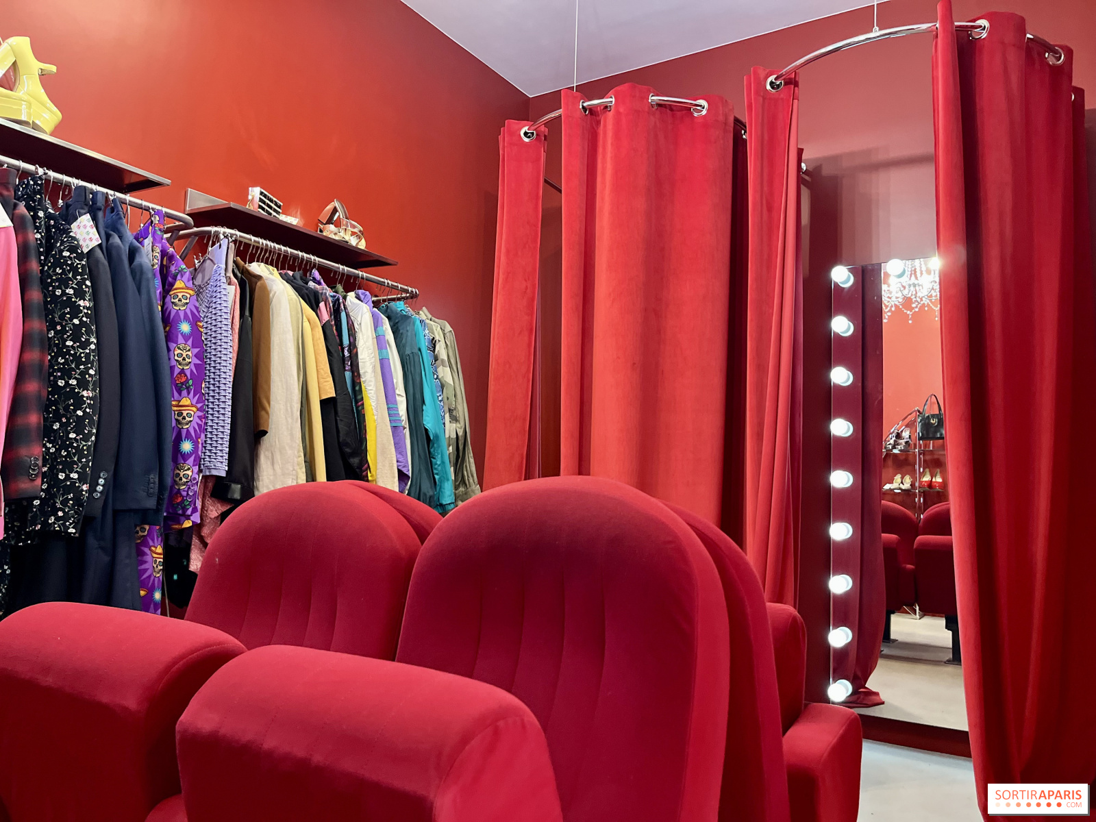 And the whole world of the thrift store is reminiscent of the seventh art, with a red carpet that welcomes you like a star, recovered from a festival, two dressing rooms with mirrors worthy of artists' dressing rooms, whose brightness can be adjusted to see yourself at your best, and seats recovered from the Elysées Lincoln cinema, enough to wait comfortably for your loved ones who spend two hours trying on everything in the store.