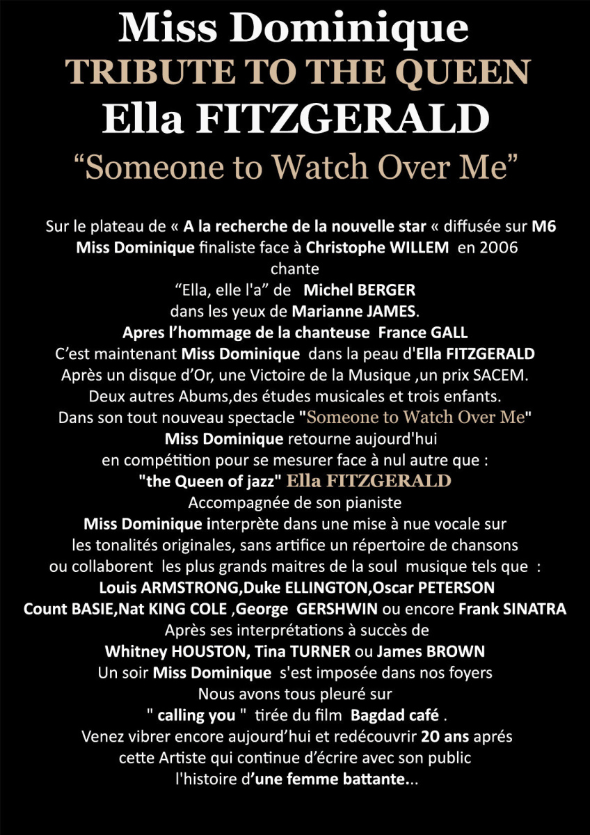 Miss Dominique will headline two tribute concerts in Paris in April 2026, with Today I Sing The Blue, a concert dedicated to Aretha Franklin on April 11, 2026 at the Théâtre Stéphane Gildas in the 13th arrondissement, then Someone to Watch Over Me a concert devoted to Ella Fitzgerald on April 16, 2026 at the Théâtre Clavel in the 19th arrondissement.