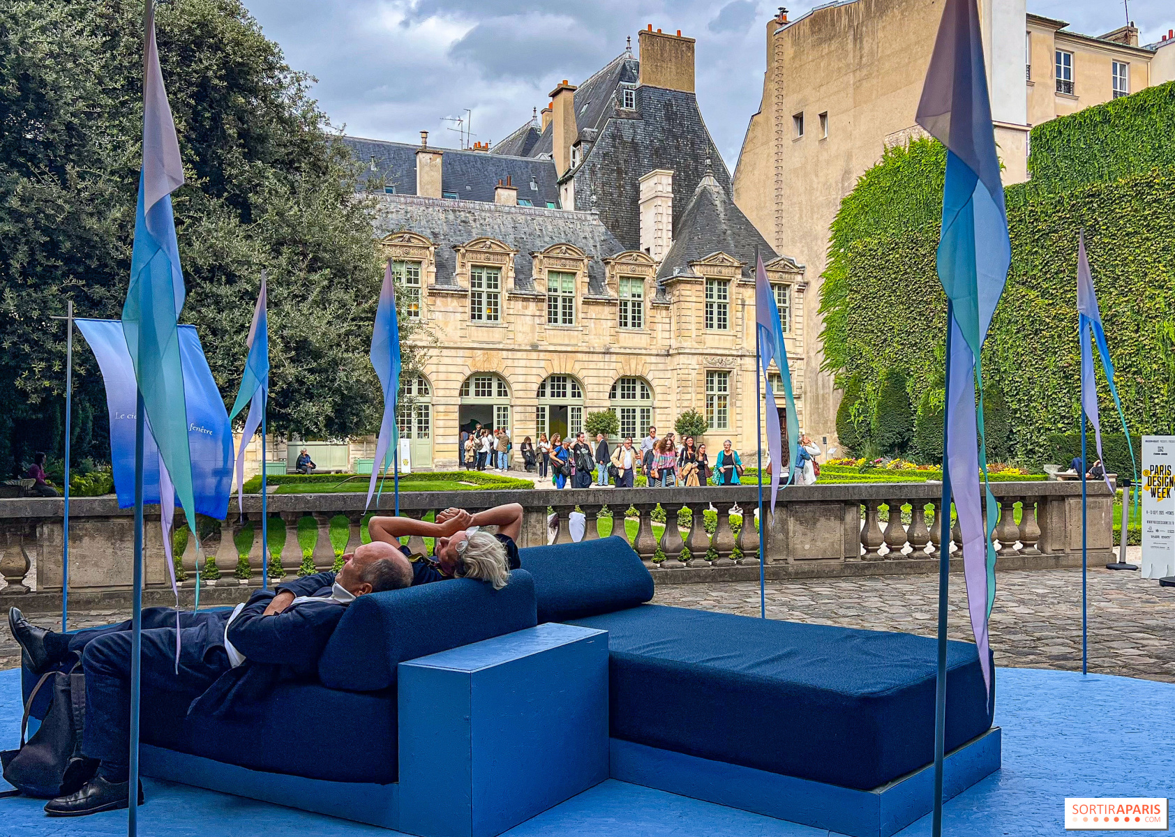 In this bouquet of experiences, Folie, the new multisensory installation by Lucas Huillet and Alexandre Helwani, catches the eye. Following the success ofEau Fraîche in 2024, the duo invite us to the terrace of the Hôtel de Sully(Paris 4th arrondissement) from September 3 to 14, 2025, where a monumental divan-causeur invites us to recline and entrust our worries to art. Above, moving fabric chimeras, similar to colorful kites, float, encouraging you to let go and contemplate.
