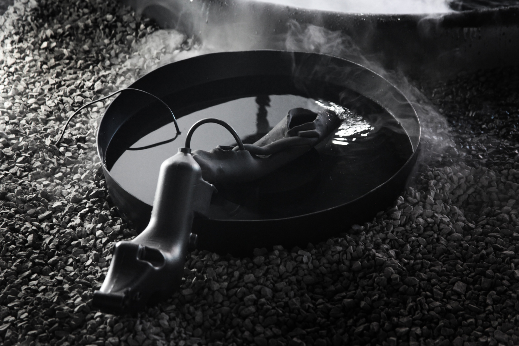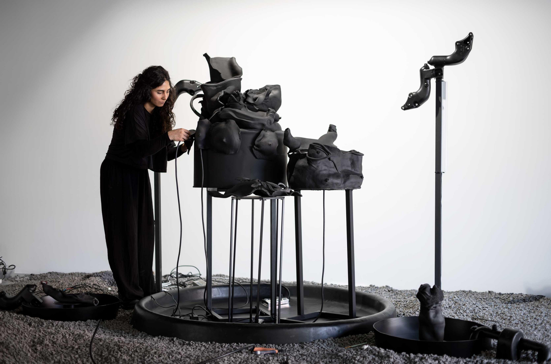 Here, visitors walk through a space dominated by dark tones, dense textures, and hybrid forms. Black, a striking presence throughout, isn’t just used as a visual effect; it functions as a material in its own right—both enveloping and silent, yet active. The route features works such as Exode, which explores the intersection of religious storytelling, female experience, and post-apocalyptic scenes; Anahithanor, a piece inspired by a mythological Persian figure of a fountain-bodied form, blending myth and alchemical imagery; Zhinar, a large-scale sculpture connected to women’s struggles; and L’Érosarbénus, an installation combining silicone, ceramics, programming, and motion. In this environment, the body becomes a landscape, a machine, a vessel of memory, or a surface of resistance—never confined to a single interpretation.