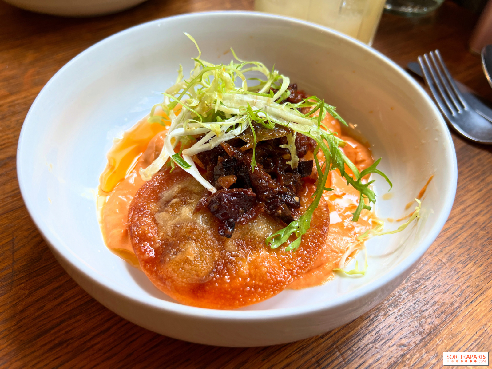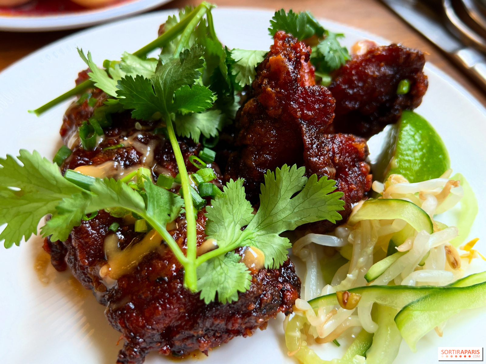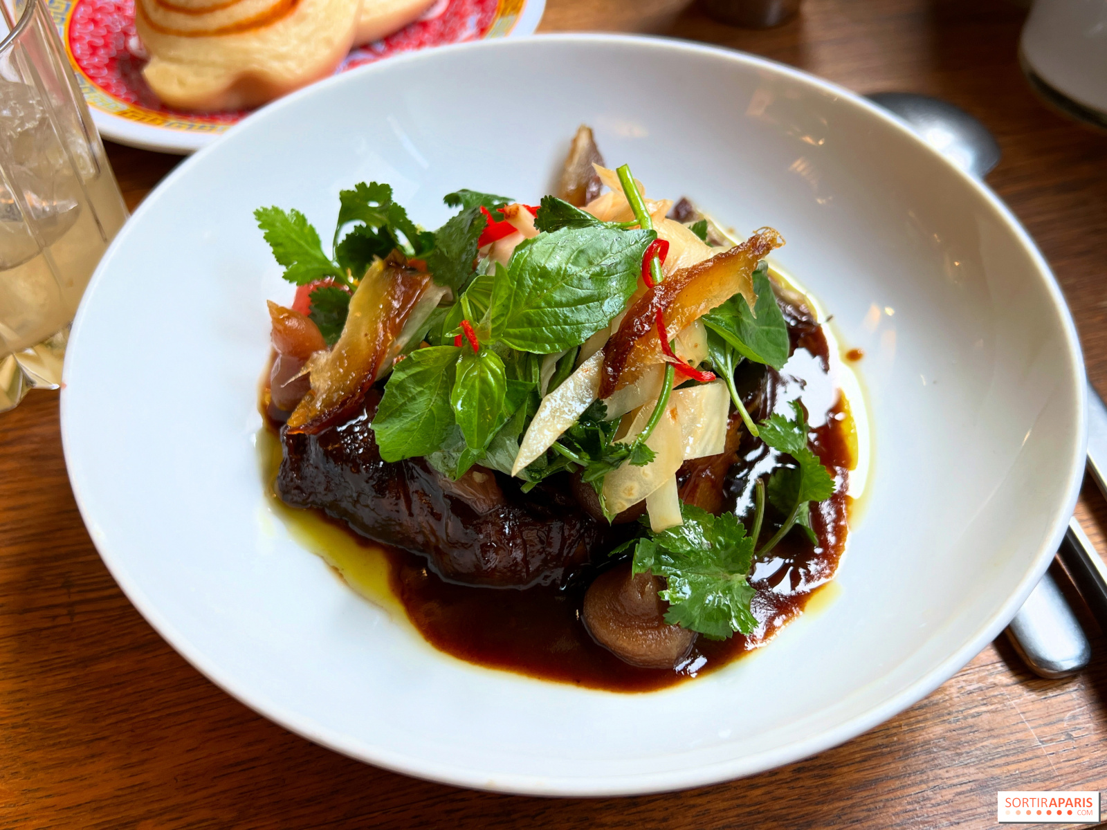 In detail, these include: char siew carrots, scamorza and bergamot sabayon; stunning fried wonton, squash caponata, XO cecina and homemade sriracha; addictive crispy caramelized chicken (you've been warned), beef cheek lacquered with hoisin sauce, celery, grapefruit and medjoul dates ; demonic yuzukosho-lacquered pig sushi (11€), and as side dishes, vegetable oden with spicy miso sauce (a sort of delicate little stew) and steamed satay buns whose recipe we'd gladly steal.