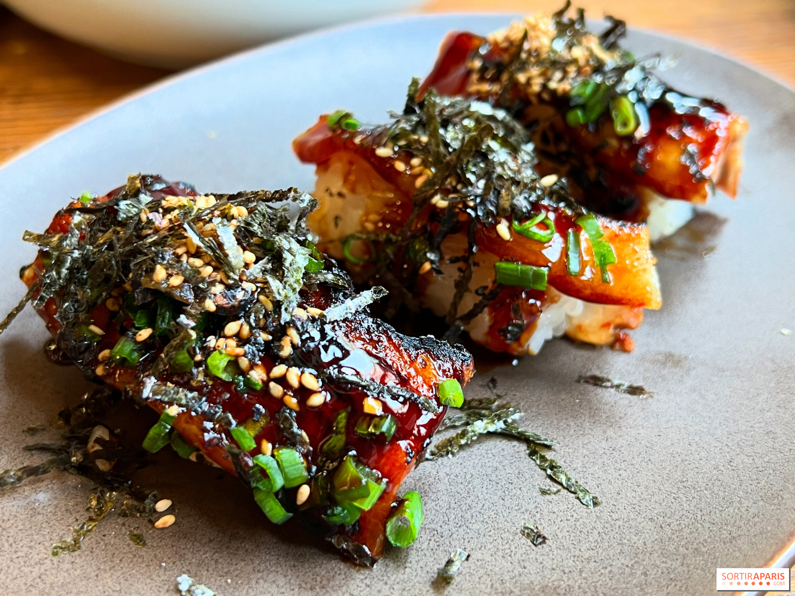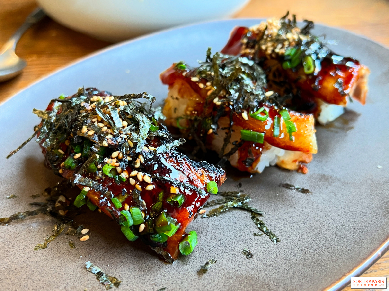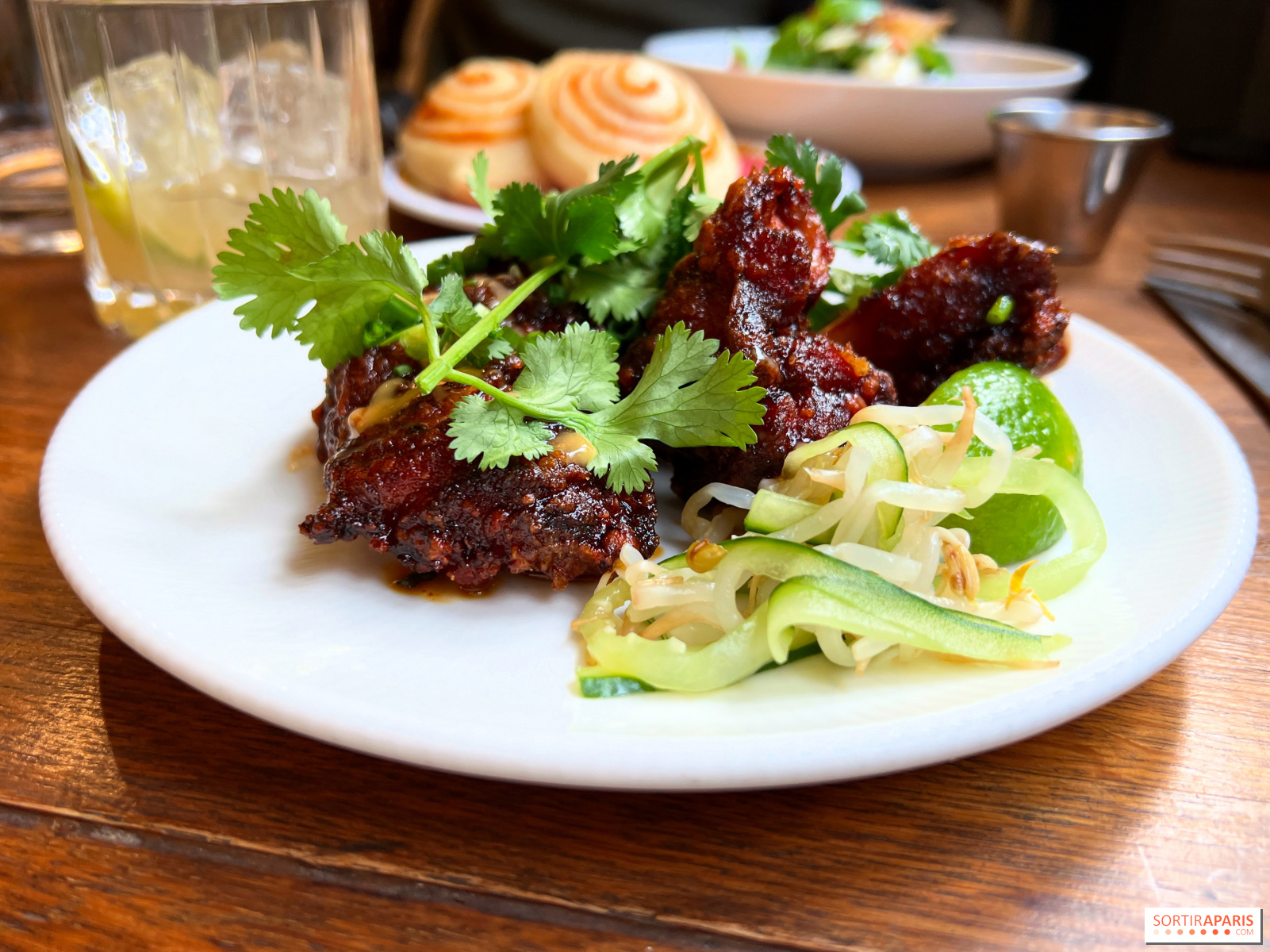 In detail, these include: char siew carrots, scamorza and bergamot sabayon; stunning fried wonton, squash caponata, XO cecina and homemade sriracha; addictive crispy caramelized chicken (you've been warned), beef cheek lacquered with hoisin sauce, celery, grapefruit and medjoul dates ; demonic yuzukosho-lacquered pig sushi (11€), and as side dishes, vegetable oden with spicy miso sauce (a sort of delicate little stew) and steamed satay buns whose recipe we'd gladly steal.