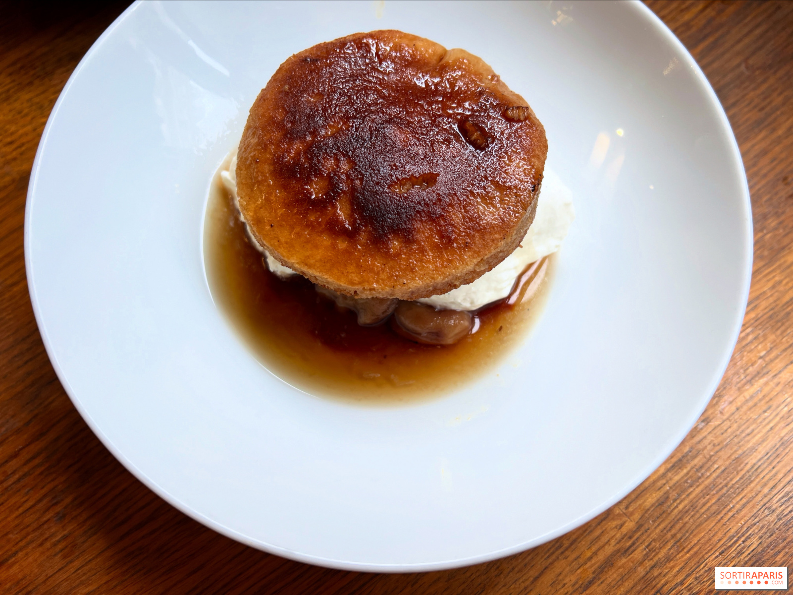 Desserts we were eager to taste, drooling: an indecent brioche perdue (the photo above speaks for itself), caramelized to perfection, with miso caramel and a scoop of vanilla/rice toasted ice cream, and a more delicate but no less enchanting dessert: dorayaki-style pancakes, topped with candied chestnuts, tonka bean chantilly and coffee-whisky syrup. Finger-licking good.