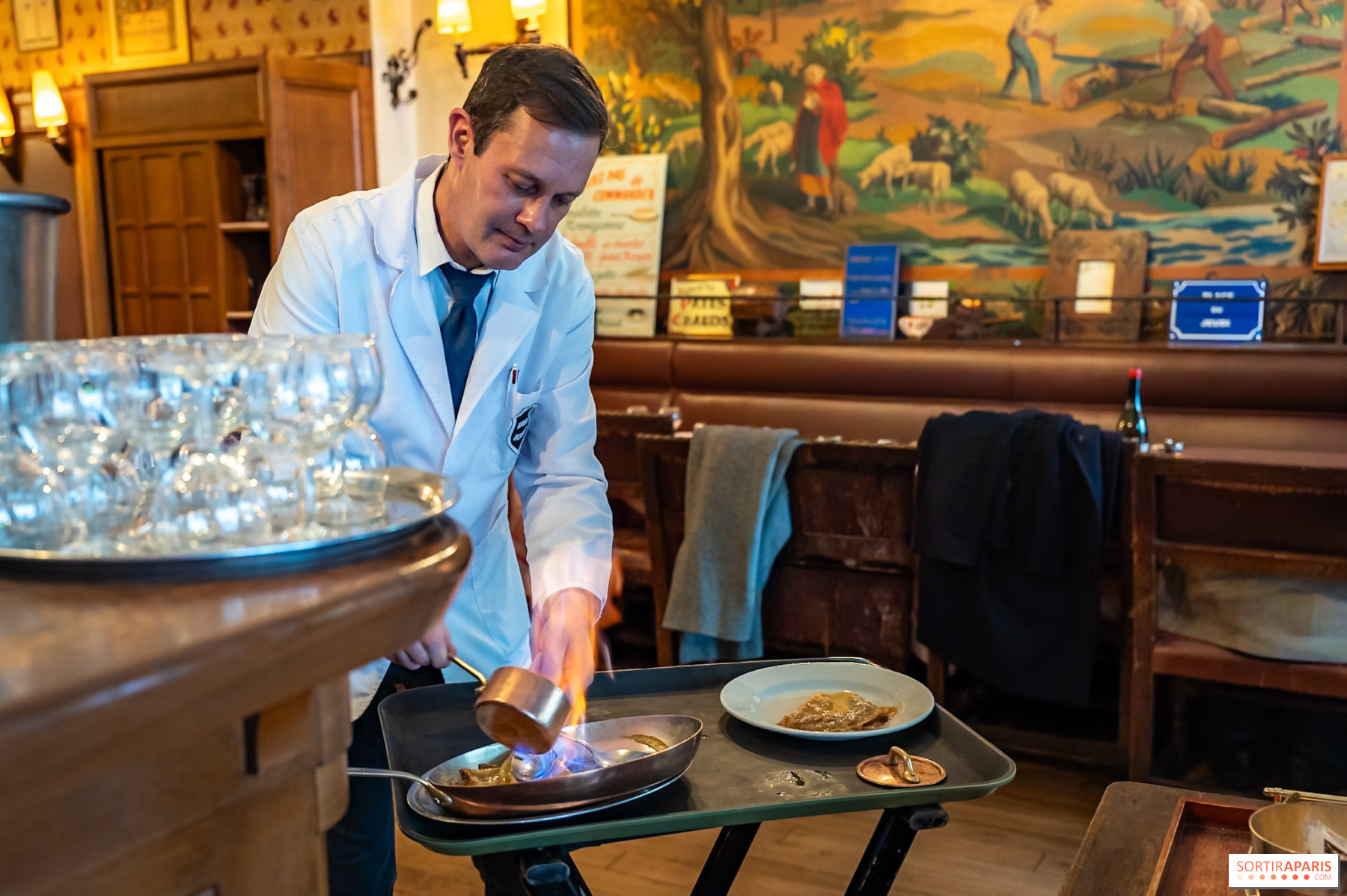 When you step through the door of theAuberge Bressane, expect to take a delicious leap back in time. Old-fashioned posters, coats of arms and maps of France, leather booths and benches, wood panelling on the walls and iron chandeliers on the ceiling... We're plunged into the atmosphere of a traditional inn in the heart of a small French village, and it's not for the faint-hearted.