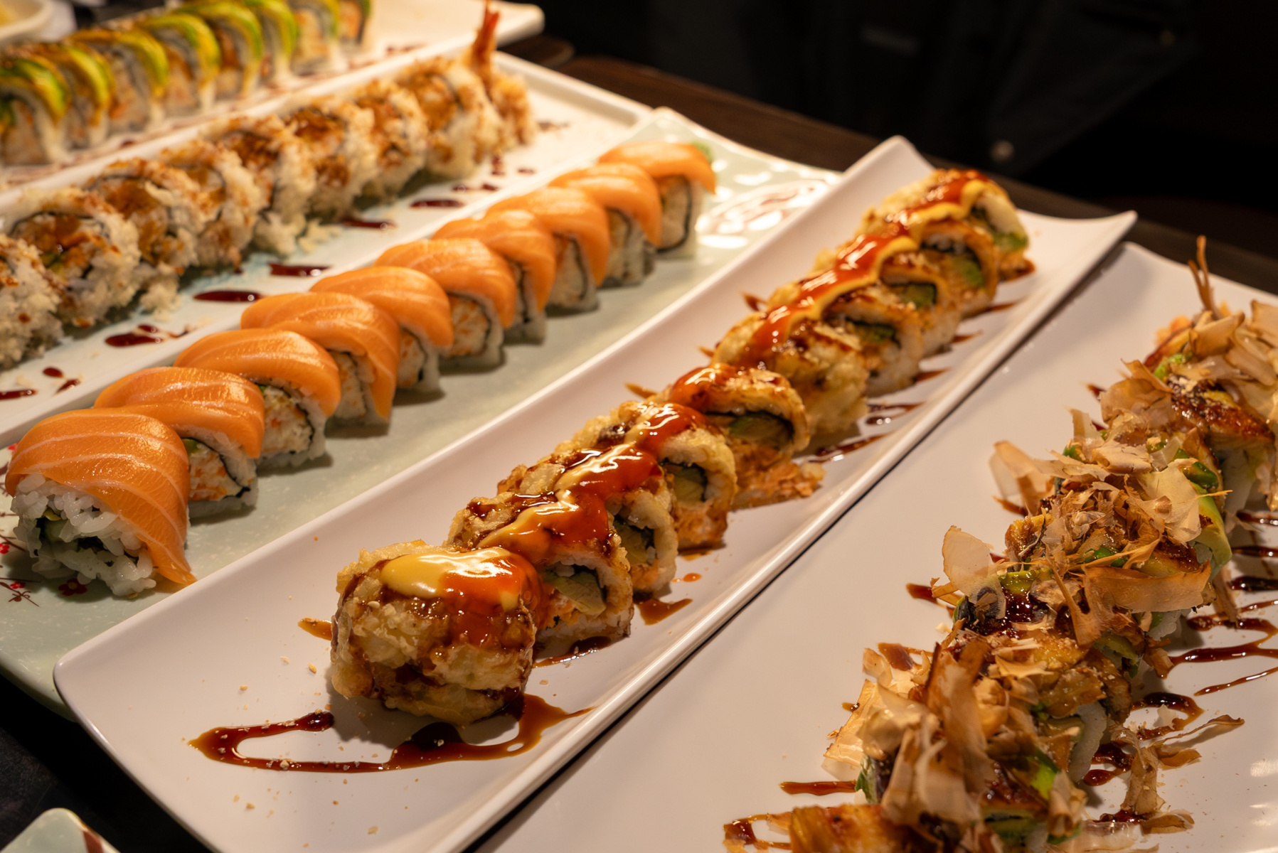 Now, the only thing left is to decide which of the most original dishes on the menu will earn your favor. Personally, we’re going for the grilled eel rolls, the decadent "Green Dragon Roll" (the restaurant doesn’t shy away from such a rare and sought-after ingredient as eel—delicious!). Then there are the shrimp tempura rolls, delightfully crispy; the more classic cream cheese rolls, our guilty pleasure—fresh and flavorful; and finally, the , topped with capelin eggs.