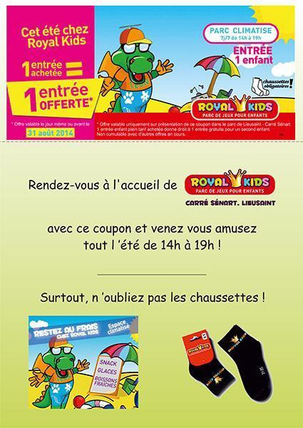 L'offre valable jusqu’au 31 août 2014, uniquement sur présentation du coupon ci-joint dans le parc Royal Kids de Lieusaint - Carré Sénart. Non cumulable avec d’autres offres en cours.