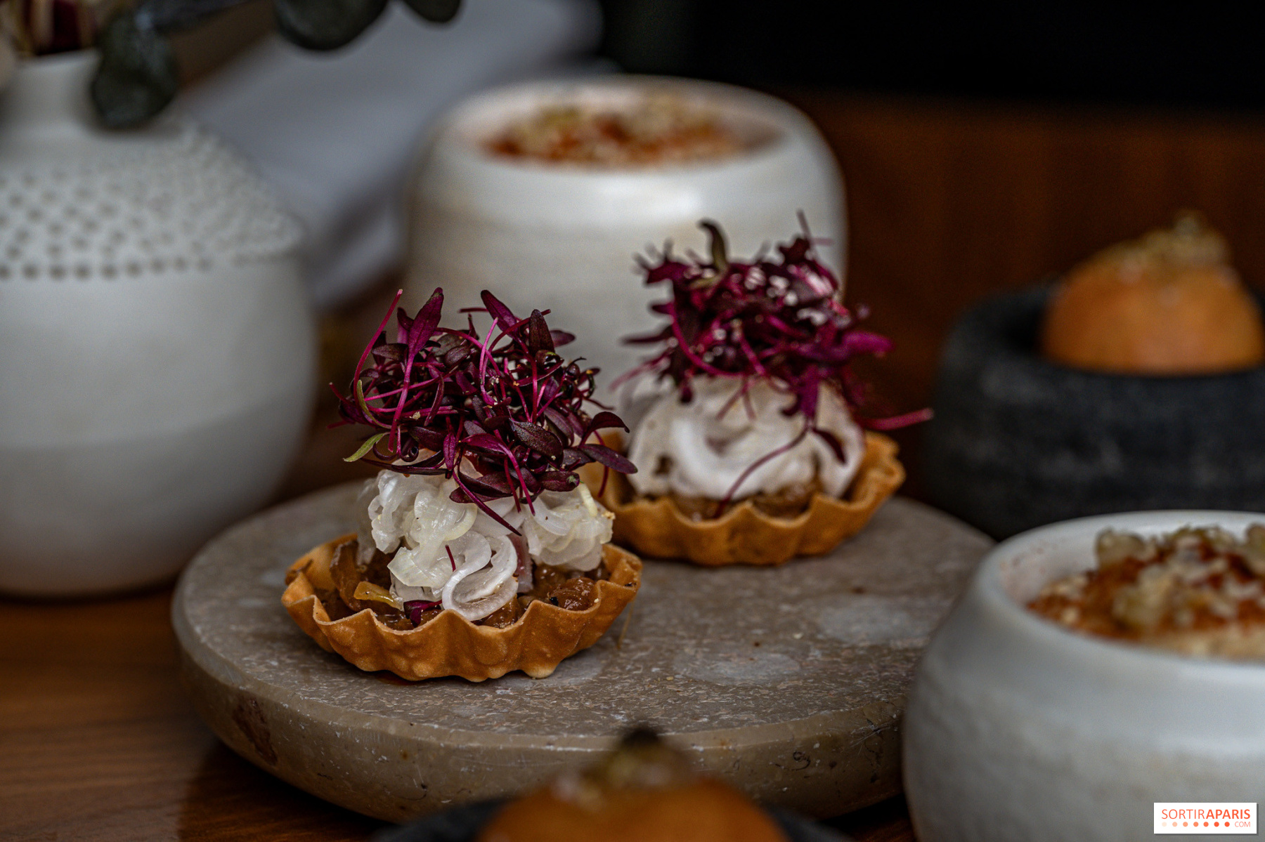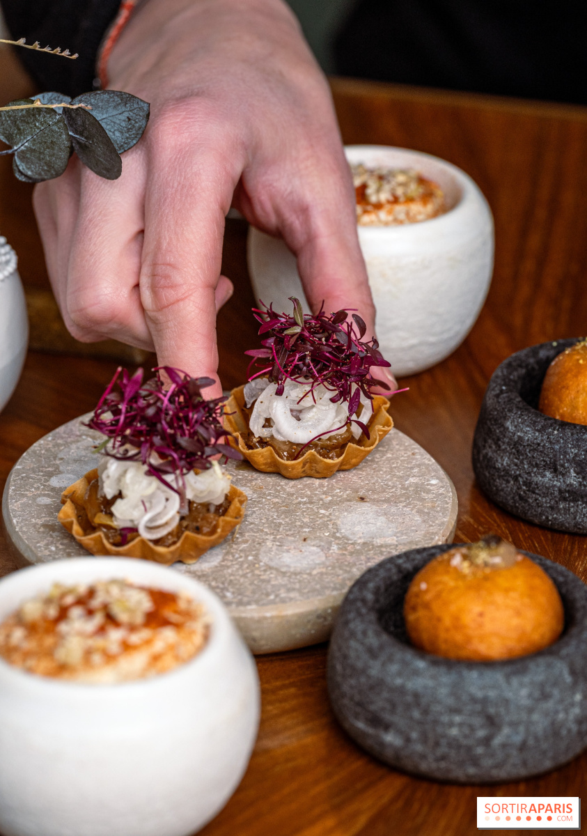 Desde el primer bocado, el tono se establece con una serie de canapés que ya revelan el ojo del chef para los detalles: buñuelos de pechuga de ternera estofada con mayonesa de cebollino, hummus condimentado con ralladura de limón confitada, tartaleta de cebolla caramelizada y anguila ahumada. Nos encantó el crujiente de los garbanzos y la fuerza de la tartaleta, perfectamente realzada por la anchoa.