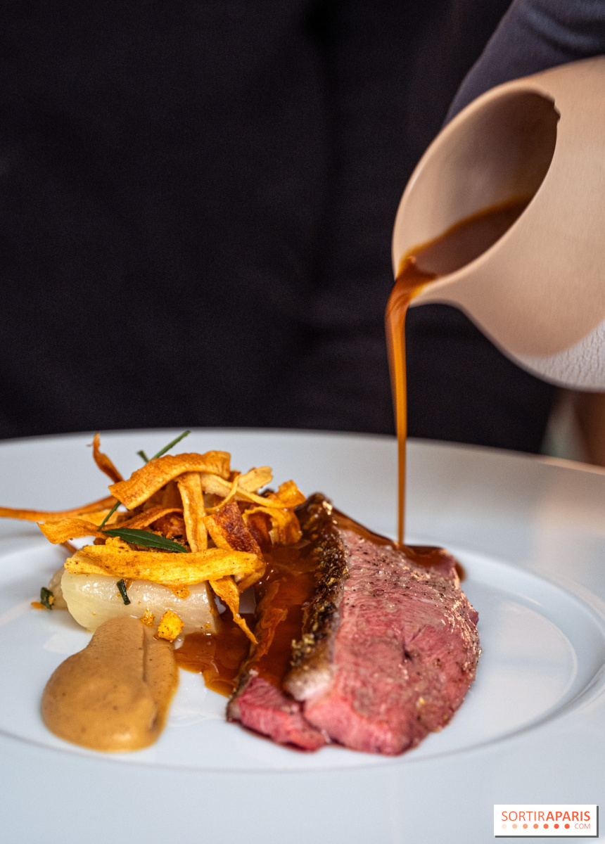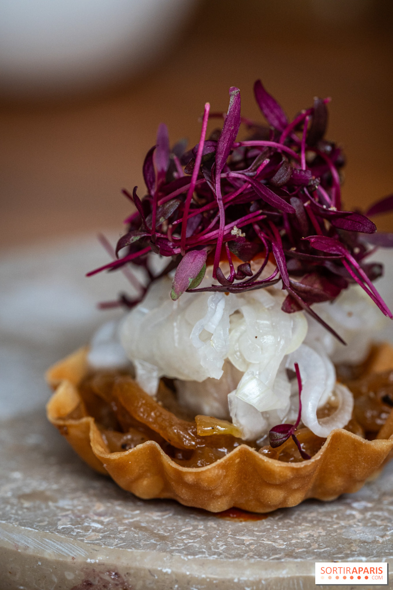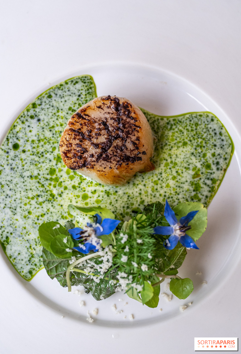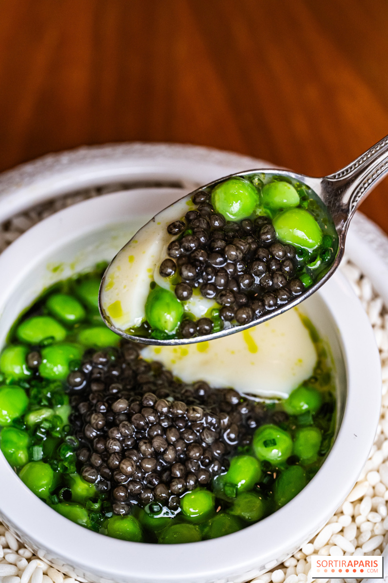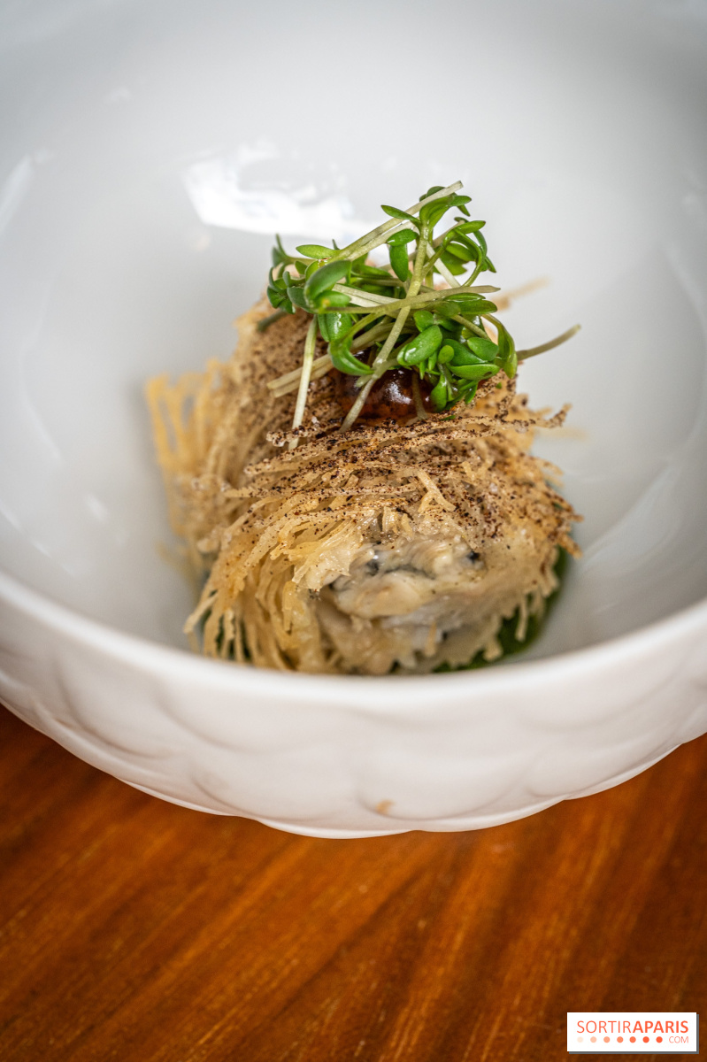 Los entrantes siguen ganando en intensidad: cangrejo desmenuzado con kimchi y velo de pomelo, caviar Baerii de Kasnodar servido con chawanmushi, divinos guisantes frescos y un caldo shimeji, o el tsukuné de ave de Bresse y foie gras , firma del chef, realzado con un condimento de ajo negro y granos de mostaza encurtidos. El efecto general es el de un trabajo en profundidad sobre salsas y condimentos, a veces tomando prestado de las tradiciones coreana y japonesa. Sabores picantes y sencillos, es una delicia.