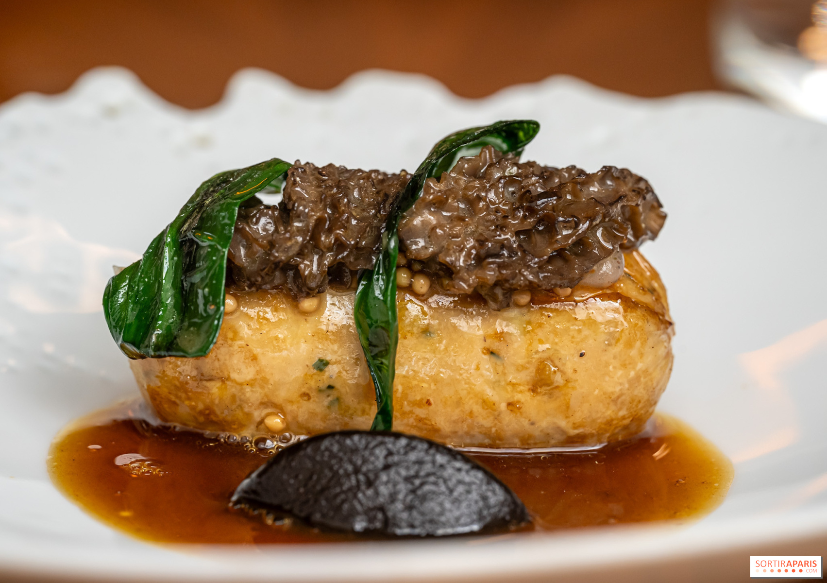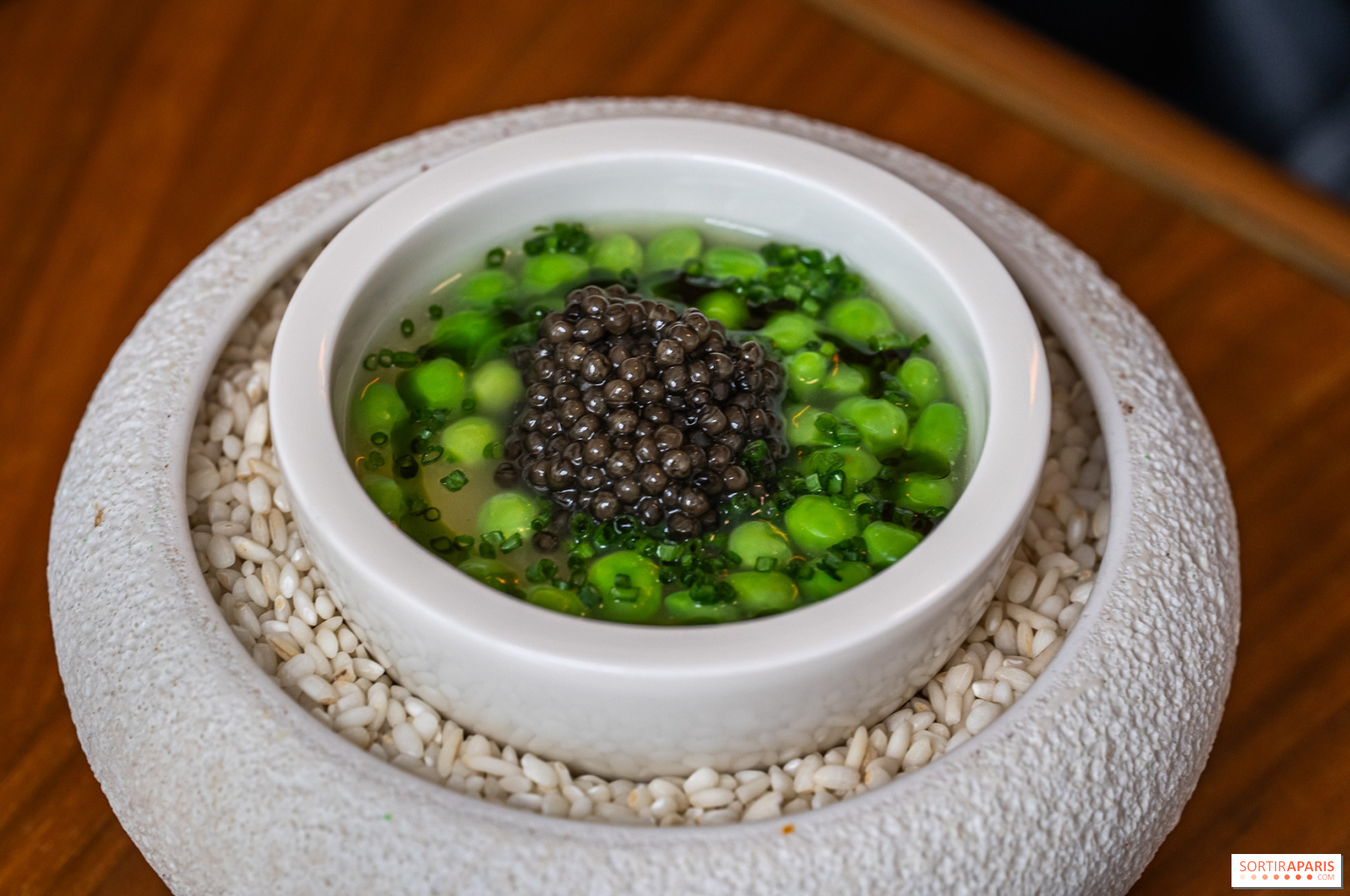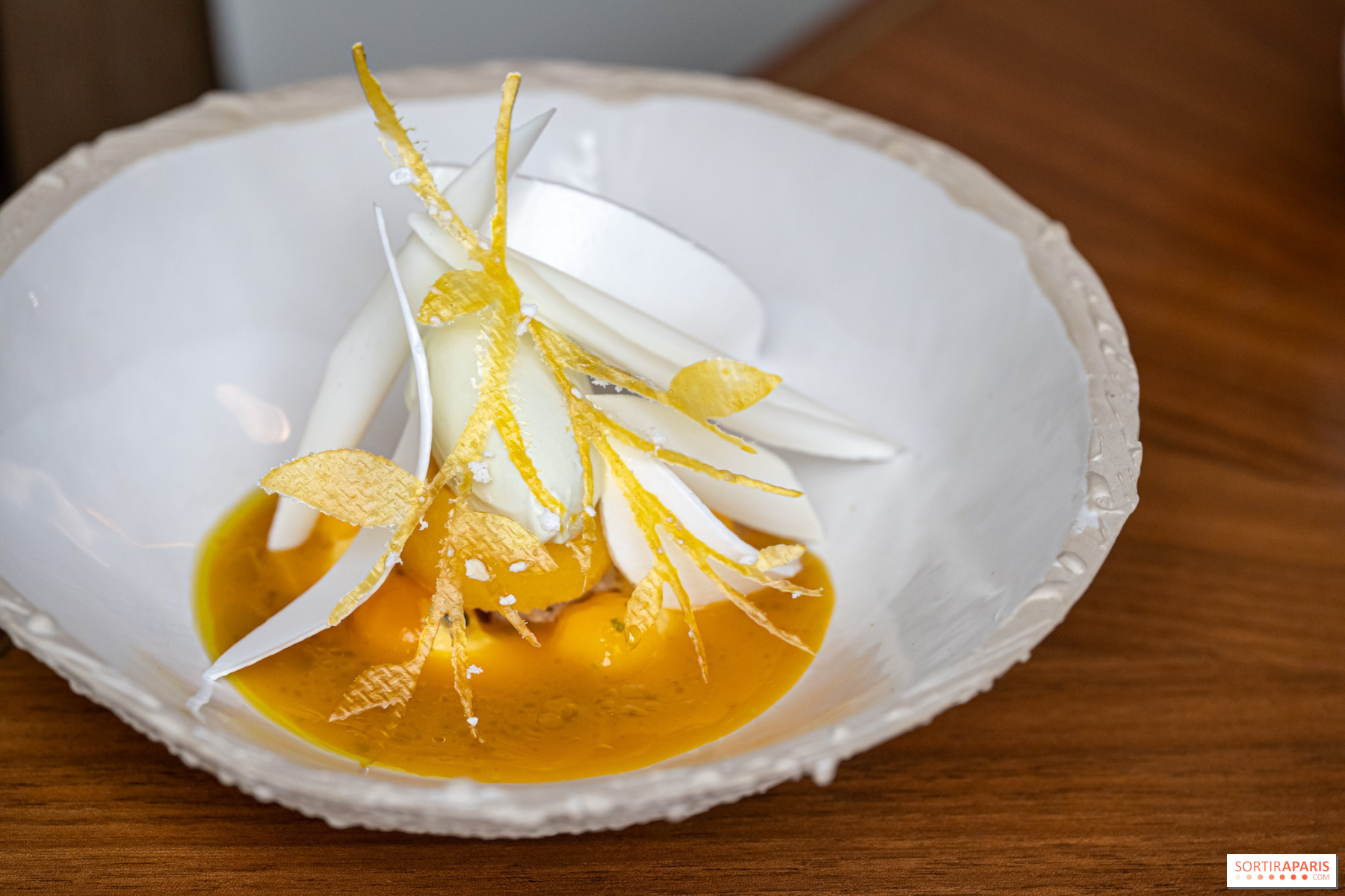 Los entrantes siguen ganando en intensidad: cangrejo desmenuzado con kimchi y velo de pomelo, caviar Baerii de Kasnodar servido con chawanmushi, divinos guisantes frescos y un caldo shimeji, o el tsukuné de ave de Bresse y foie gras , firma del chef, realzado con un condimento de ajo negro y granos de mostaza encurtidos. El efecto general es el de un trabajo en profundidad sobre salsas y condimentos, a veces tomando prestado de las tradiciones coreana y japonesa. Sabores picantes y sencillos, es una delicia.