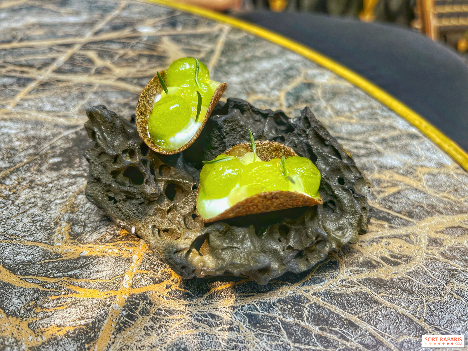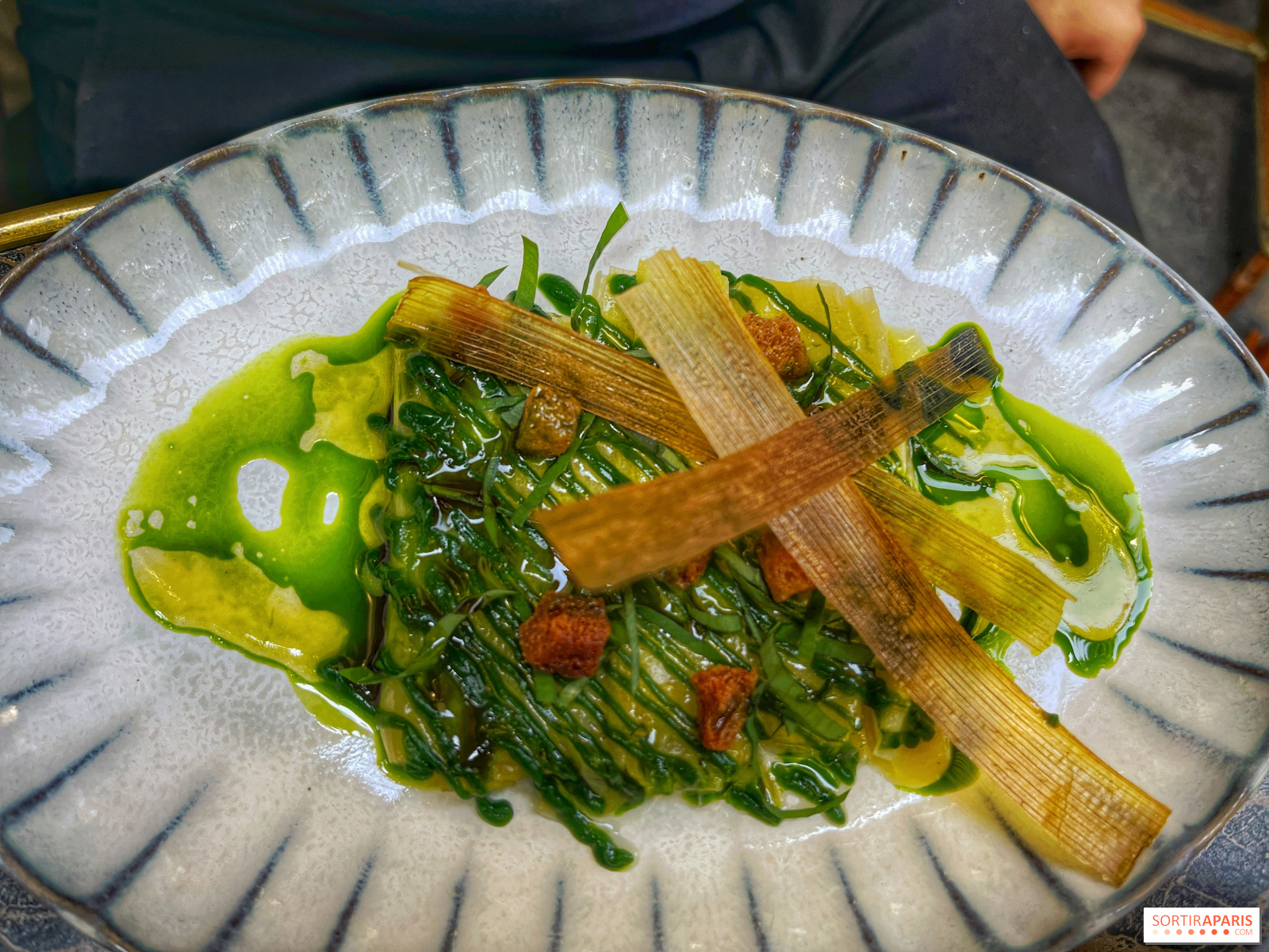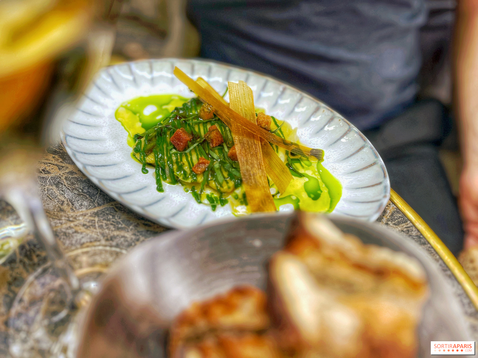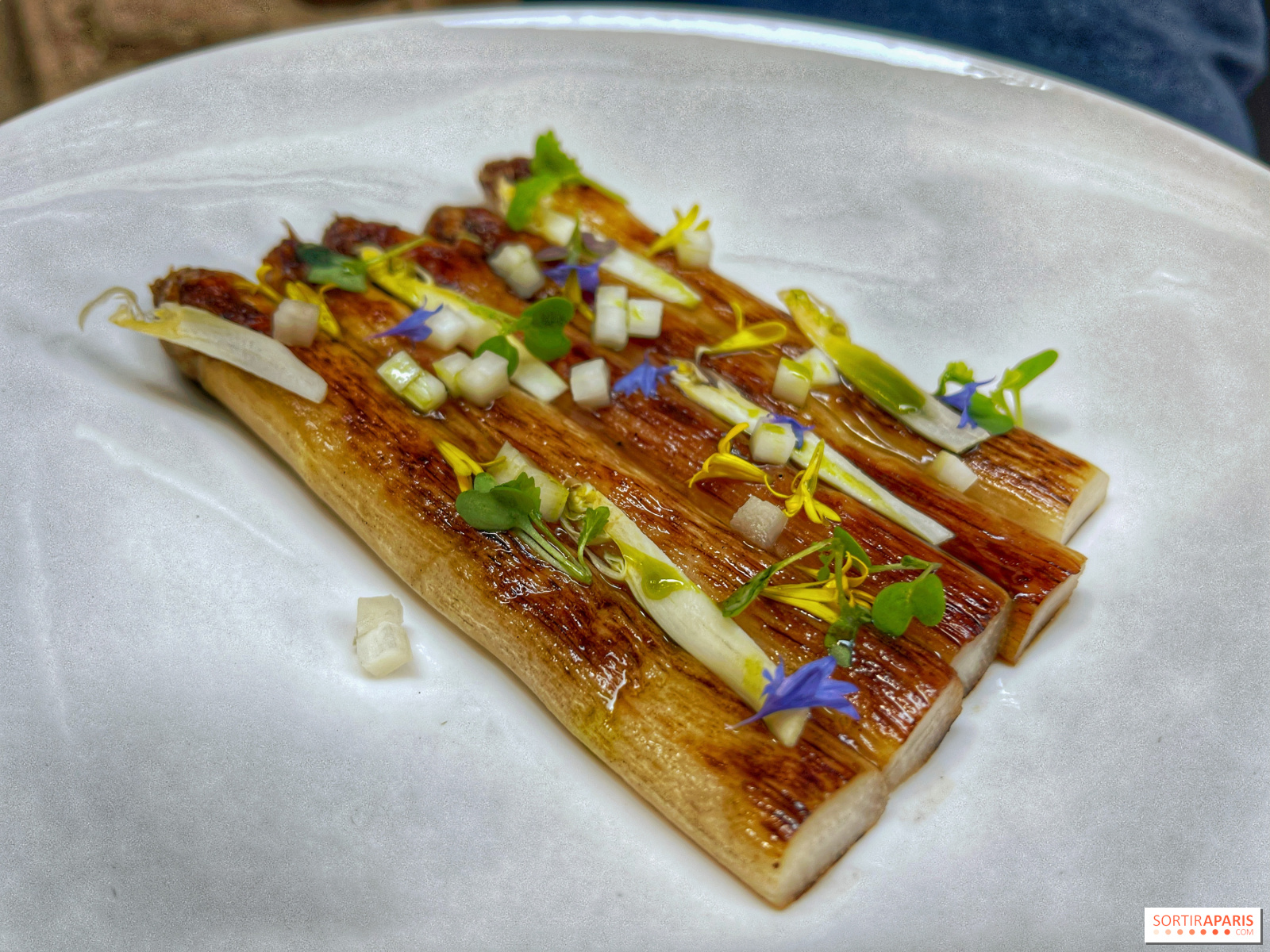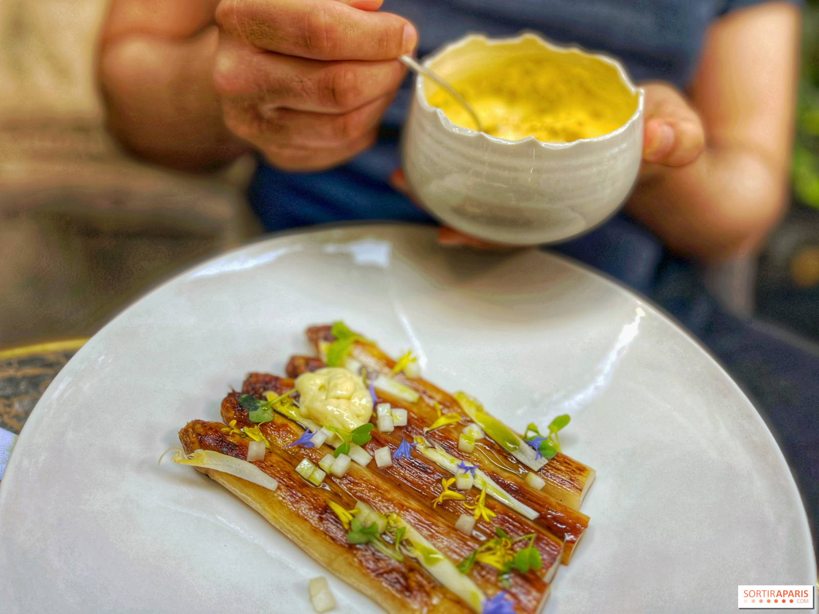 En cuanto a la vinagreta de puerros, es muy perfumada gracias a la omnipresencia del ajo silvestre, con un verdadero carácter poco frecuente en este tipo de productos, más bien insípidos en el día a día. Lo mismo sucede con los espárragos blancos, que se deshacen en la boca y van acompañados de un sabayón delicioso y ligero, una especie de mayonesa de acedera, ¡de la que no quedaba ni una gota!