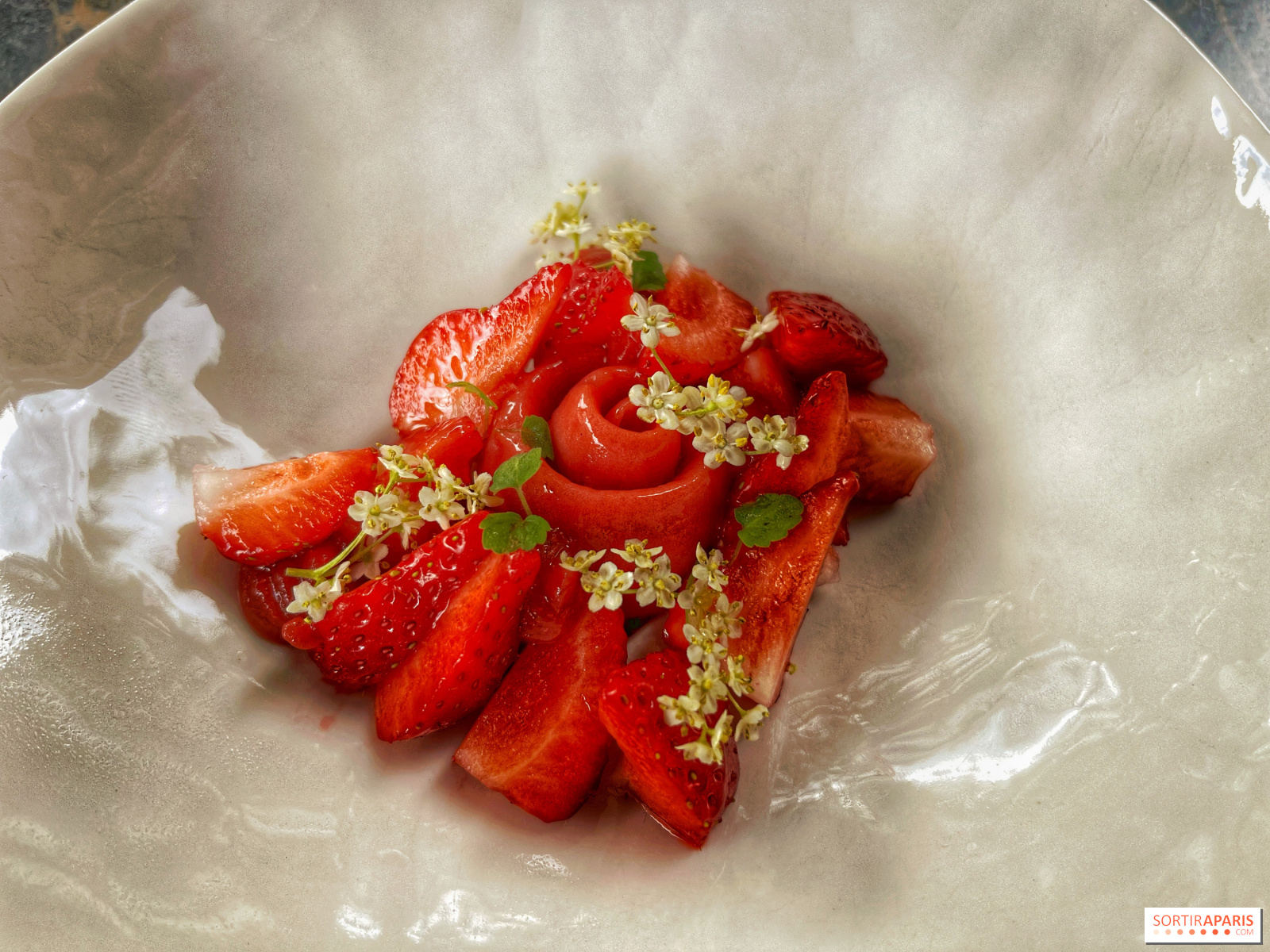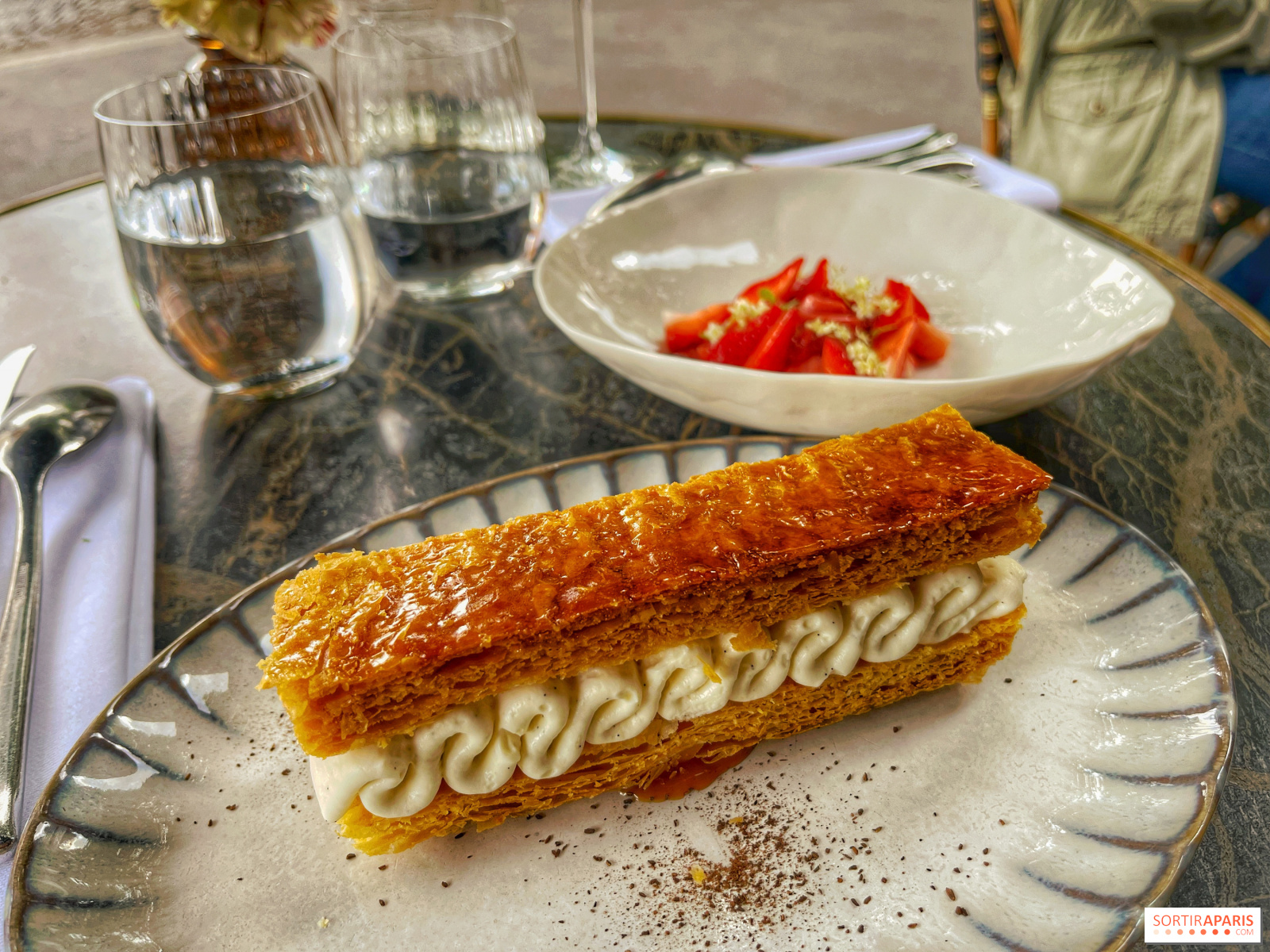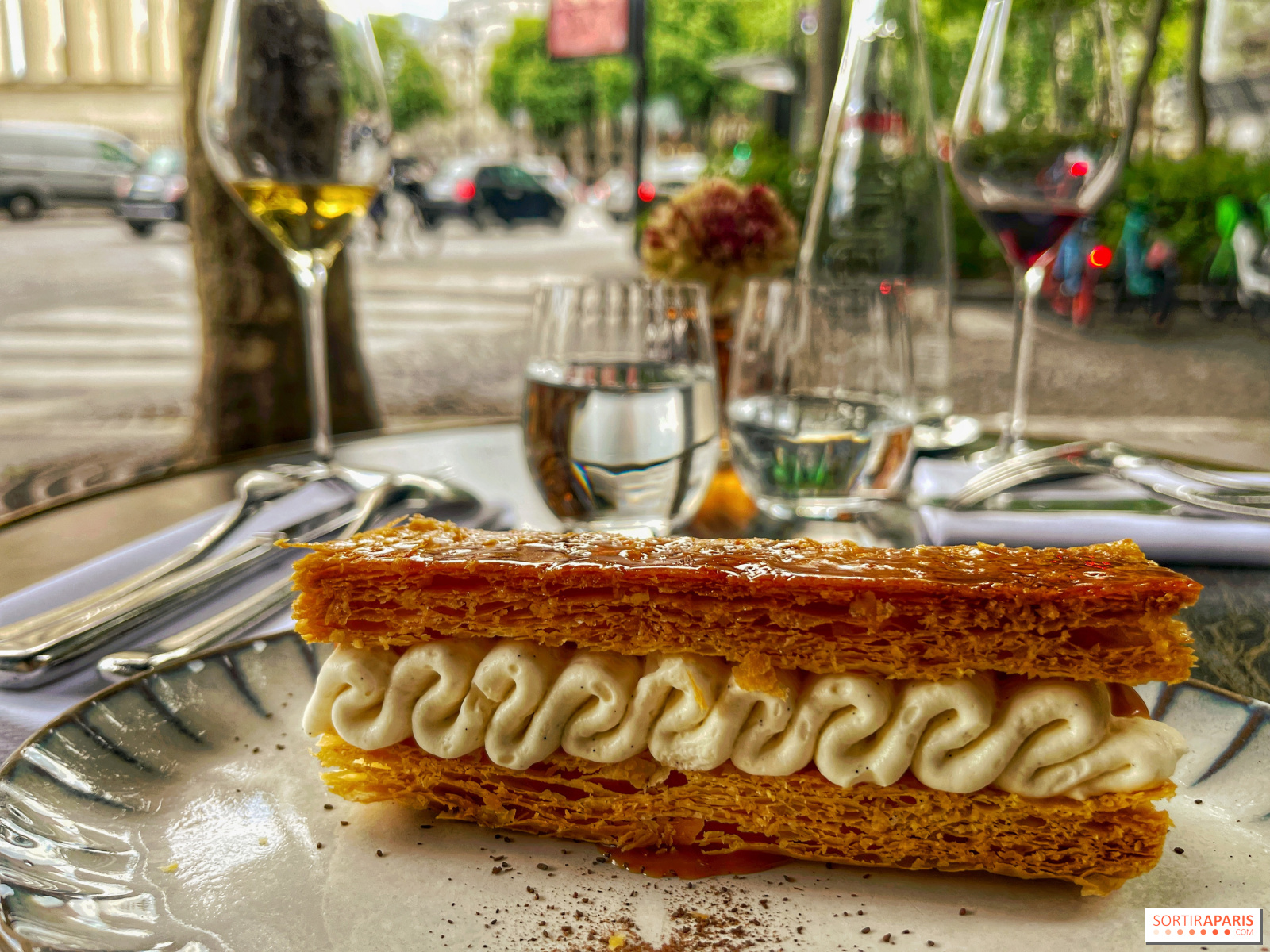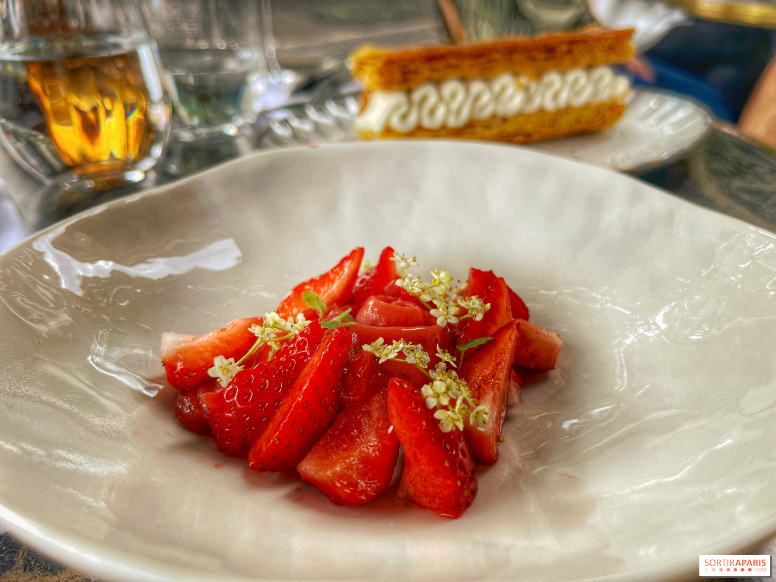 De postre, disfrute de la belleza de la Madeleine, con su combinación de frutas de temporada y delicada bollería. Como soy alérgico a las fresas, el chef ha adaptado y transformado la charlotte de fresas en un pequeño popurrí de fresas Gariguette, que es el final ligero perfecto para la comida, bellamente presentado alrededor de un helado espumoso muy fresco en forma de rosa. En cuanto a la milhojas, que podría calificarse de perfecta, mezcla los sabores de la vainilla y el caramelo en una masa fina y sutil, crujiente sin ser demasiado sólida.
