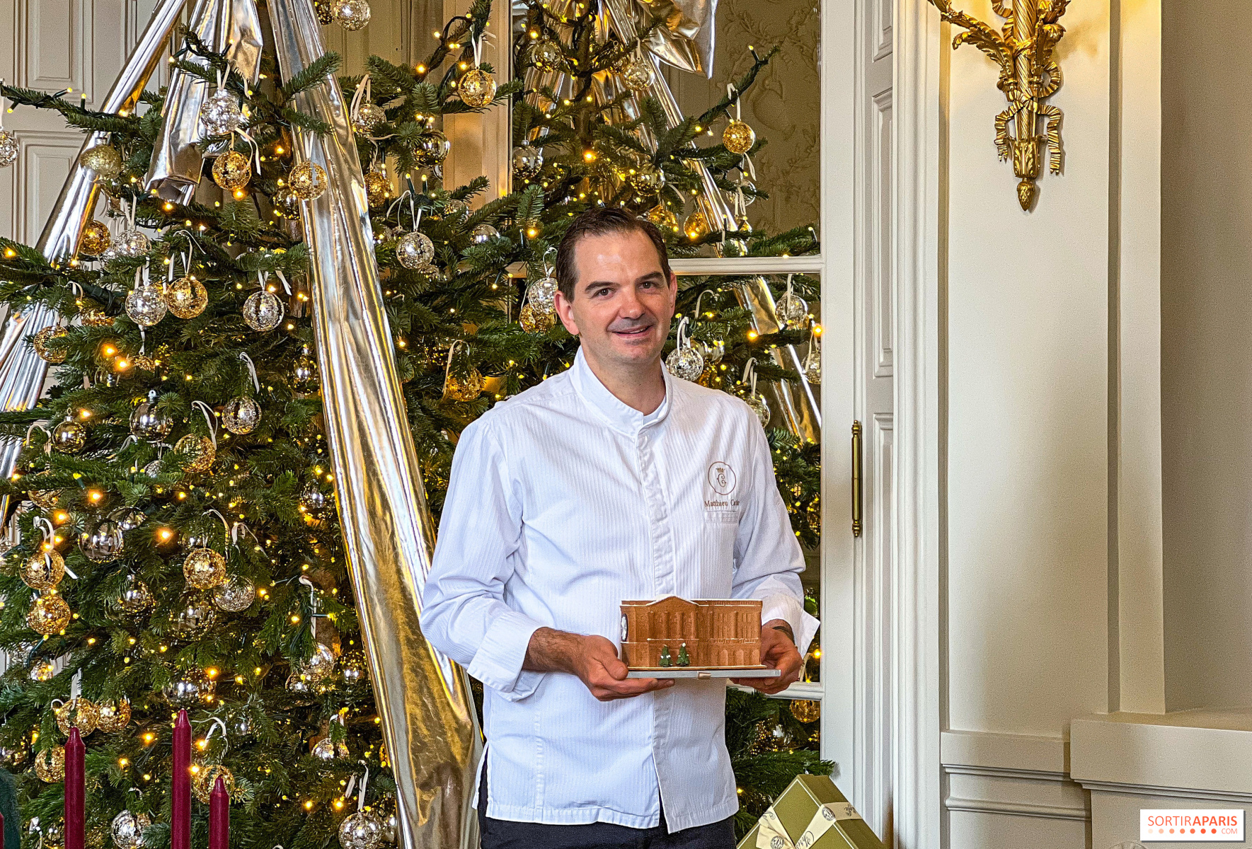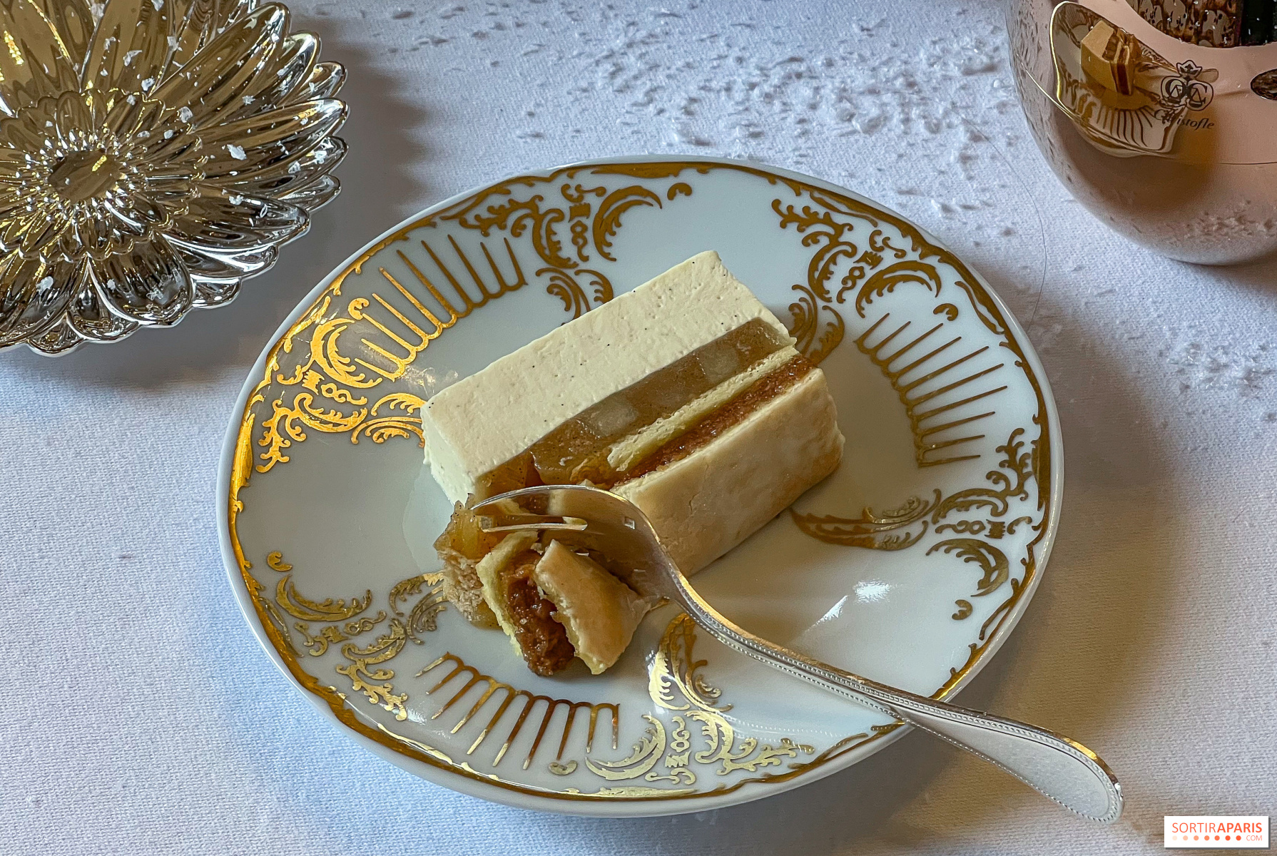 Bajo esta fachada del Crillon reinterpretada en versión dulce, el placer se revela capa a capa. Sumergimos la cuchara en una cremosa mousse de vainilla de Madagascar, seguida de una compota de manzanas salteadas y una esponjosa galleta que encierra un sabroso crujiente de praliné de almendras y speculoos caseros. Una sutil nota especiada que evoca instantáneamente las Navidades de la infancia, mientras que los abetos de chocolate blanco colocados en la entrada añaden un toque de color al conjunto.
