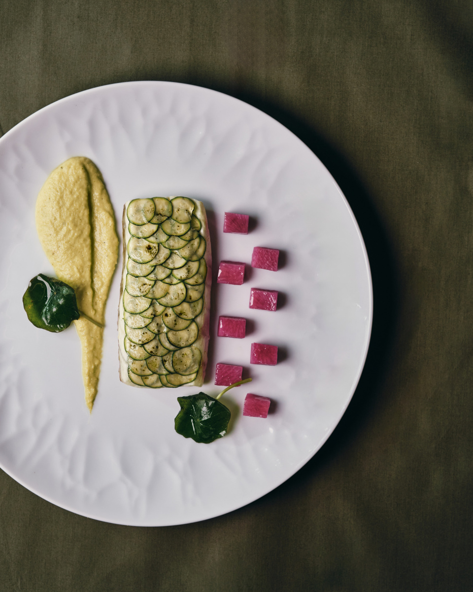 Este plato celebra la delicadeza de los productos del mar con un baved de lubina nacarada, realzado con finas escamas de calabacín, capuchina y un toque vegetal, todo en una propuesta ligera y refinada.