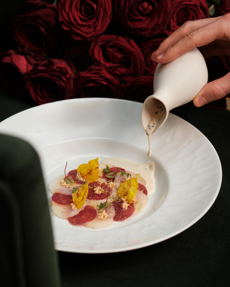 El recorrido comienza con un aperitivo de hígado de pato suavemente preparado, para luego dar paso a un entrante lleno de delicadeza: un carpaccio bicolor de vieiras y remolacha, aderezado con una cremosa salsa de foie y una fina capa de caviar que aporta un toque de sofisticación.