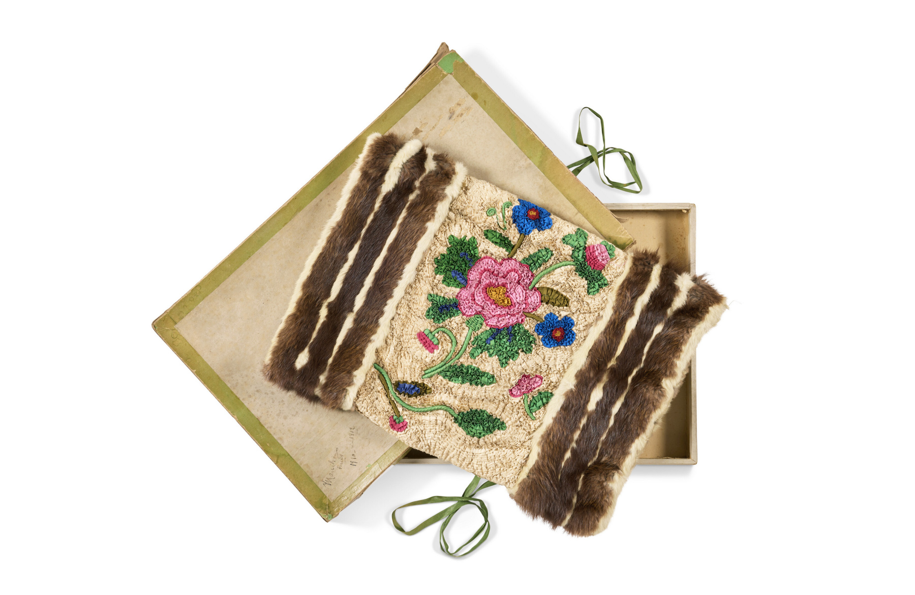 Destaca un manguito bordado firmado por Paul Poiret, regalado a Nicole Corrard con motivo del lanzamiento en 1912 de la revista Modes et Manières d'Aujourd'hui. Conservado en su caja original, adornado con una flor que recuerda a la famosa rosa de Iribe, esta joya textil podría haber sido bordada por el Atelier Martine, fundado por el modisto para trasladar su estética al arte de vivir.