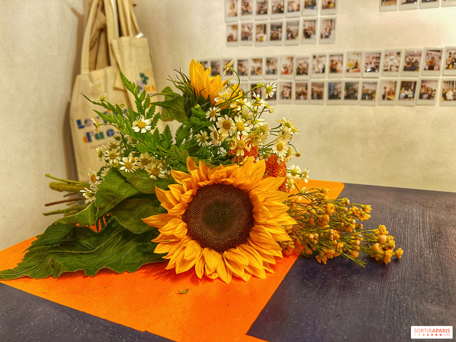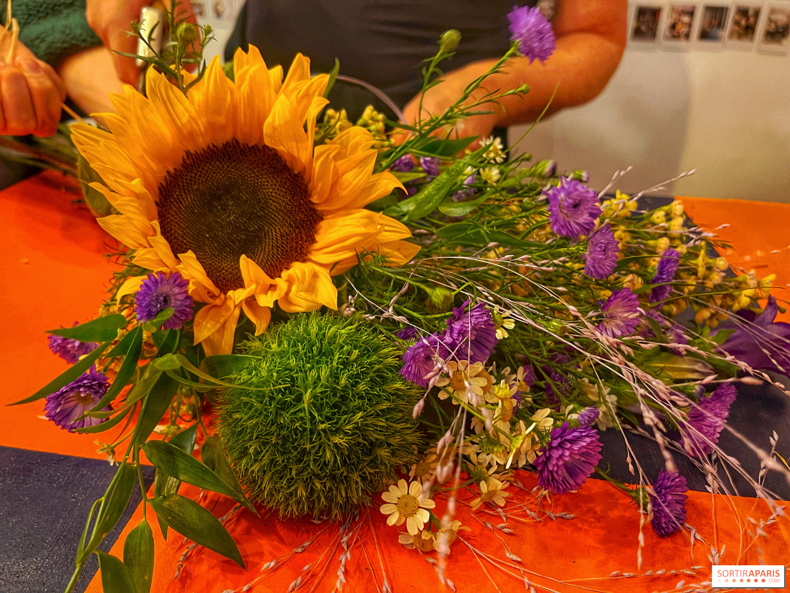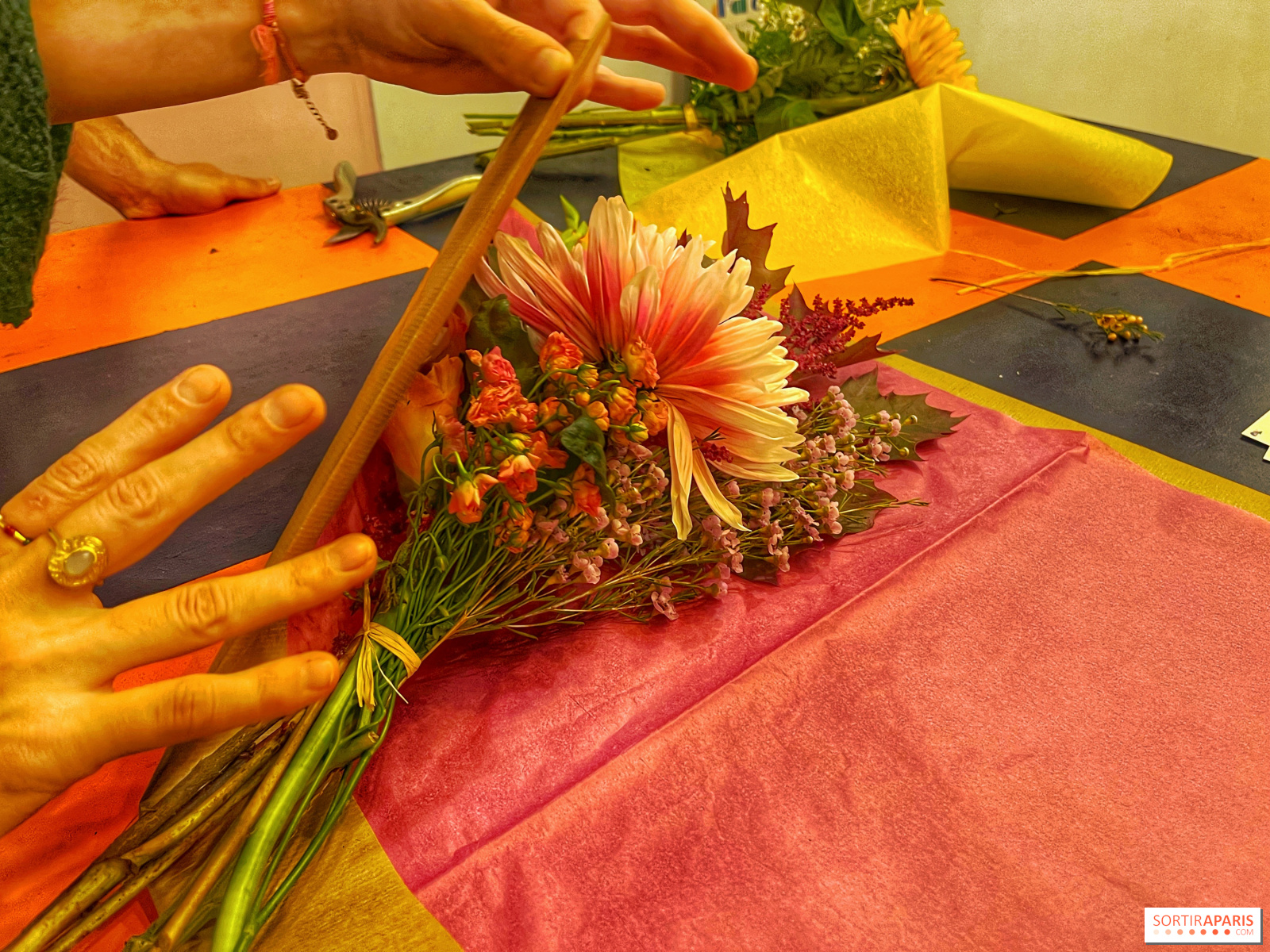 Me teeme varre viilutatud lõike, et lill saaks kergemini vett juua, ja me tasandame kõik, ennekui õpime, kuidas oma kimpu pakendada, et seda saaks Pariisi metroos transportida. See peab olema hästi kaitstud! Me valime oma paberivärvi, enne kui harjutame mäetehnikat, mida Camille demonstreerib humoorikalt, ja läheme koju rõõmuga, et oleme õppinud midagi uut ja jälgime seda oskusteavet kodus paar päeva (ja lilled püsivad kauem, võime teile kinnitada!).