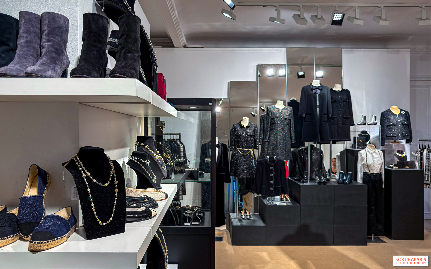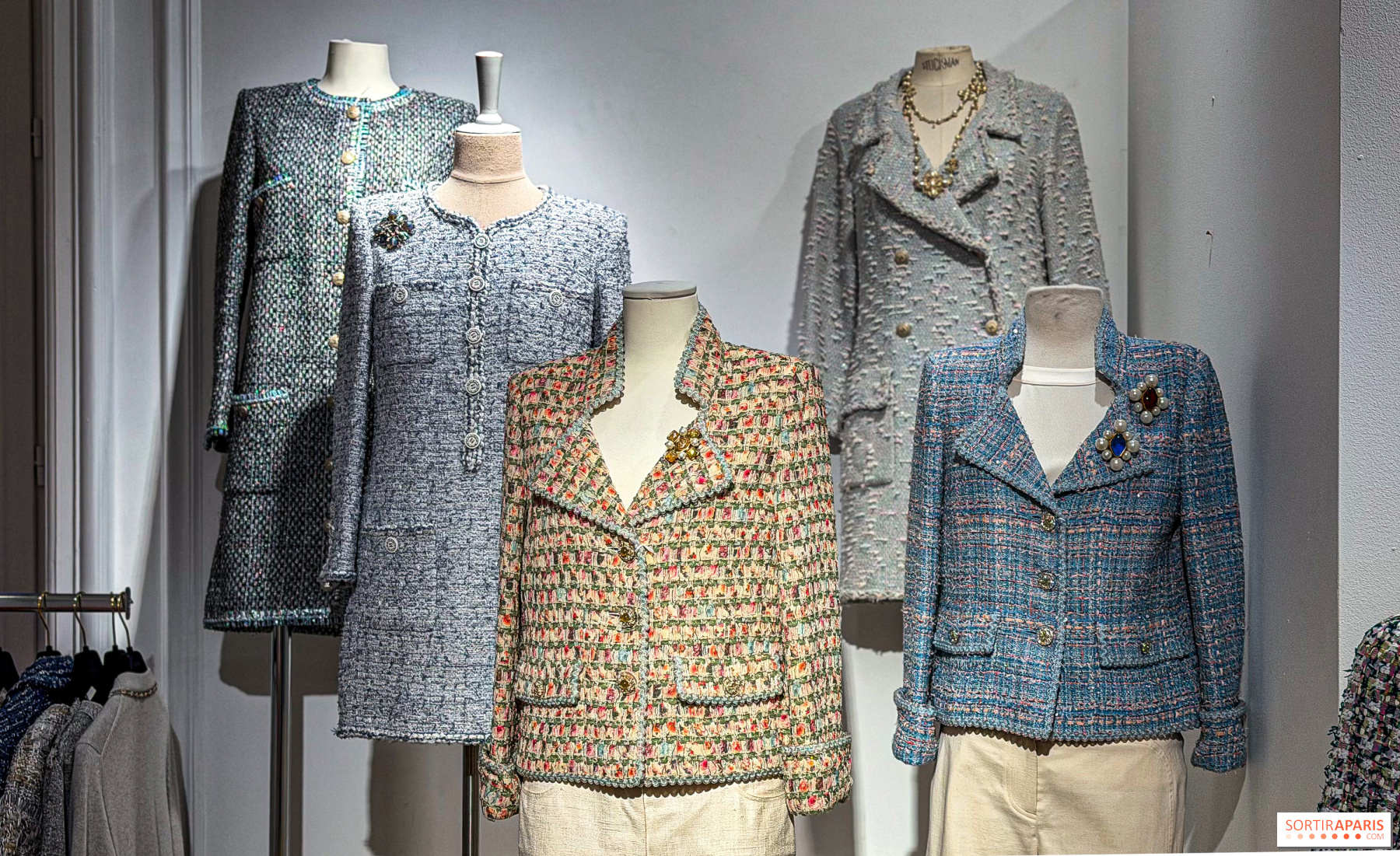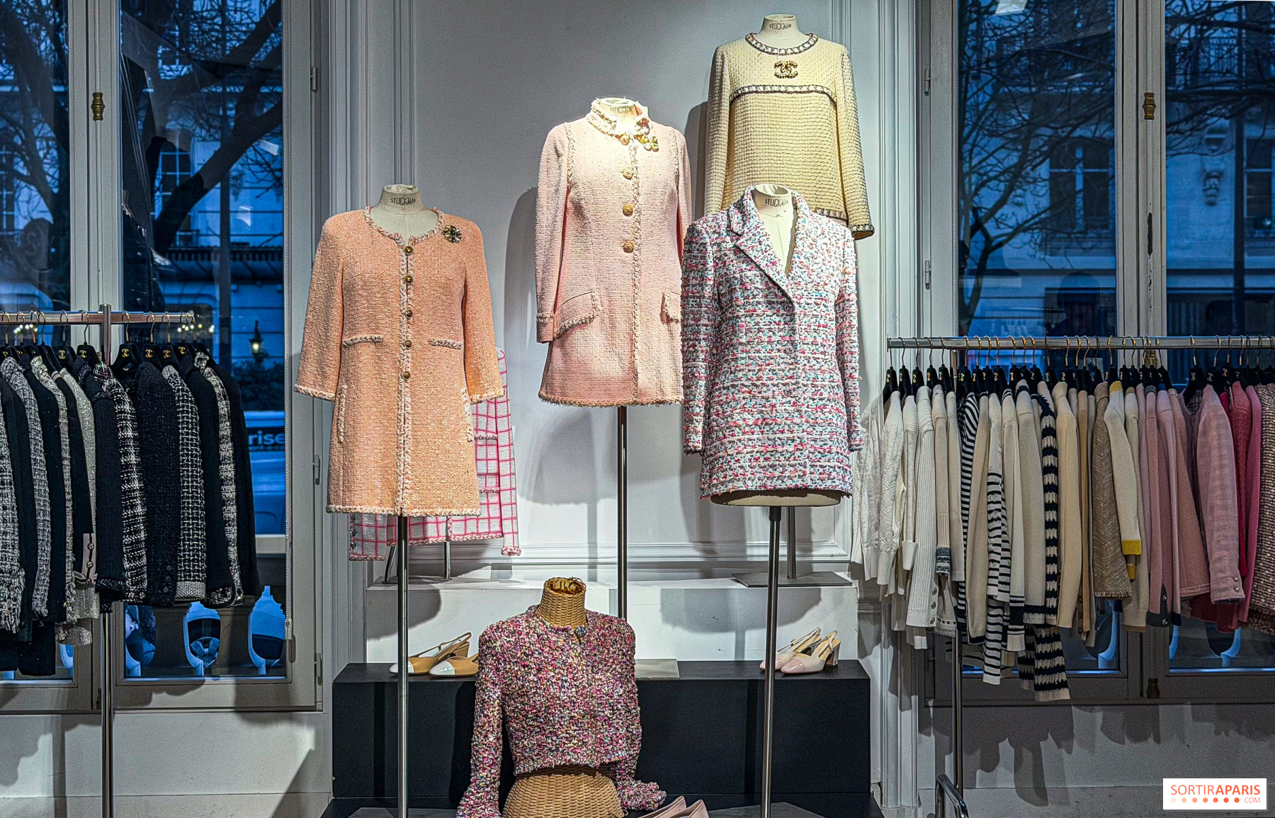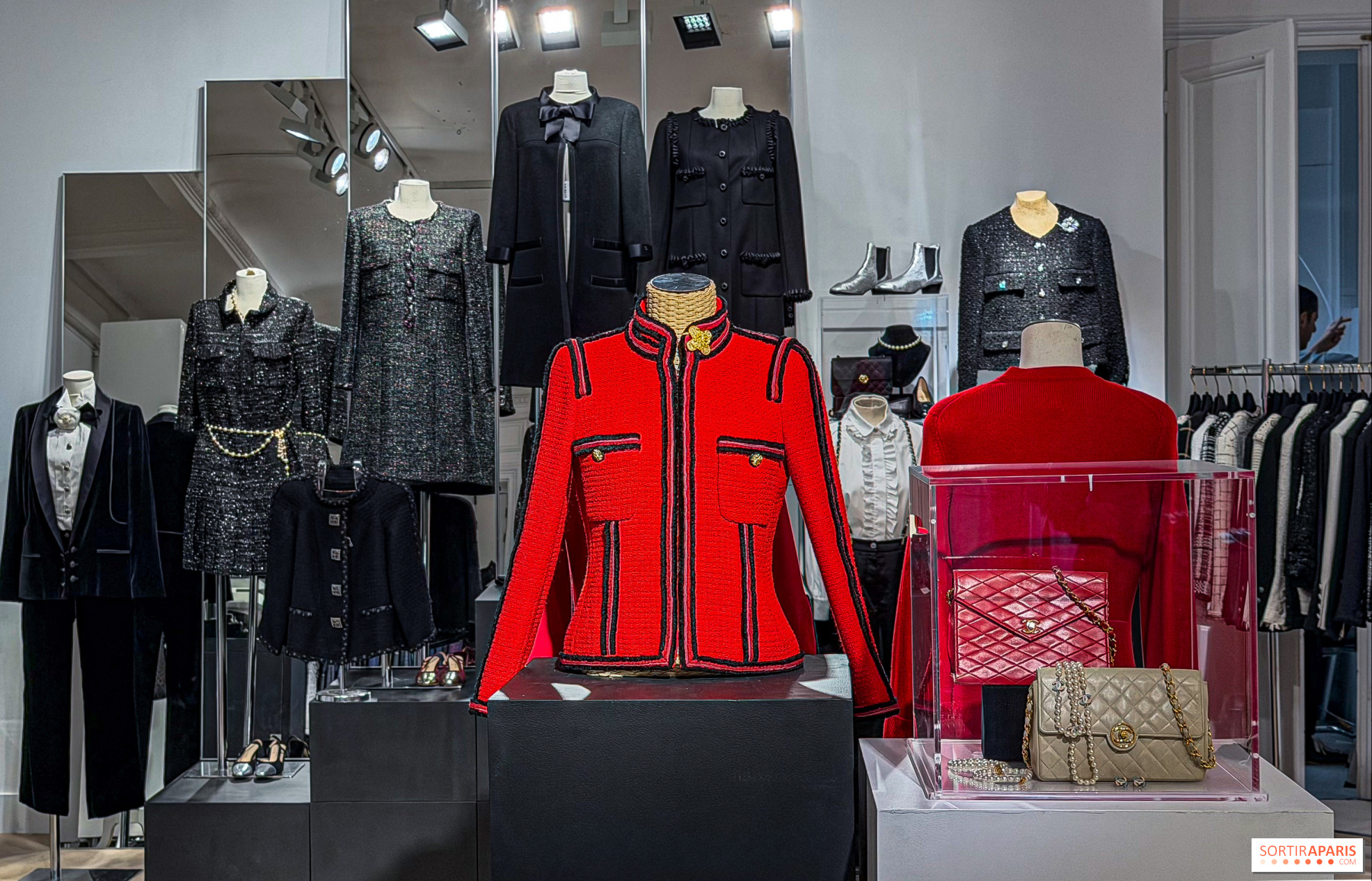 Mannequinien, ripustimilla ja näyttelyikkunoissa on esillä 367 huolella valikoitua kappaletta sesongin, tyylin ja värin mukaan. Tämä poikkeuksellinen muotiarsenaali tarjoaa katsauksen Gabrielle "Coco" Chanelin vuonna 1910 perustaman talon historiaan, jonka nykyisiä luomuksia edustavat Karl Lagerfeldin ja Virginie Viardin suunnittelemat mallistot. Mukana on: 130 takkia, pukuja ja päällystakkeja, 70 kasmirneuletta, 80 korua ja korujat. Lisänä ovat myös Première Mini -kellot, Ultra-rusukorut, käsilaukut, ballerinat ja sandaalit.