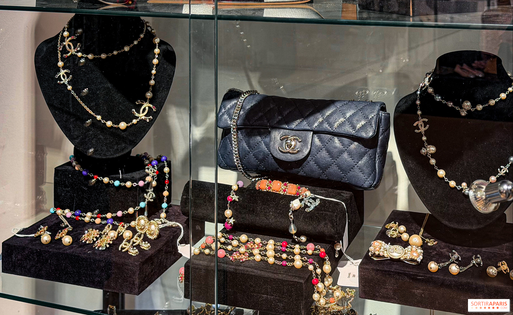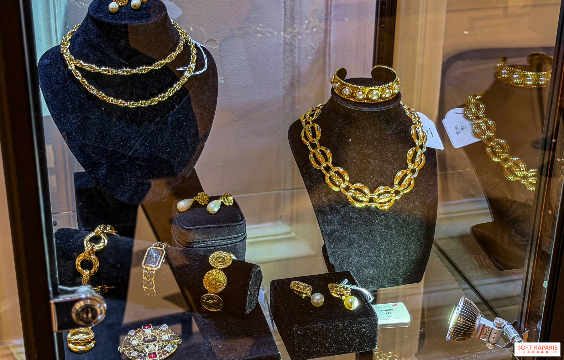 Lisävarusteiden joukosta löytyy 1996–2012 vuosilta peräisin olevia koruja, kuten helmihakuisia ketjuja, rintaneuloja ja helmitä muistuttavia koristeita, joita on valmistettu metallista, samppanjaväristä metallista ja lasimassasta. Ennen myyntiä avoinna oleva näyttely paljastaa tyylin Chanel -mestarin taidokkaan käsityön ja tyylin yksityiskohdat: se on nähtävissä ja tutkittavissa ennen kuin nostaa käden pystyyn.