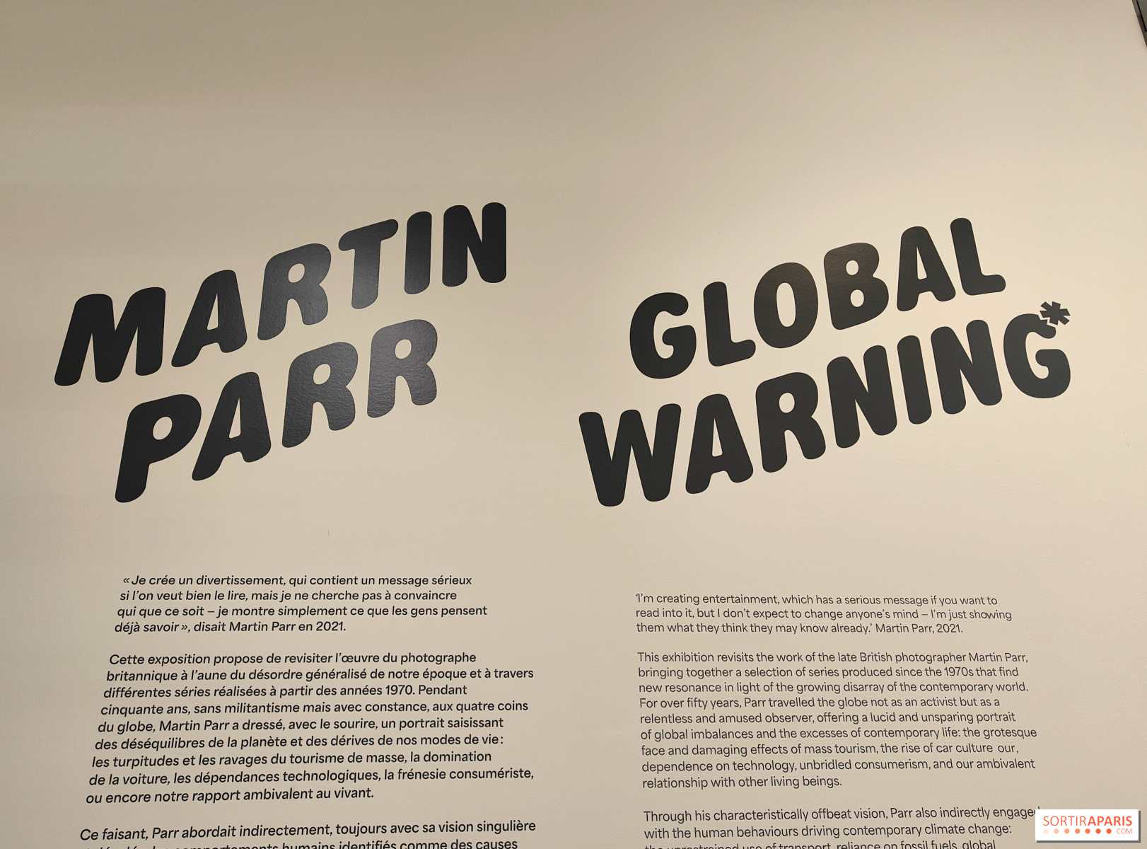 התערוכה, הנקראת אזהרה עולמית, מתמקדת בנושאים המרכזיים בעבודתו של מרטין פאר: האמן מדגיש את הפגיעות והסטיות של החברה שלנו, את האי-שוויון החברתי והנזק הסביבתי שנוצרים משיטות החיים שלנו, מ-1970 ועד היום.