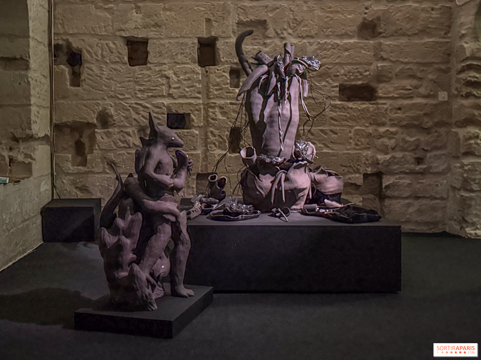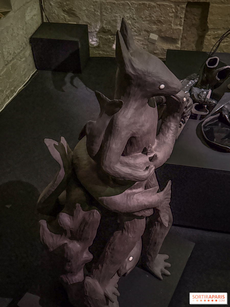 כאן, המבקר עובר בתוך תערוכה שבה הדגשים הם על גוונים כהים, מרקמים צפופים והקשרים היברידיים. השחור, שנמצא בכל מקום, אינו מטופל כסוג של אפיזודה ויזואלית בלבד: הוא פועל כחומר עצמאי, המשרה אווירה, שקט ופעילות. המסע כולל בין היתר יצירות כמו יציאת מצרים, שמאזנת בין סיפור דתי, מצב נשים וסצנה אחרי אפוקליפסה, אנחיתאנור, מחשבה סביב דמות של גוף-מעיין המשולבת עם אזכור מיתולוגי פרסי ודימוי אלכימי, זינר, פסל ענק הקשור במאבקים של נשים, ו-אירוסארביינוס, התקנה משולבת סיליקון, קרמיקה, תכנות ותנועה. בתוך קבוצה זו, הגוף הופך לנוף, למכונה, לזיכרון או לפני השטח של התנגדות, מבלי שתמיד יוגבל להבנה אחת בלבד.