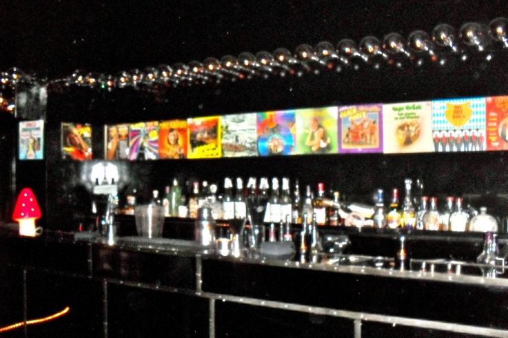 Des pochettes colorées de vieux 33 tours pop décorent le mur. Je reconnais pas mal de ces vieux tubes en fond sonore.