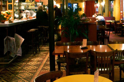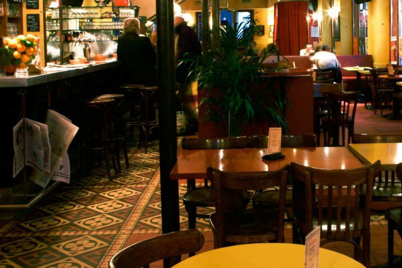 sur deux niveaux. Comprenant une grande salle de 28 tables avec ses grandes fenêtres, son style hétéroclite, ses boiseries, ses plantes vertes. Un grand bar de 8 mètres de long recouvert de zinc, tabourets hauts, casiers en bois; dans le plus pur style rétro, où l'on s'agglutine pour le premier ou dernier verre, c'est selon en grignotant quelques-unes de ses légendaire cacahuètes.