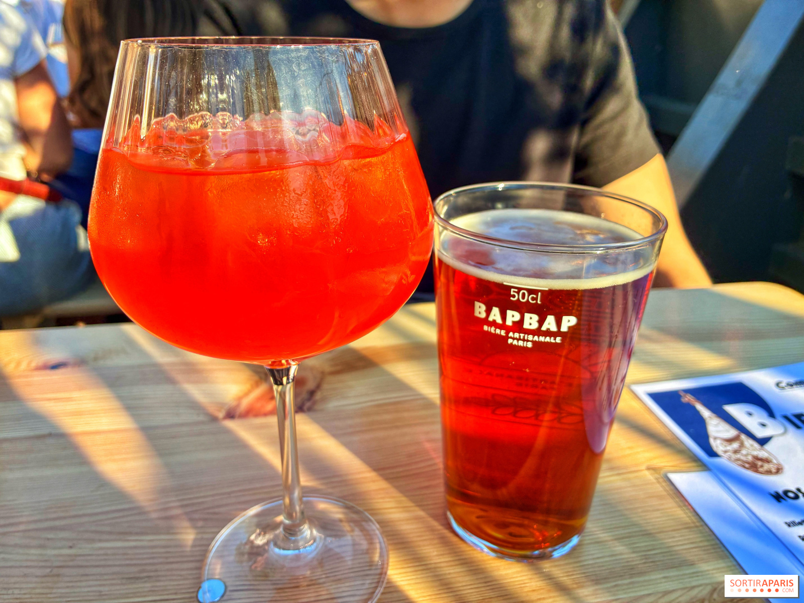 Côté prix, on a connu pire, surtout sur les quais de Seine ! Comptez entre 6,5 et 8 euros pour une pinte de bière, 6 euros pour un verre de vin, et entre 9 et 14 euros pour un cocktail, avec du sans alcool disponible. Nous avons opté pour un mocktail, le JNPR, à base de pêche, de citron et d'eau pétillante, très frais et rafraichissant sous ce soleil de printemps et pour une bière, brassée artisanalement en Ile-de-France chez BapBap.