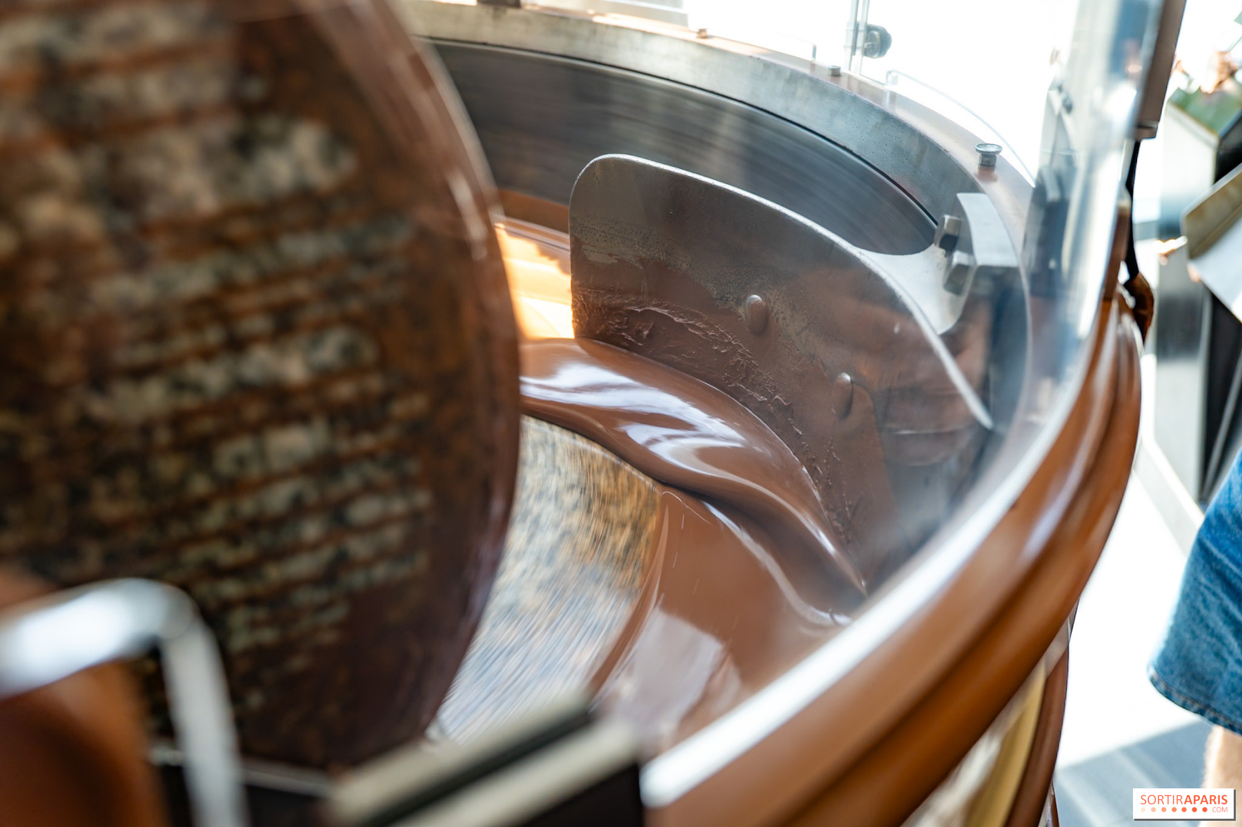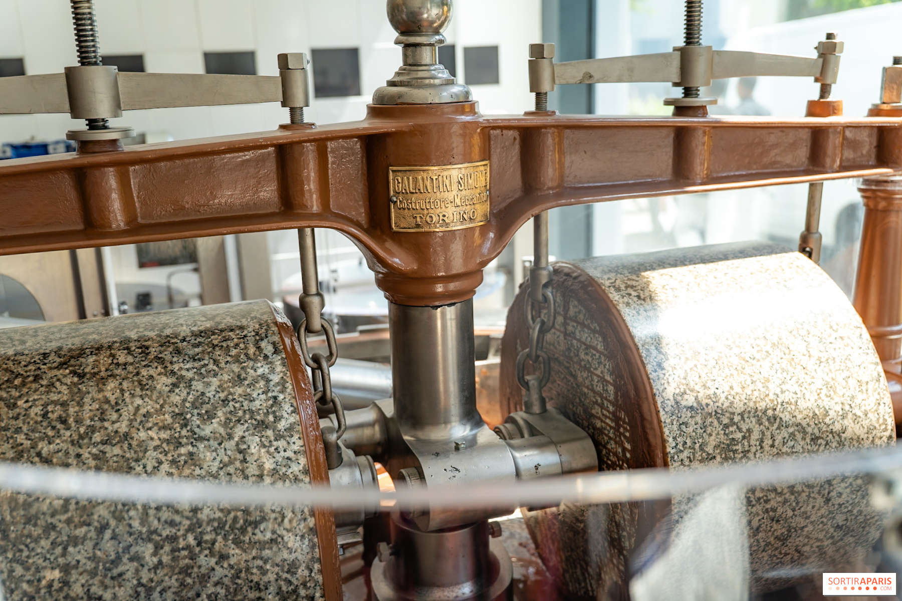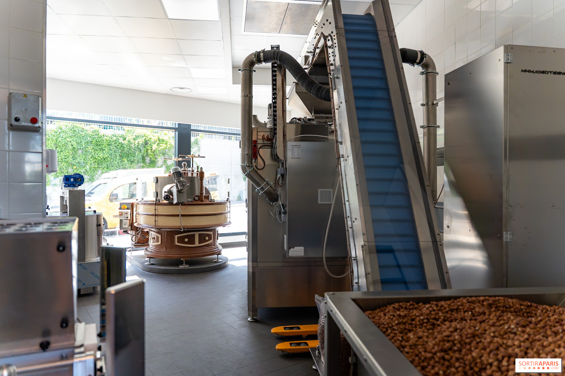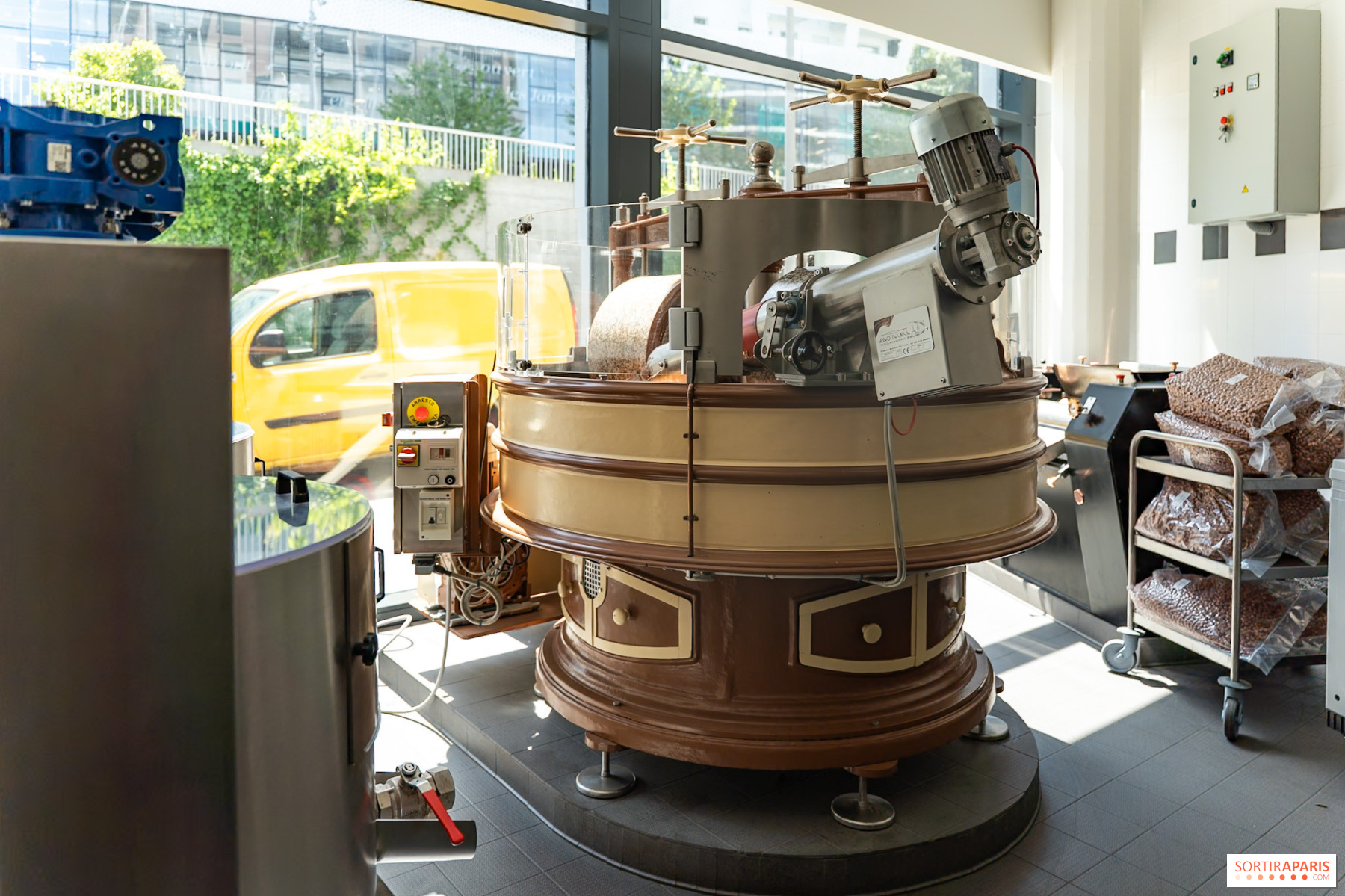 À l'intérieur, on découvre un espace lumineux, chaleureux, où se mêlent marbre, bois clairs et mosaïques aux tons vert clair, pensé avec soin pour valoriser le savoir-faire artisanal. Sous les effluves de noisettes torréfiées et de pralinés, on découvre une meule centenaire en provenance de Turin qui a nécessité bien des aménagements pour être installée, un chaudron en cuivre pour caraméliser les noisettes, ou encore des turbines pour les enrober de chocolat en mode fabrication à l'ancienne, mêlée à la modernité de l'équipement. À l'image de l'un de ses mentors, Nicolas Berger, Maxime Frédéric mets en avant ces machines artisanales à l'ancienne qui donne une production incomparable.