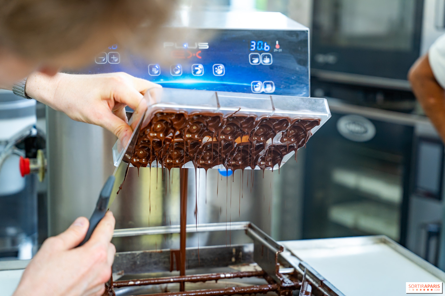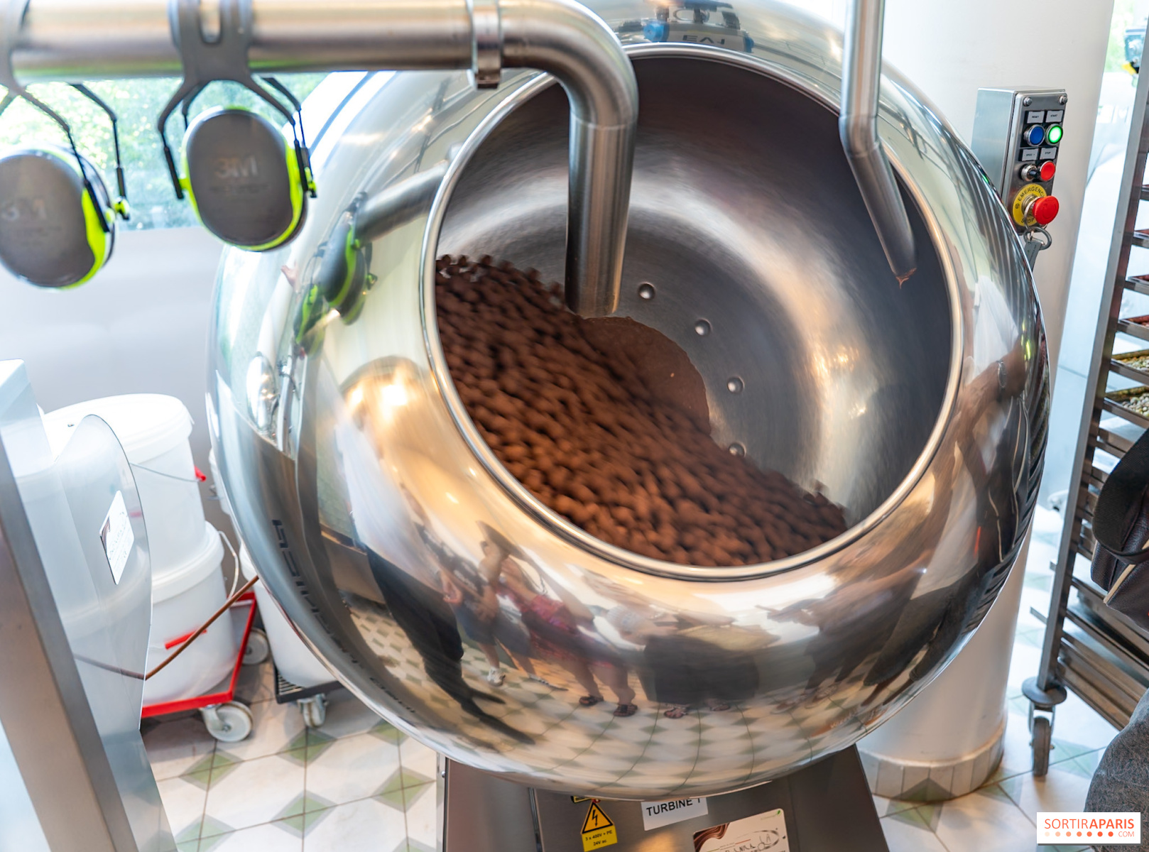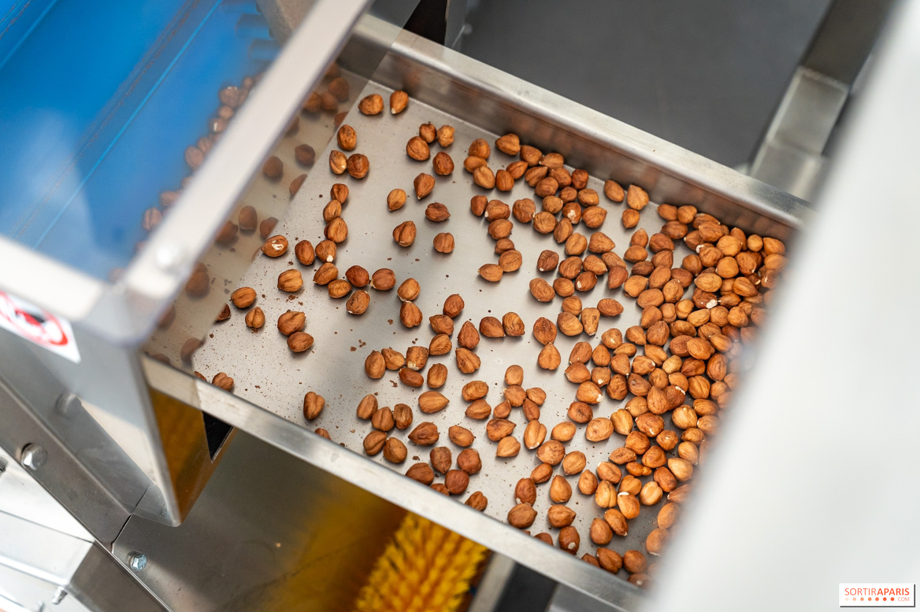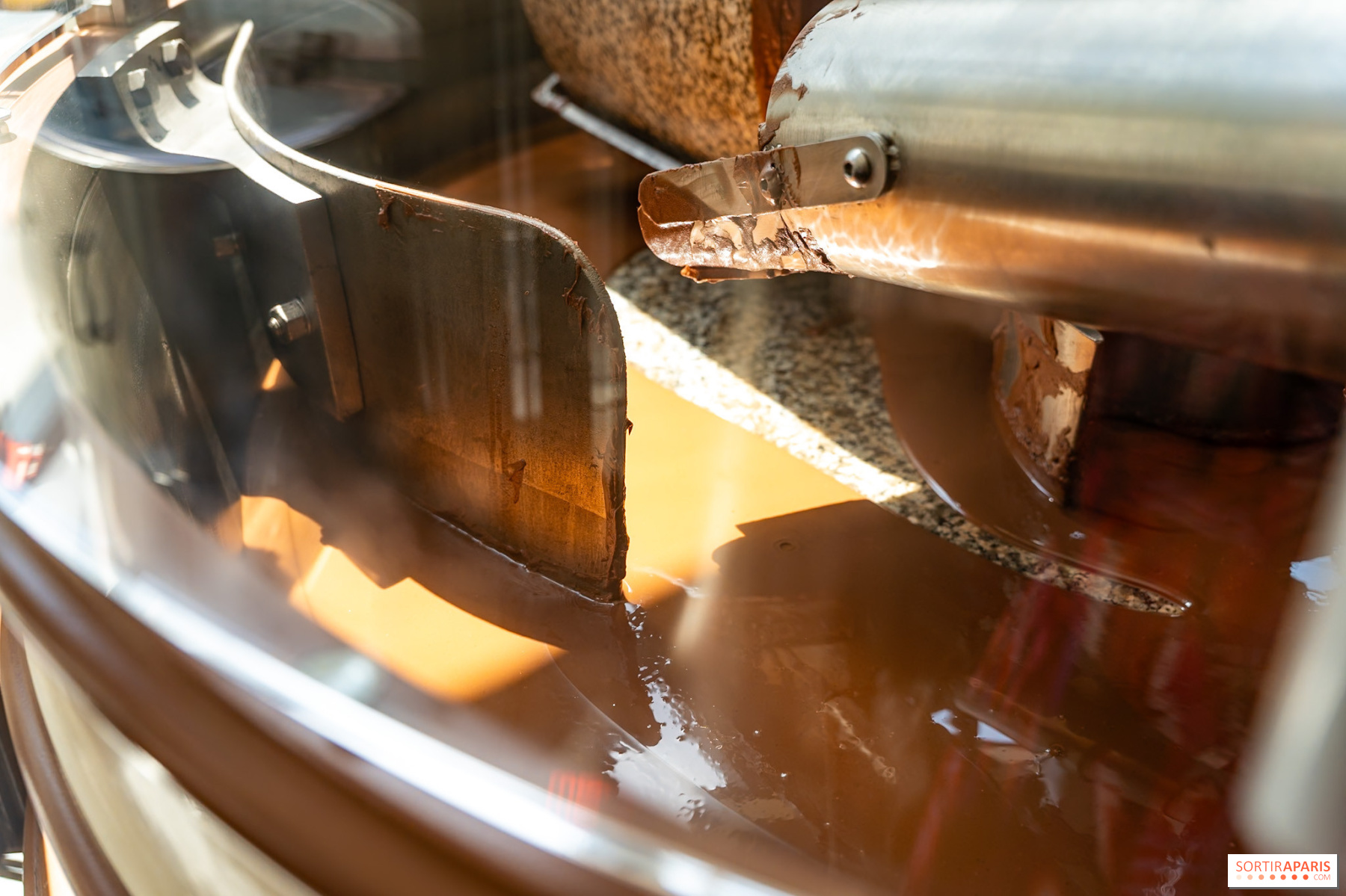 À l'intérieur, on découvre un espace lumineux, chaleureux, où se mêlent marbre, bois clairs et mosaïques aux tons vert clair, pensé avec soin pour valoriser le savoir-faire artisanal. Sous les effluves de noisettes torréfiées et de pralinés, on découvre une meule centenaire en provenance de Turin qui a nécessité bien des aménagements pour être installée, un chaudron en cuivre pour caraméliser les noisettes, ou encore des turbines pour les enrober de chocolat en mode fabrication à l'ancienne, mêlée à la modernité de l'équipement. À l'image de l'un de ses mentors, Nicolas Berger, Maxime Frédéric mets en avant ces machines artisanales à l'ancienne qui donne une production incomparable.