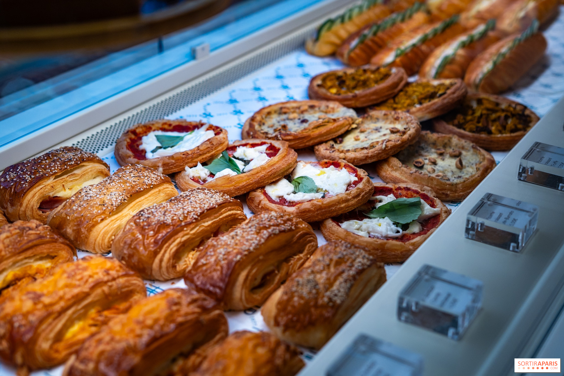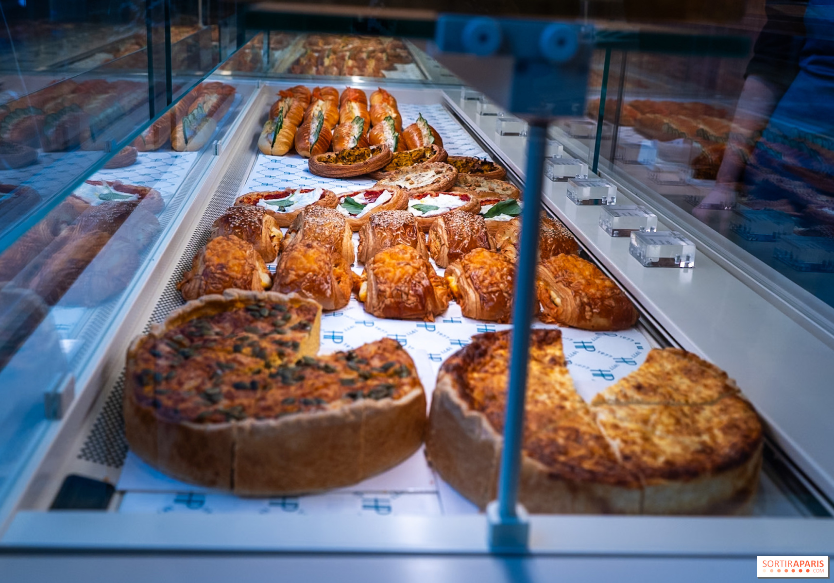 L'autre belle surprise de cette adresse, c'est l'arrivée de la viennoiserie et de la briocherie salée. "Je faisais de la viennoiserie, mais j'en faisais un petit peu. Et là l'idée c'est vraiment de proposer plus de choses", explique Hugues Pouget qui veut devenir "le pâtissier de tous les moments de la journée". Du petit-déjeuner au goûter en passant par la pause déjeuner, on trouve de beaux croissants, des croissants pistache, des chaussons aux pommes sur base de pâte à croissant, des pains aux raisins et de belles brioches feuilletées. Côté salé, ne manquez pas le plié suisse au cheddar et chorizo, la version jambon-béchamel, les quiches maison "filantes comme des flans", les pizzettes à la tomate et truffe, ou encore les sandwiches sur pain viennois avec des garnitures gourmandes comme le thon, mayo et oignons confits.