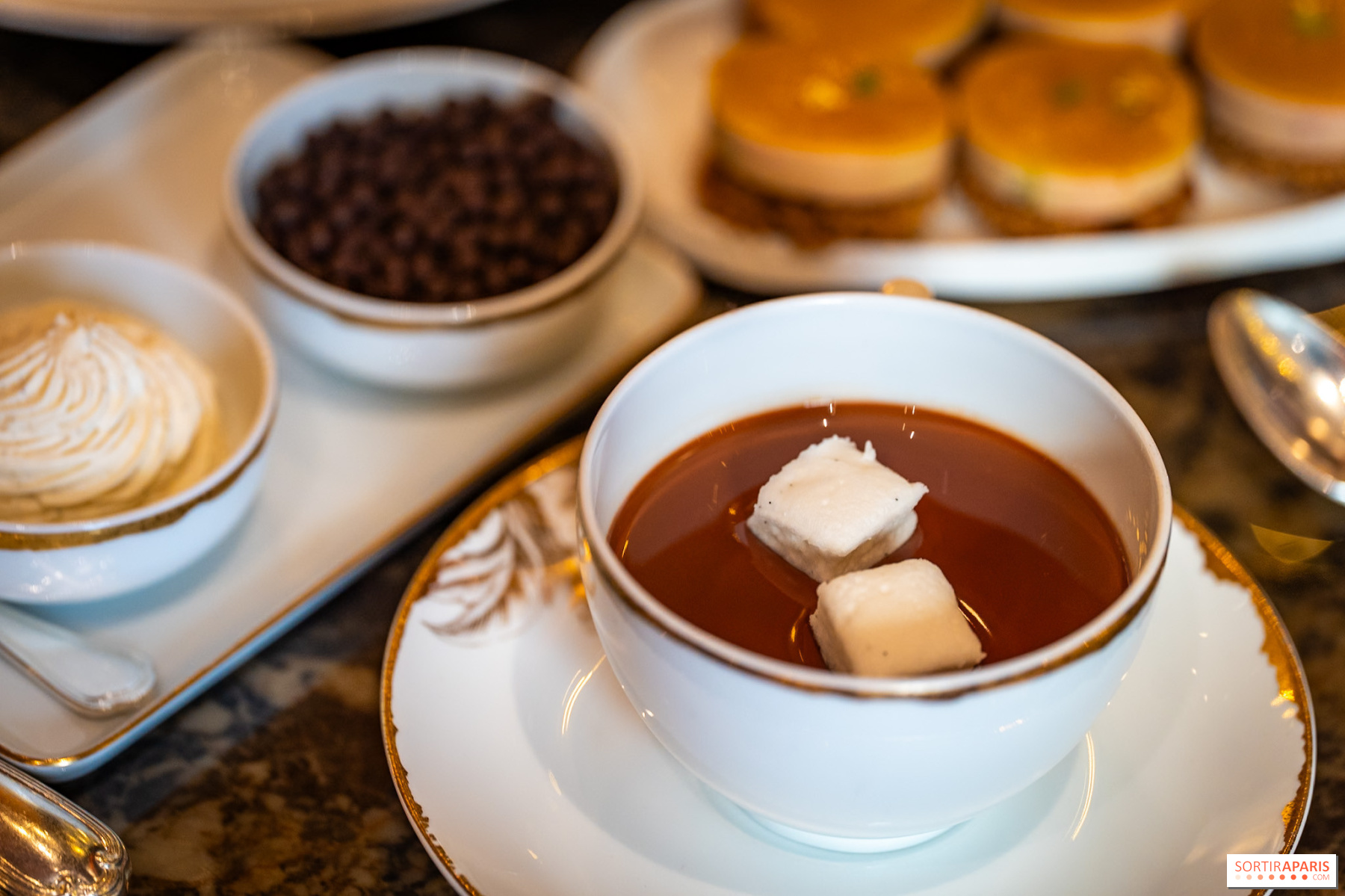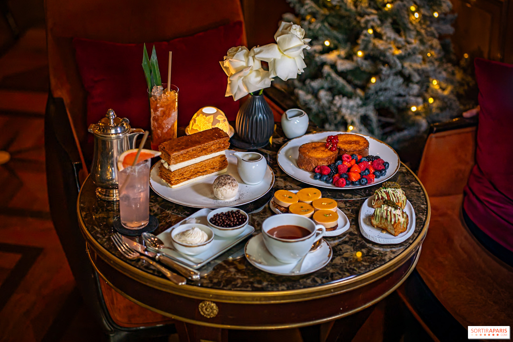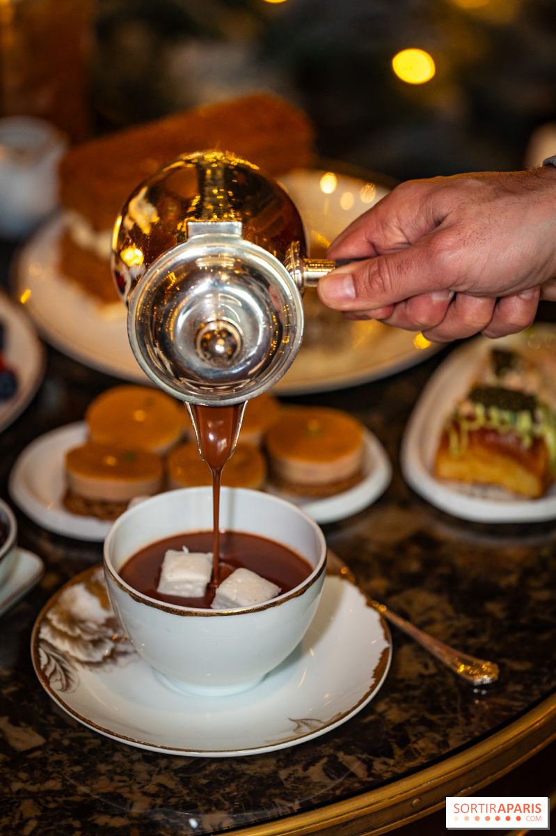 Les desserts signature du George V sont également de la partie, comme la mousse chocolat pécan et le cheesecake à la mangue. Chaque création est un voyage gustatif qui justifie pleinement la réputation du palace. Pour accompagner ces douceurs, on se laisse tenter par le chocolat chaud maison, réconfortant à souhait.