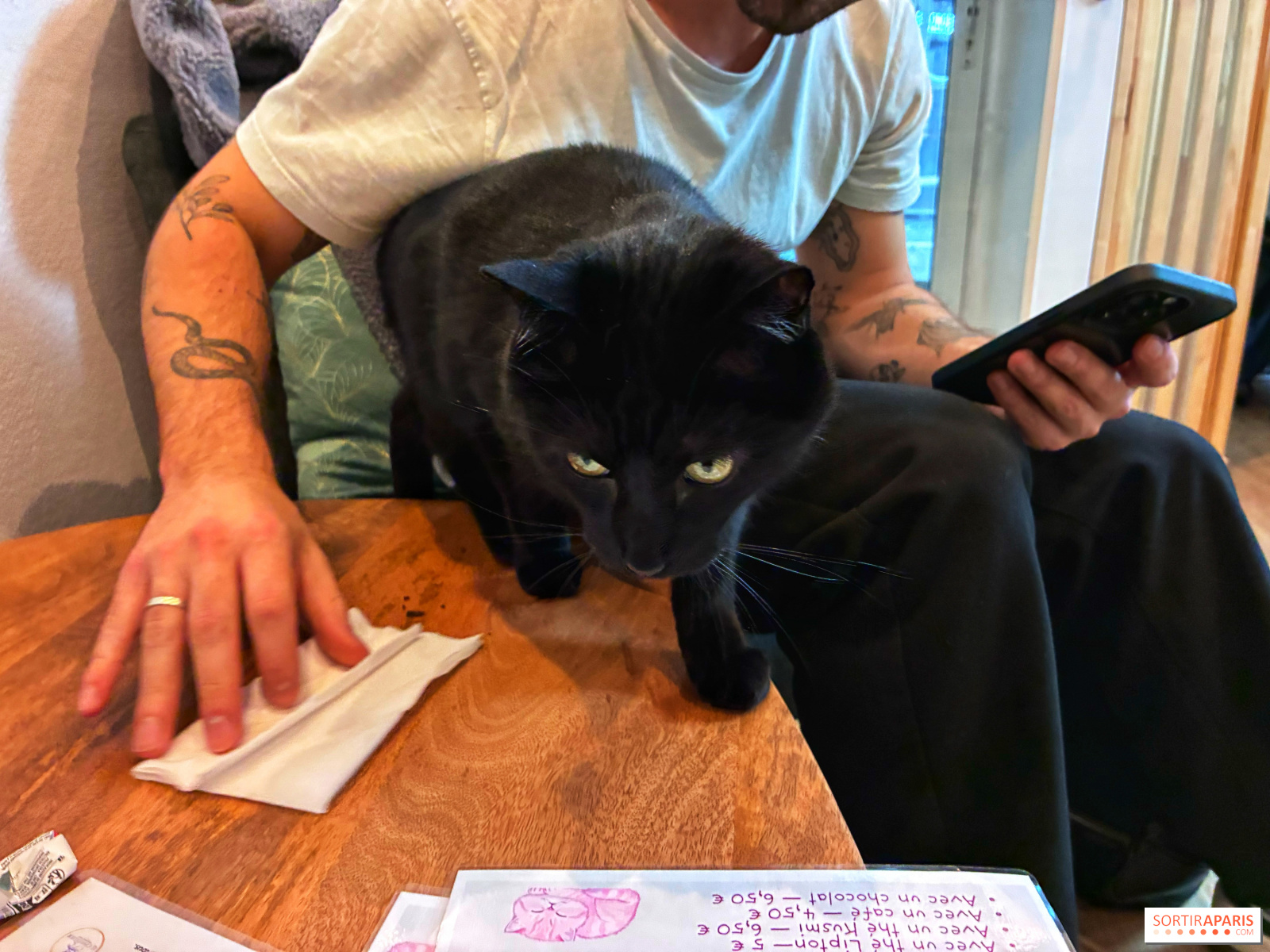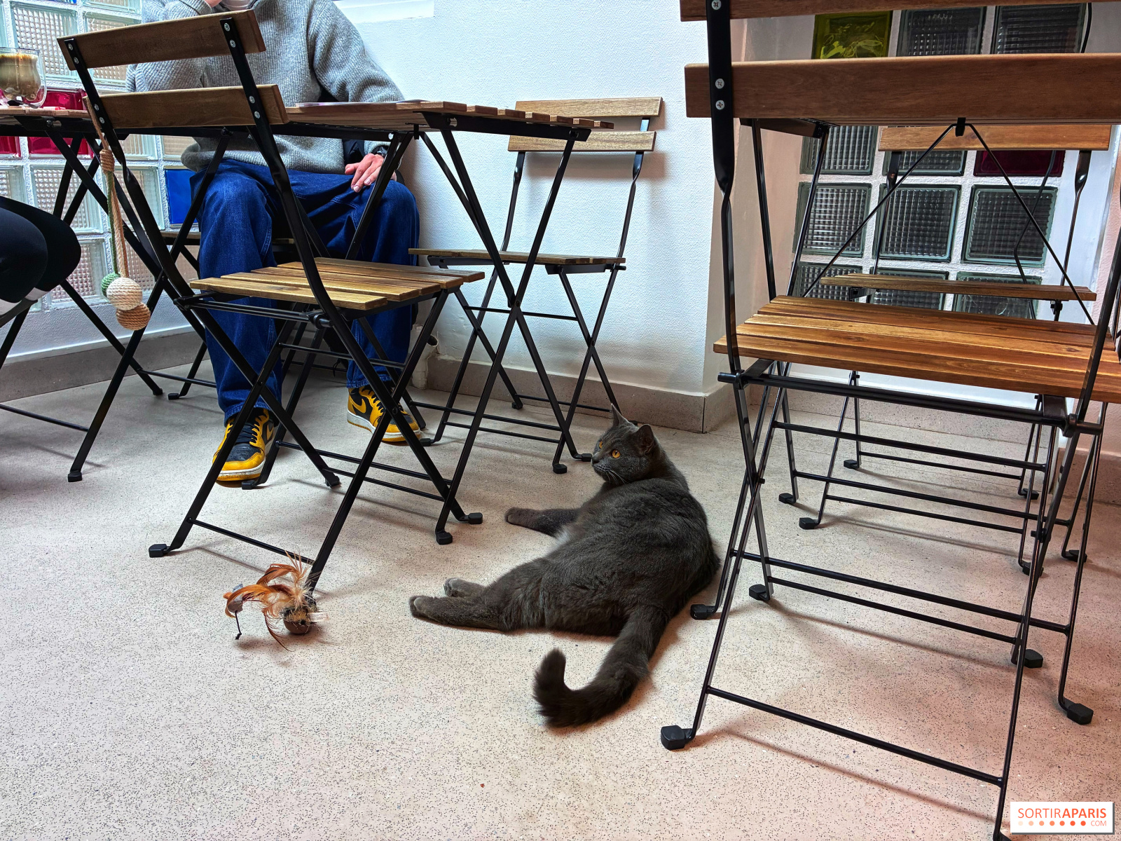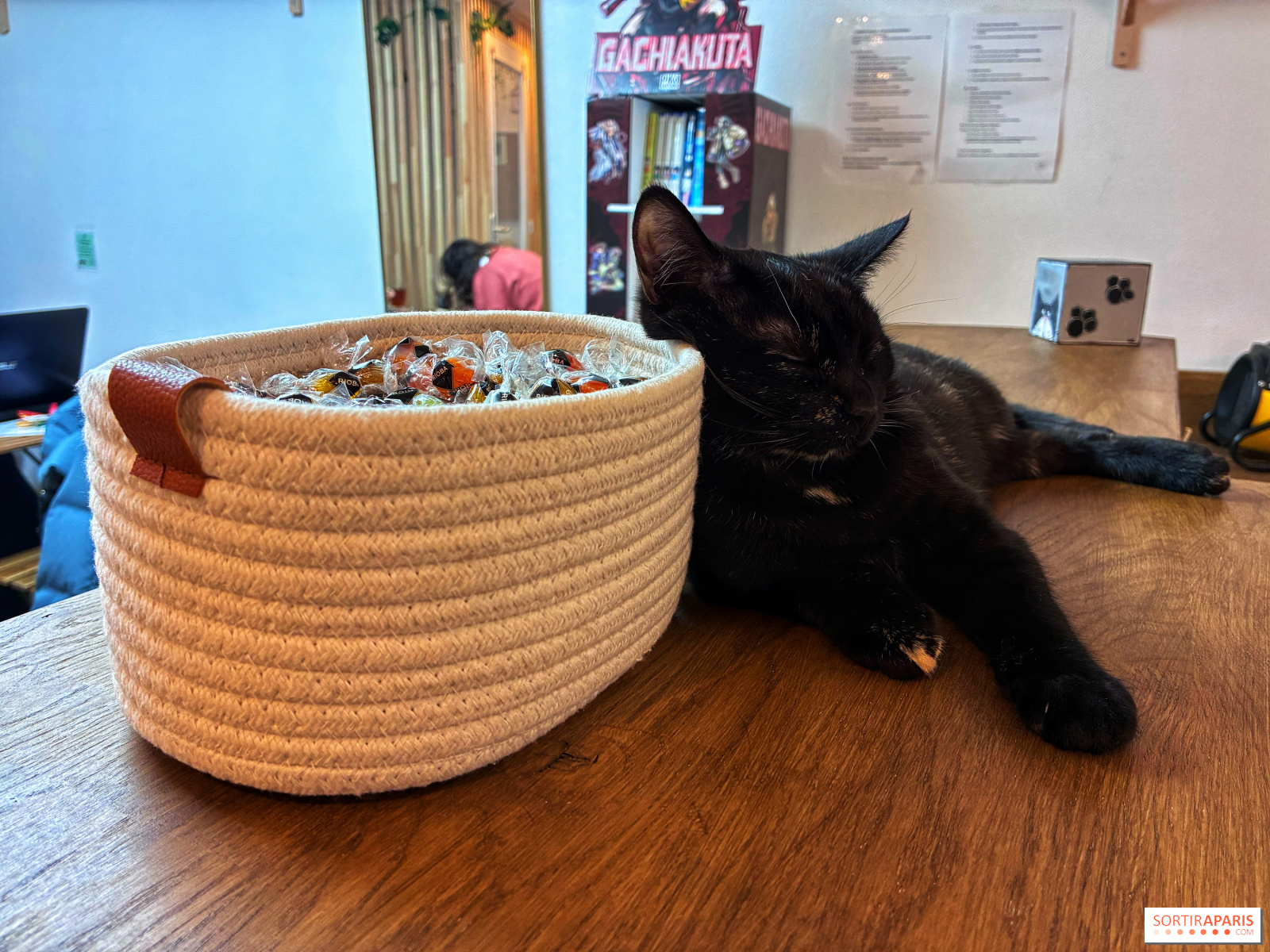 Quant au rez-de-chaussée, dédié à l'espace coffee shop, vous êtes invités à y rencontrer les cinq chats de refuge qui se sont installés là pour la vie, tous adoptés par Nadège. Si l'idée de les faire adopter par les clients avait fait du chemin, elle a surtout souhaité leur offrir une maison où ils se sentiraient rassurés, plutôt que de leur faire revivre un déménagement. Mais de temps en temps, des journées sont organisées pour permettre aux autres chats du refuge de trouver leur foyer !