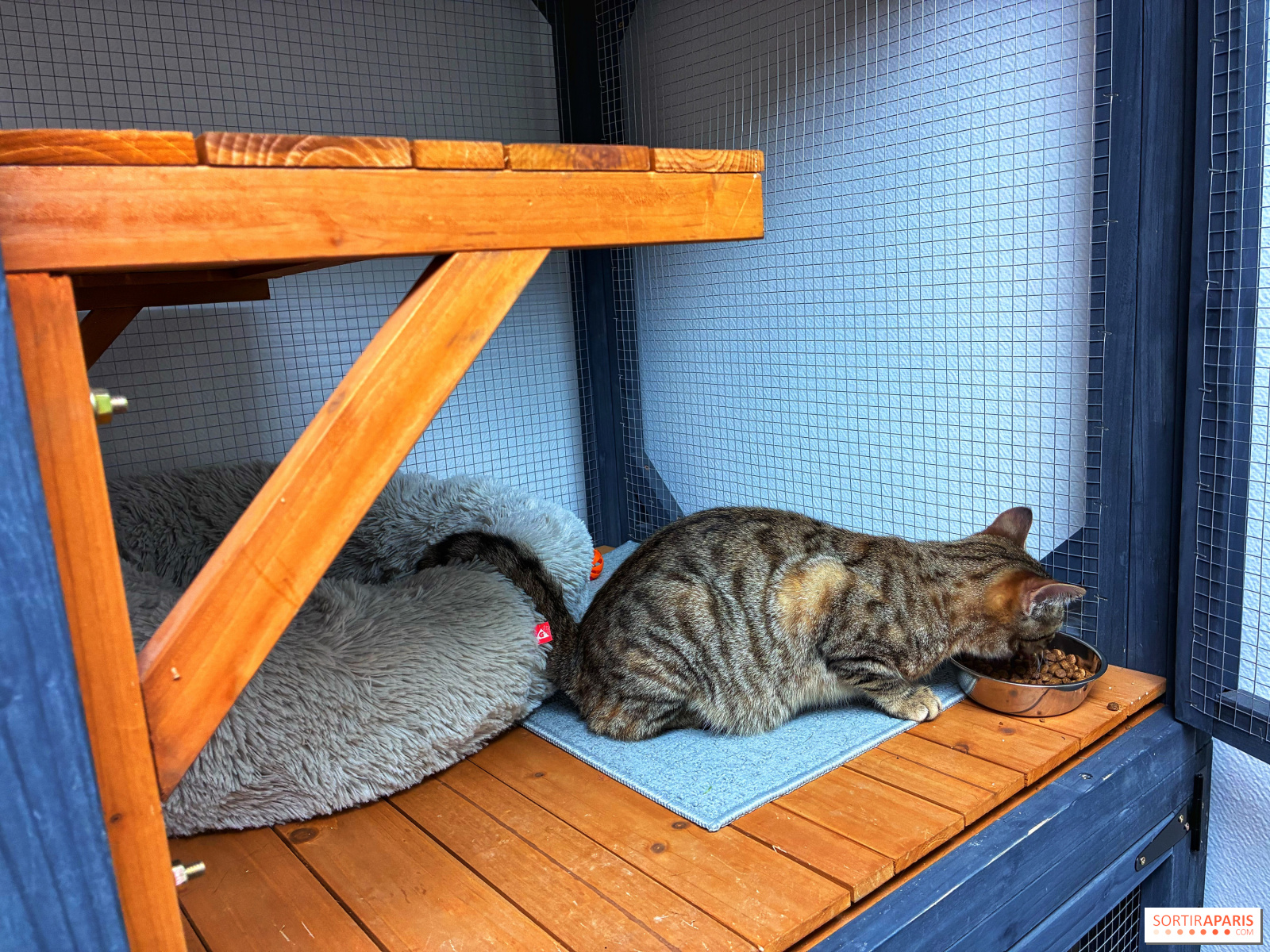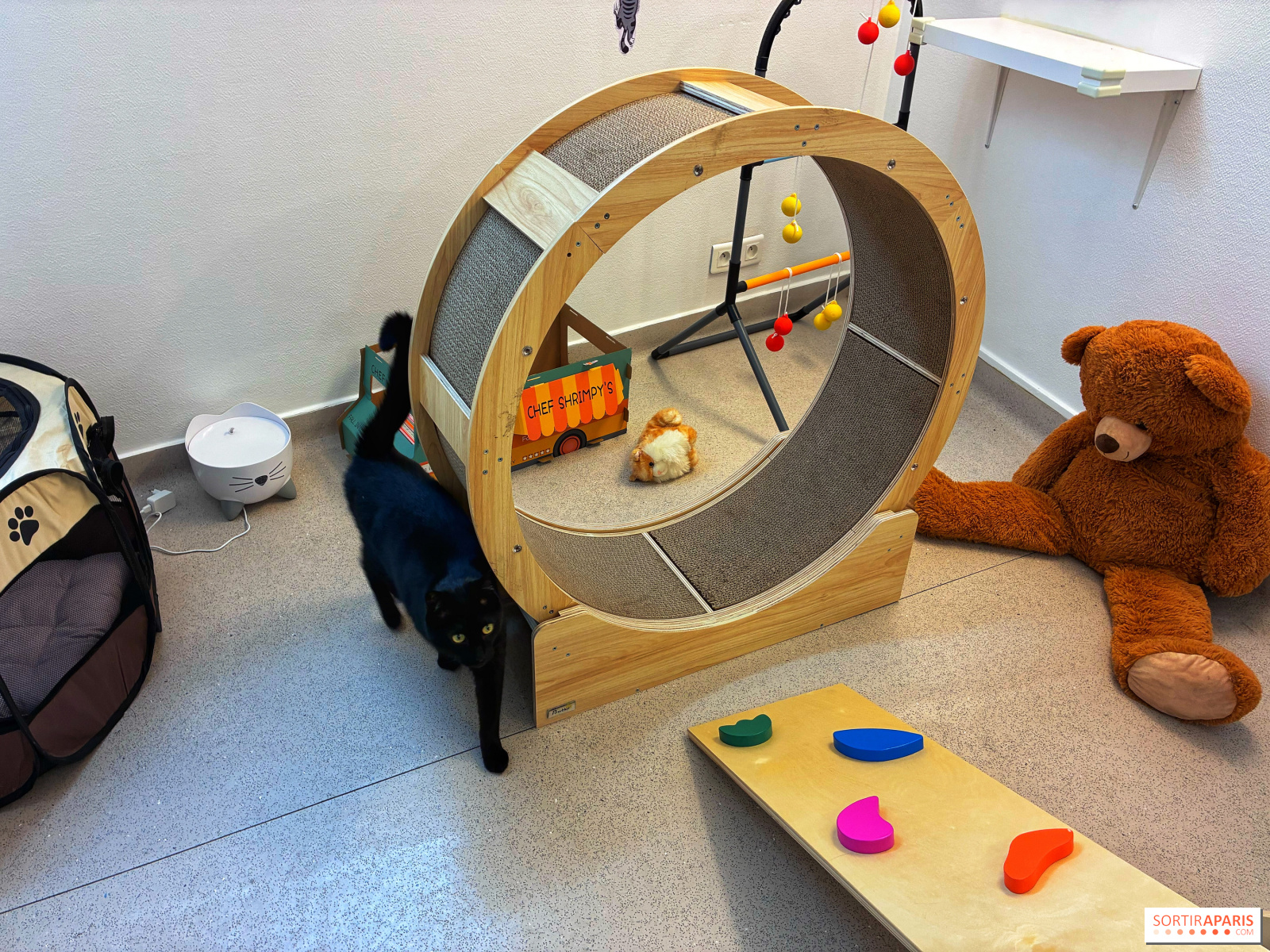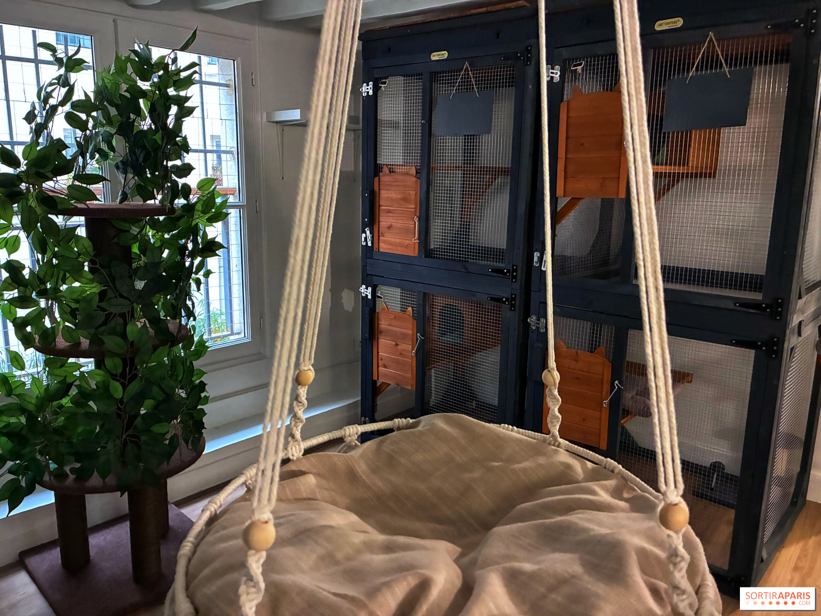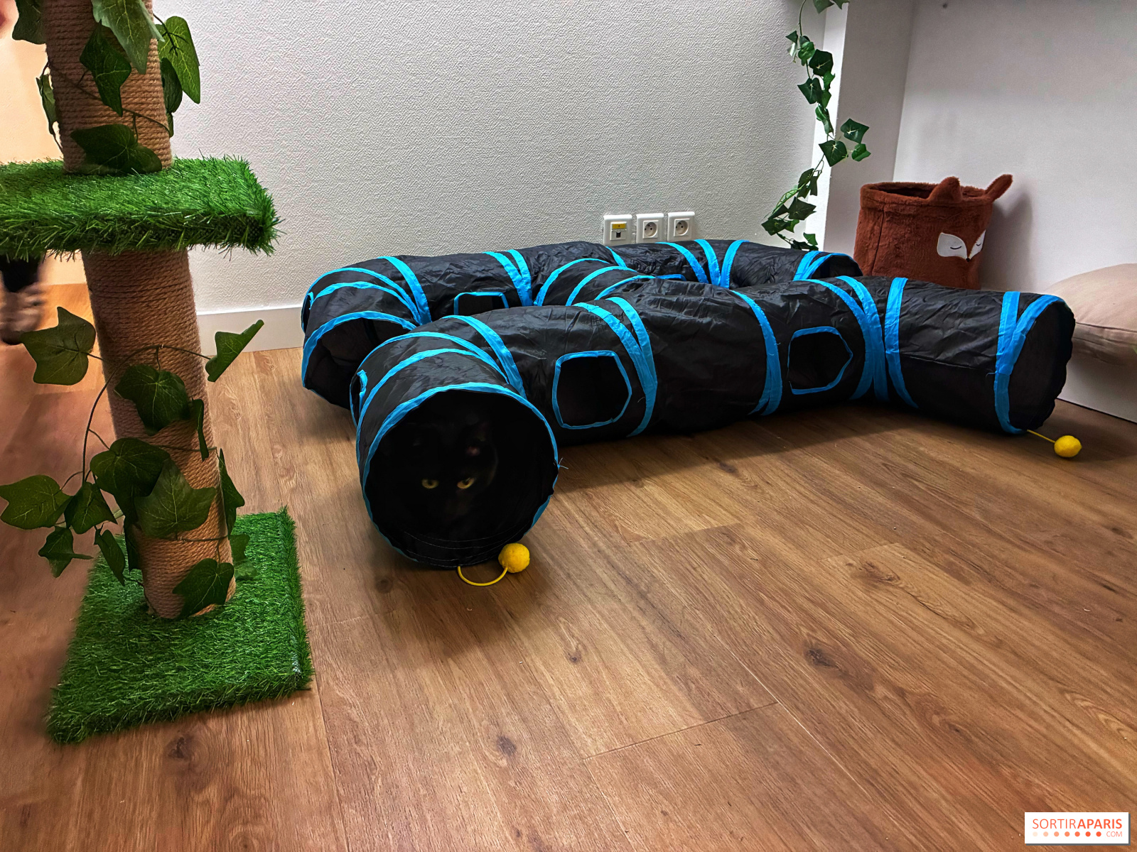 Car il n'est pas question pour les visiteurs de papouiller les chats en pension, ceux-ci peuvent se reposer ou jouer au calme, avec leurs congénères ou seuls, dans l'une des multiples aires de jeux à leur disposition, dignes d'un parc d'attraction pour chats.