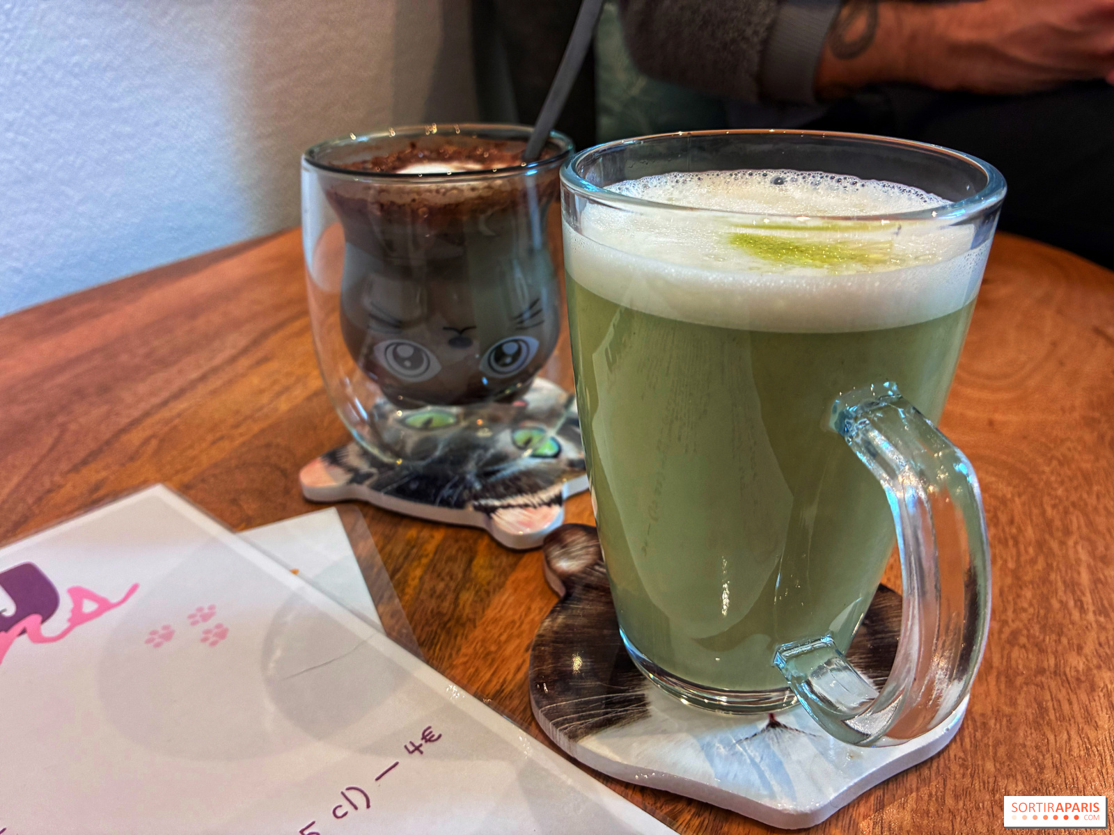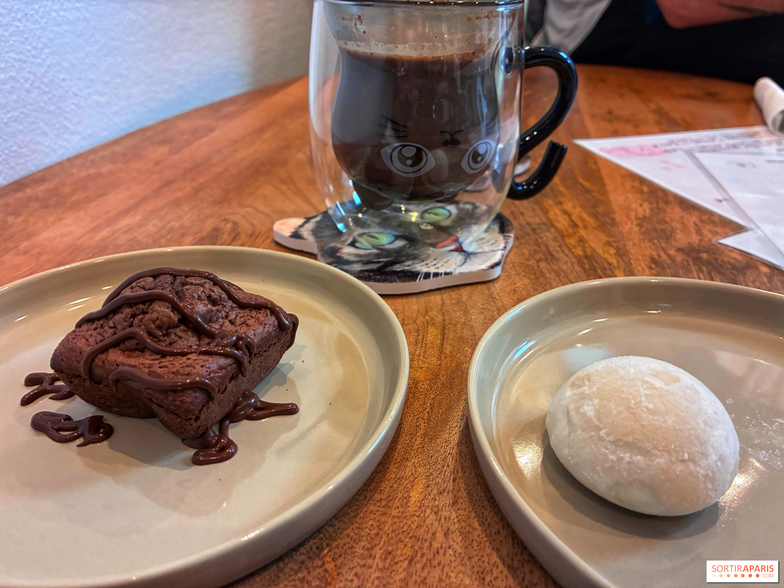 Nous avons opté pour un excellent chocolat chaud (5€) dans un verre chat très mignon et un matcha latte (6,5€) aérien et délicatement sucré, accompagnés d'une petite gourmandise. À noter, ces dernières ne sont pas destinés aux estomacs très vides, leur portion n'étant pas immense, et elles ne sont pas faites maison, mais font tout à fait l'affaire pour un en-cas. Au menu, mochis glacés, brownie au chocolat, madeleines, café gourmand ou chips pour les becs salés (2 à 3€) !