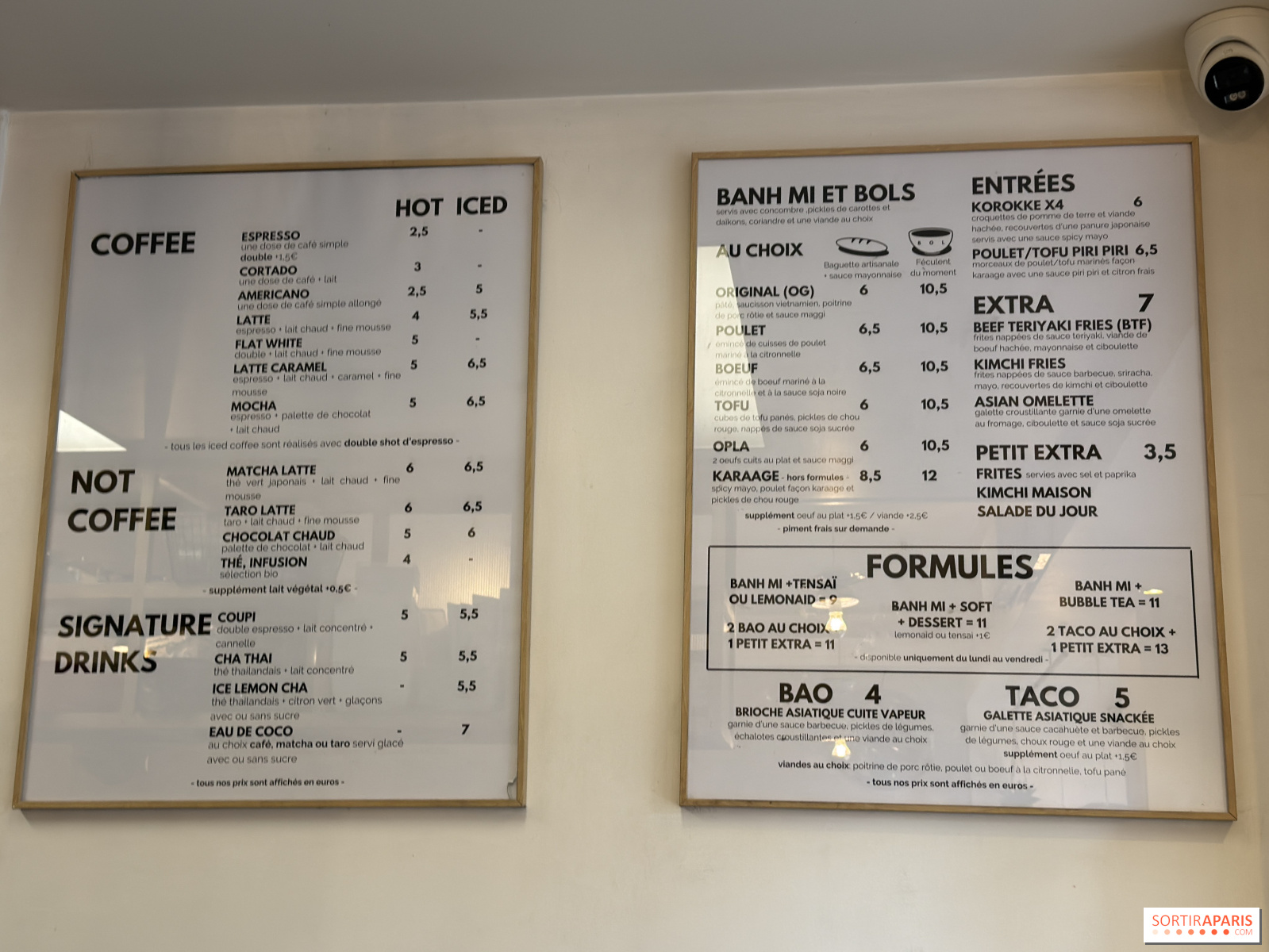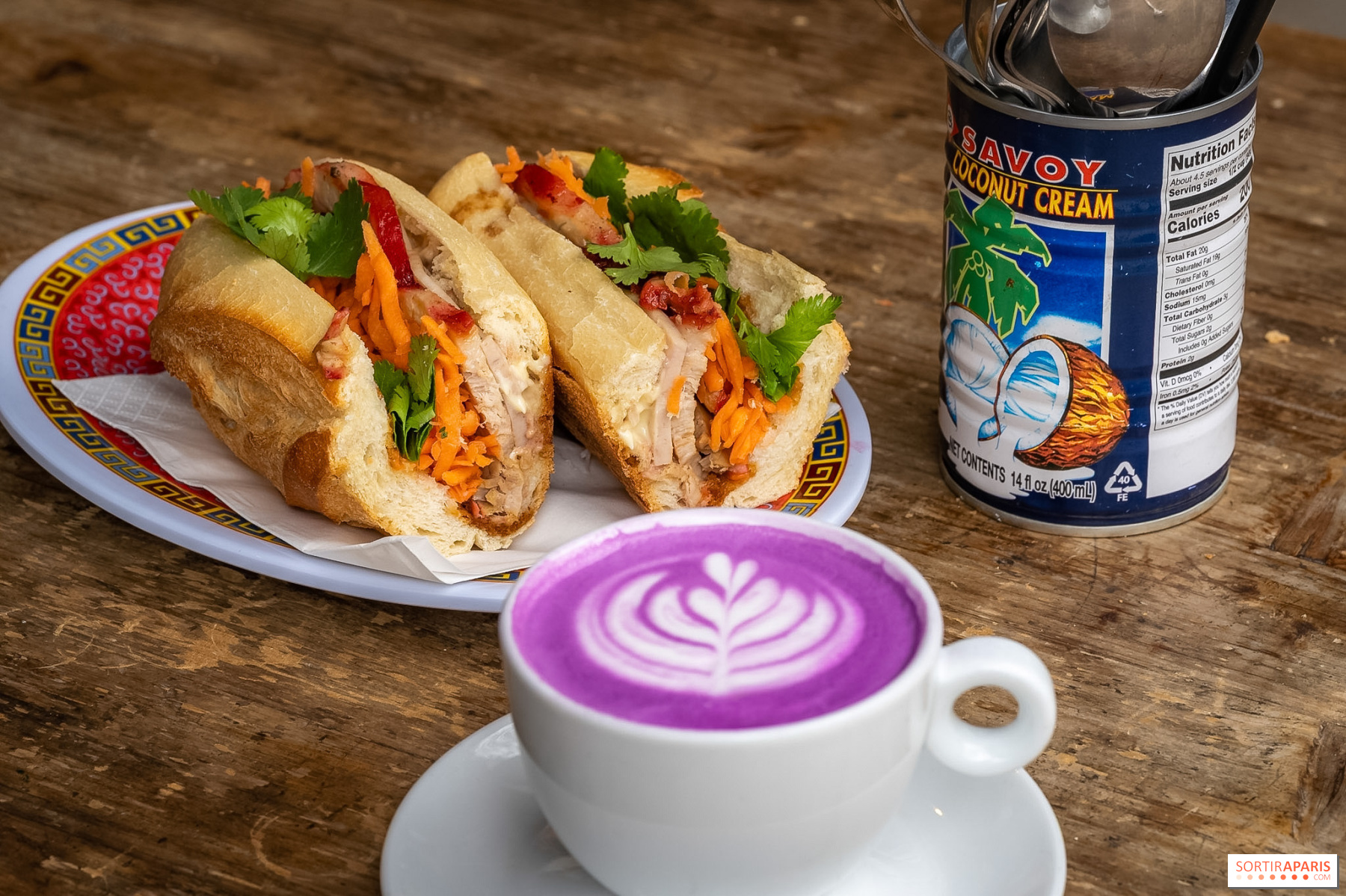 C'est aussi ce qui distingue Coup bar d'une simple cantine. Le latte est soigné, l'espresso bien extrait. On recommande la signature Coupi, un double espresso au lait concentré et à la cannelle servi glacé, ou le Cha Thai au lait concentré. Les amateurs de bubble tea trouveront une belle sélection de parfums : taro, mangue, litchi, passion, fruit du dragon. Le matcha latte et le taro latte complètent une carte boissons vraiment bien pensée. On a pris de notre côté un bon latte taro au joli latte art.
