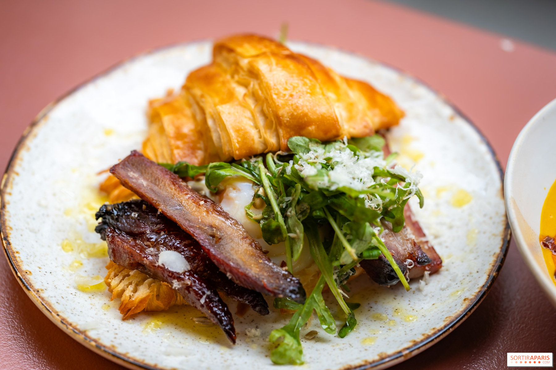 Le croissant salé (12 €) mérite aussi qu'on s'y attarde : ricotta fouettée, œuf parfait, tranche de porc laqué de sa maman, roquette, graines toastées et comté râpé. Un assemblage qui surprend en bien.