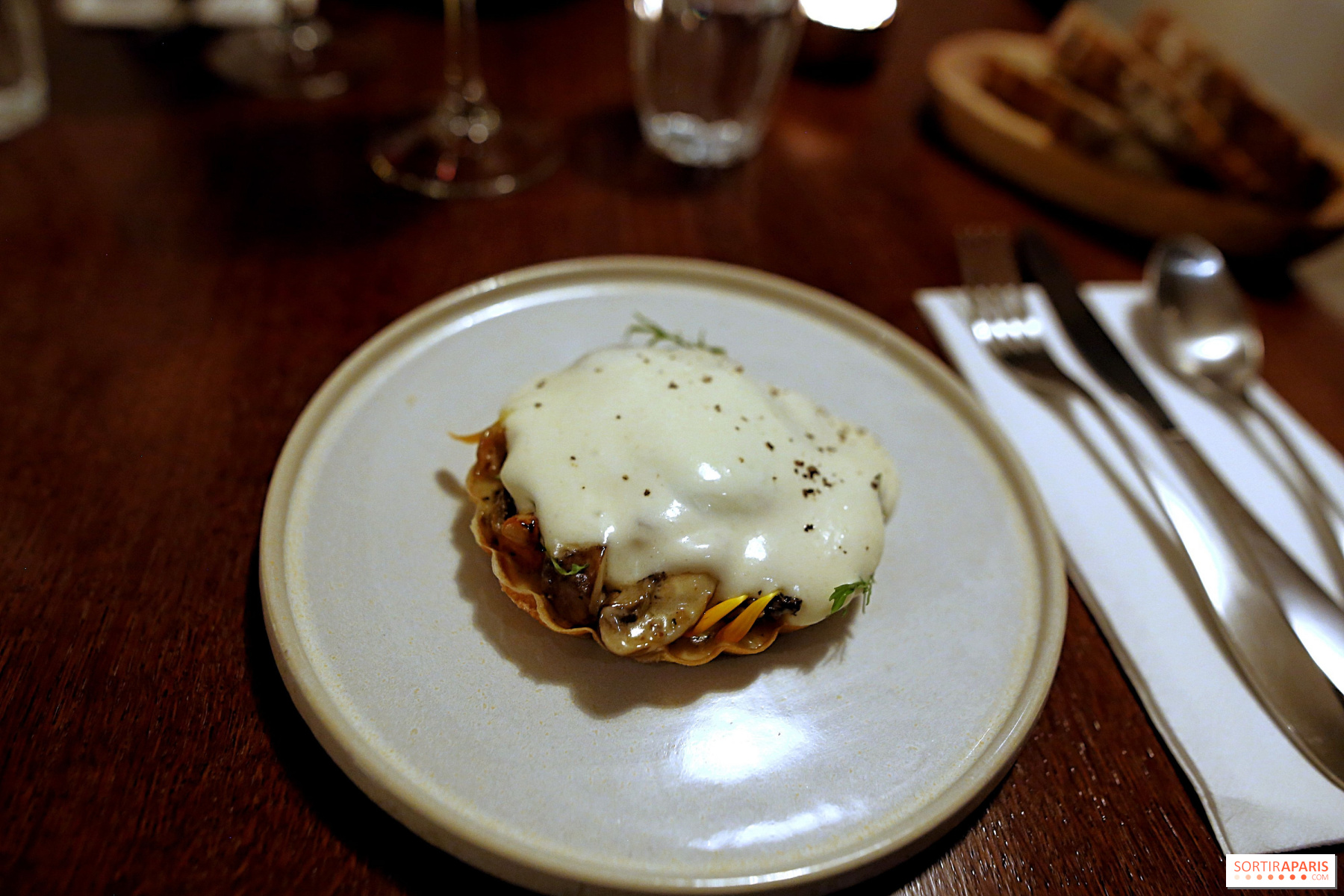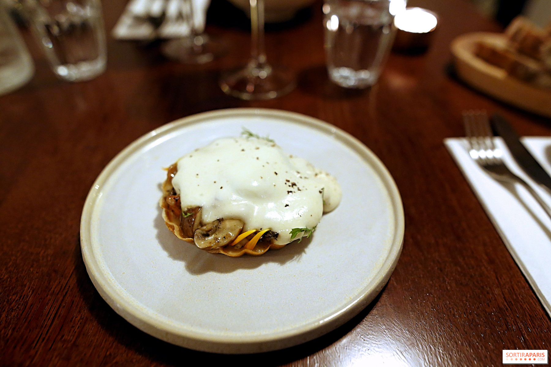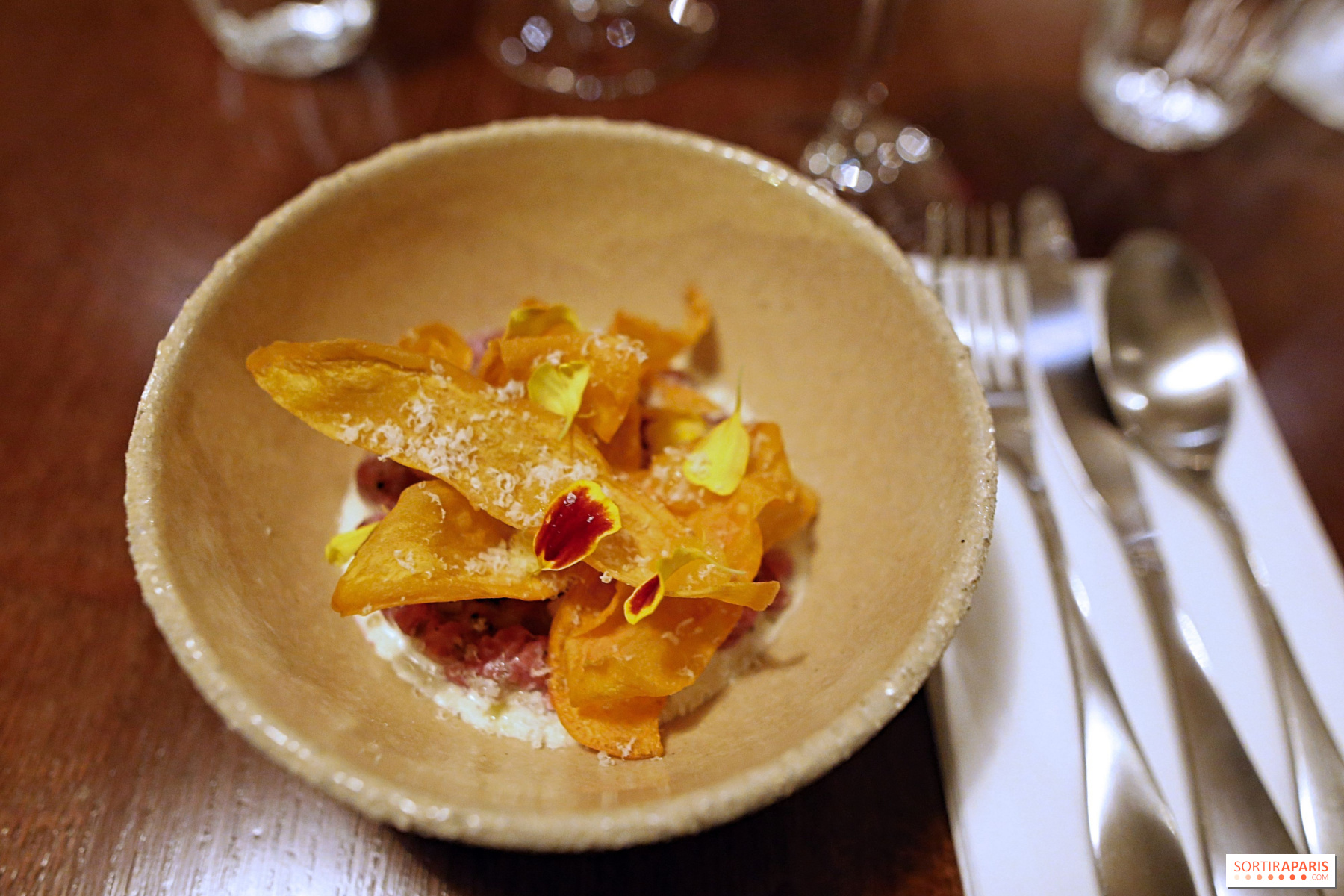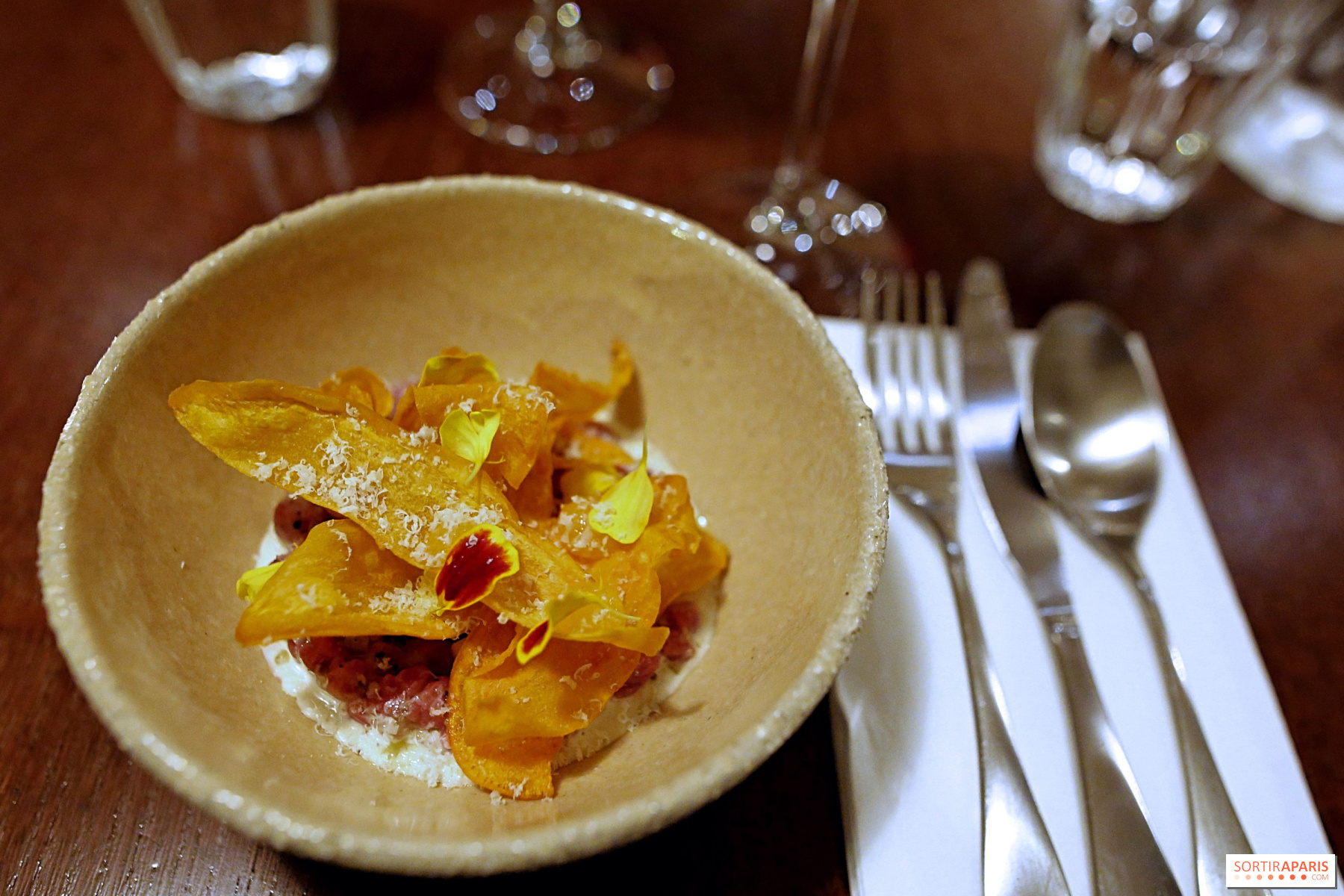 Du côté de la carte, pas de propositions à rallonge, mais un nombre limité de suggestions. Ce soir-là, le restaurant dévoile ainsi sept propositions de tapas, quatre entrées, quatre plats et trois desserts. Une carte courte donc et efficace. Nous débutons la dégustation avec un premier coup de cœur pour le succulent tartare de bœuf, accompagné de kaki, de ricotta fumée, d'une sauce aux anchois, et de chips de patate douce sur le dessus. Non seulement, le dressage nous met en appétit, mais les goûts sont parfaitement équilibrés, offrant une véritable explosion en bouche. En face, on craque pour la tartelette de champignons, son jaune d'œuf et quelques lardons, le tout dissimulé sous une onctueuse et savoureuse crème de parmesan.