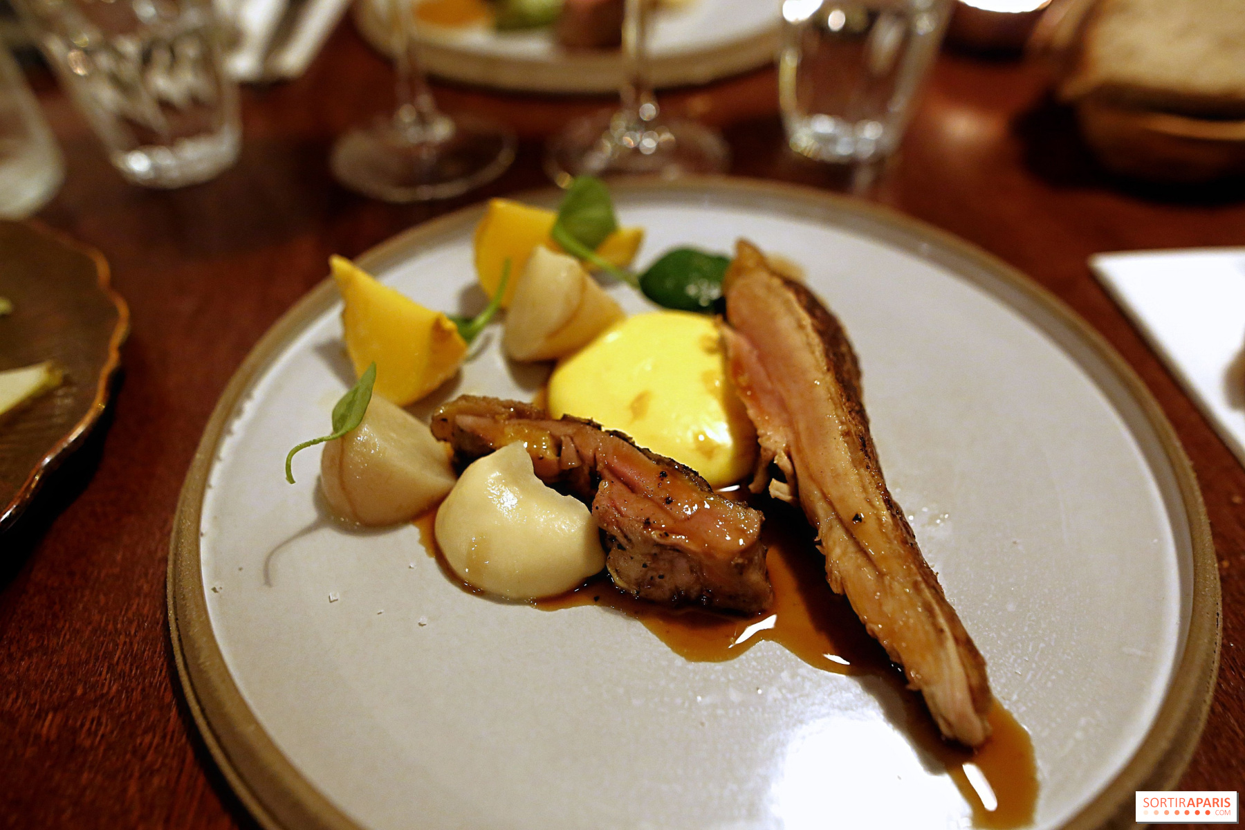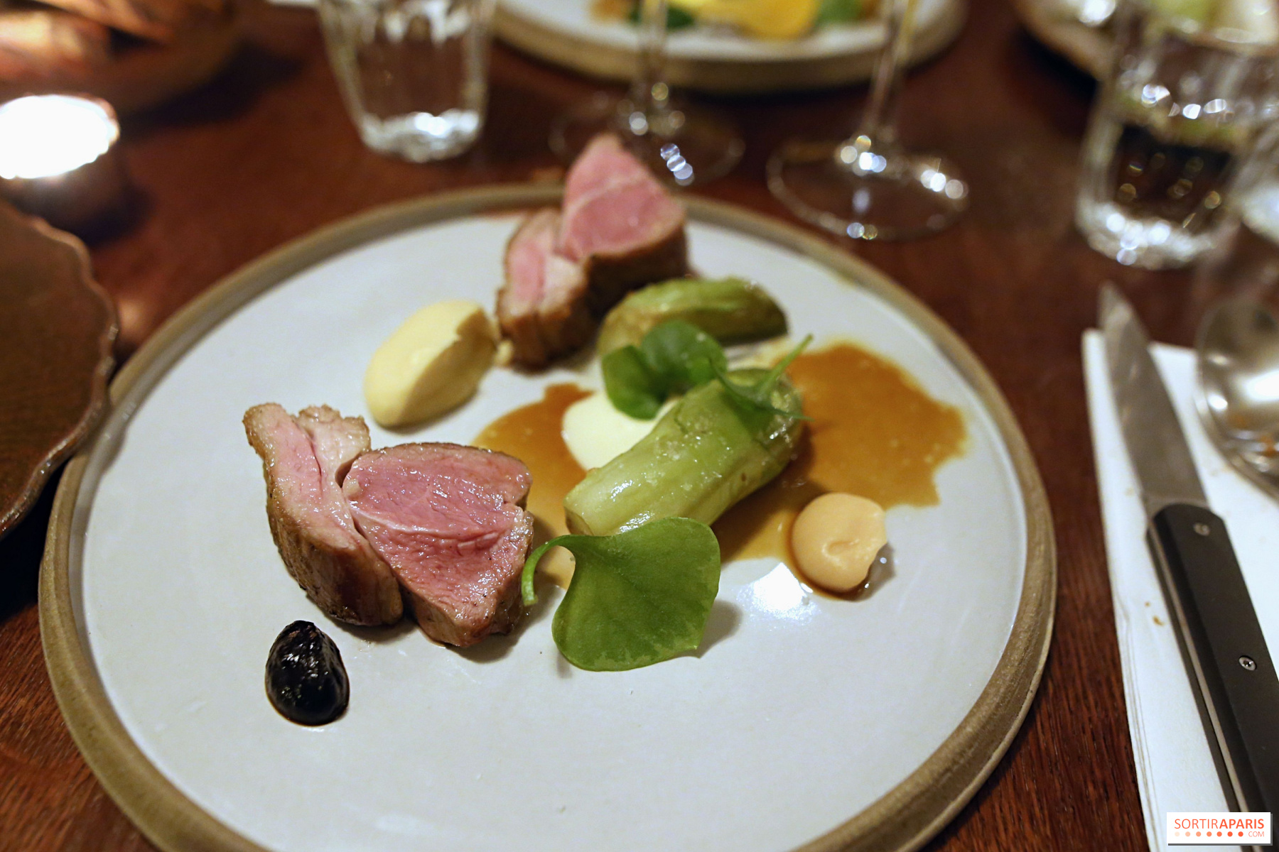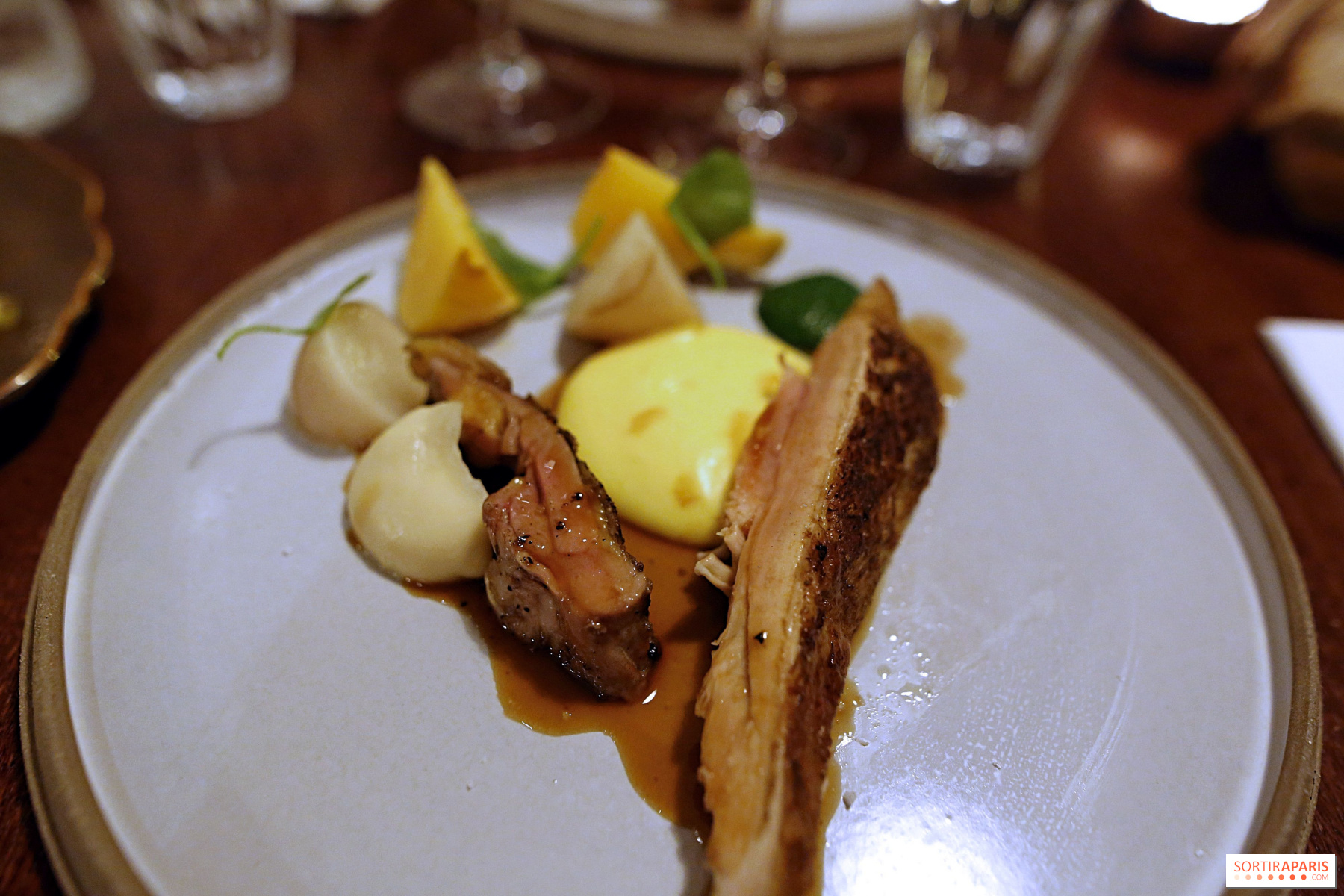 On poursuit le voyage culinaire avec une pintade grillée à la peau croustillante, accompagnée de navets et d'un sabayon au vin jaune. Une proposition simple, mais là encore parfaitement exécutée. Autre plat, autre belle proposition avec le tendre carré d'agneau, condiment camembert et ail noir et un légume italien qu'on a peu l'habitude de manger, la puntarelle, également surnommée la Chicorée de Catalogne. Pour ces deux plats, on a apprécié la justesse des assaisonnements, la cuisson maîtrisée des viandes et l'équilibre parfait des saveurs.