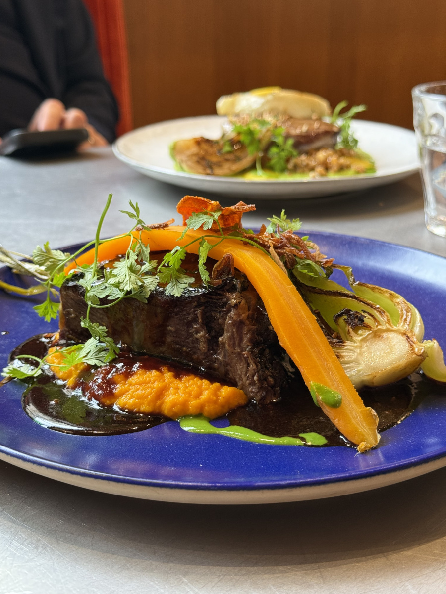 Côté plats, la carte déroule une cuisine de terroir décomplexée : poitrine de cochon en cuisson lente et carottes fondantes, grosse entrecôte Salsa verde avec échalotes et frites maison, poulpe grillé terre-mer, ni viande ni poisson pour les envies végétariennes, sans oublier la pêche du jour notée à l’ardoise. Dans l’assiette, il y a de la couleur, du jus, du croustillant – bref, tout ce qu’on attend d’un bon bistrot parisien qui ne se prend pas trop au sérieux, sauf quand il s’agit de bien manger.