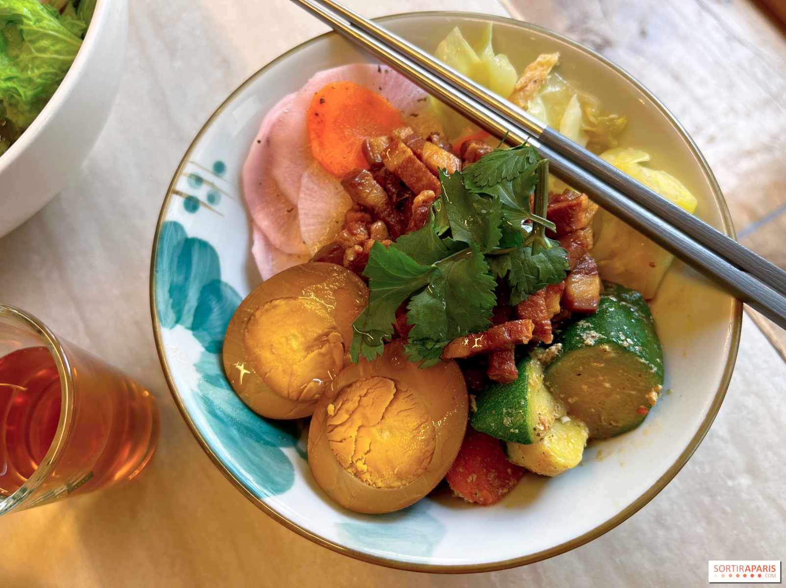 Et pour se rincer le gosier, le thé (chaud et froid) occupe ici plus d’espace que la nourriture (littéralement, la carte des thés dépasse celle des mets !), et une formule 'dégusthé' accompagne, moyennant 2€, le plat du jour d'une tasse de thé inspirée par la saison. Le thé glacé au melon d’hiver à la taïwanaise (6€) surprend le palais, très sucré certes, mais avec une saveur de gâteau beurré. On en reprendrait bien un verre !