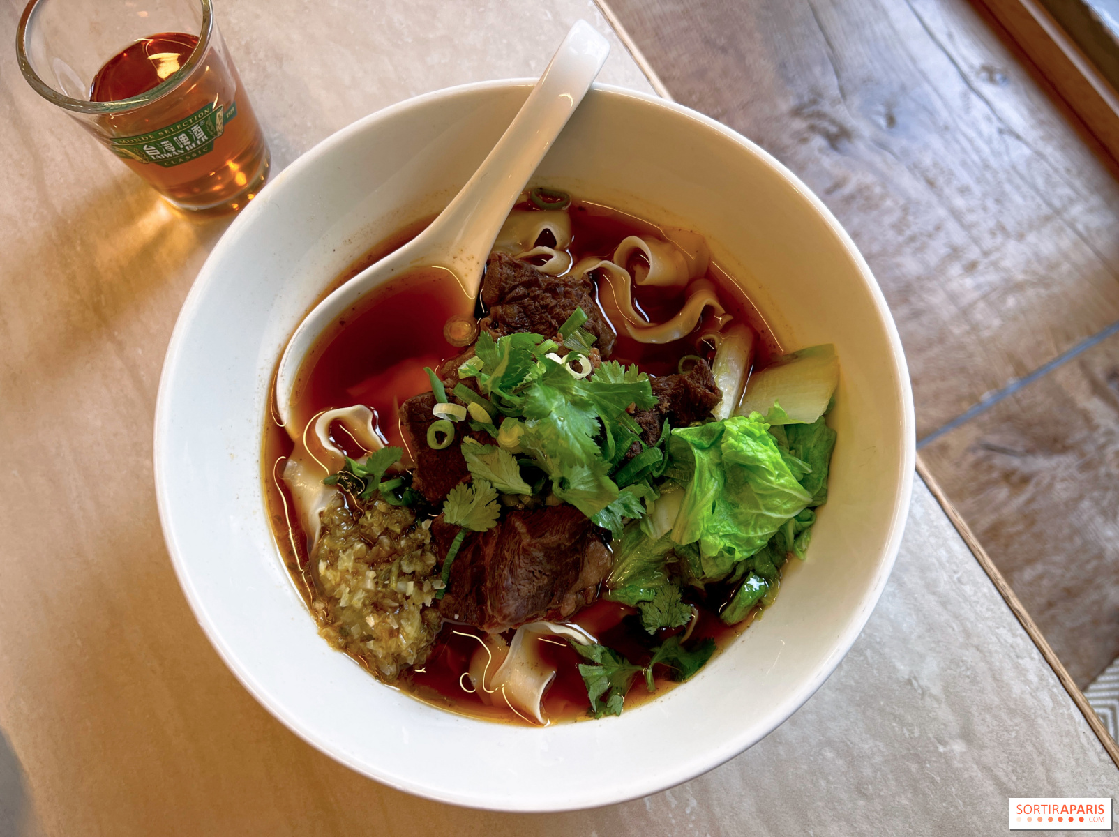 Côté plats, le bol de riz au porc braisé et œuf dur aux cinq épices (16€) joue la carte du réconfort, avec un certain gras assumé et des pickles de radis pour un chaud-froid/rond-acide appréciable. Le niu rou mian, une grande soupe de nouilles au bœuf (20€), est le plat signature de la Maison, avec un bouillon clair mais sapide, des nouilles plates légèrement ondulées, et une viande aussi tendre que dans un bourguignon.