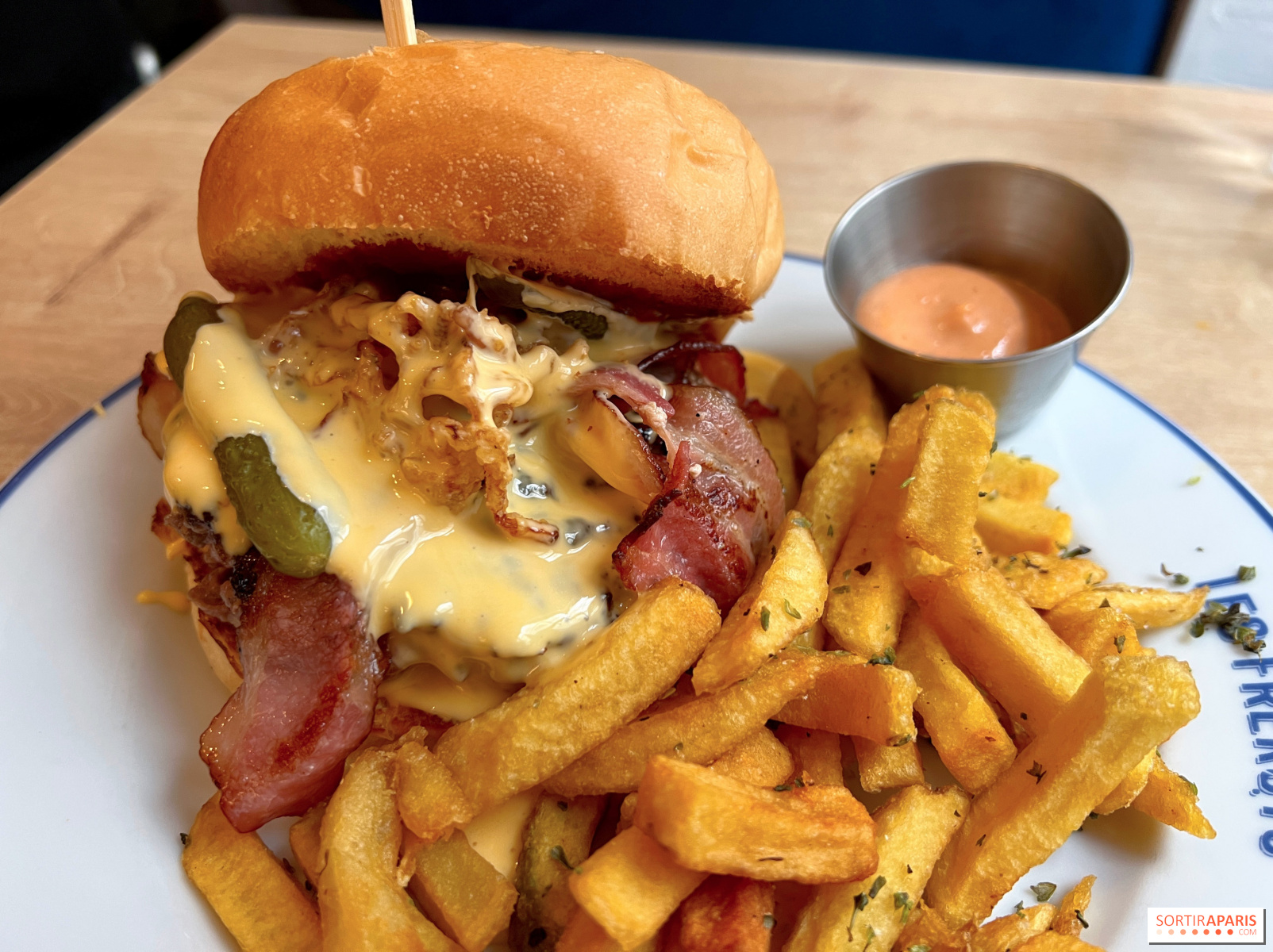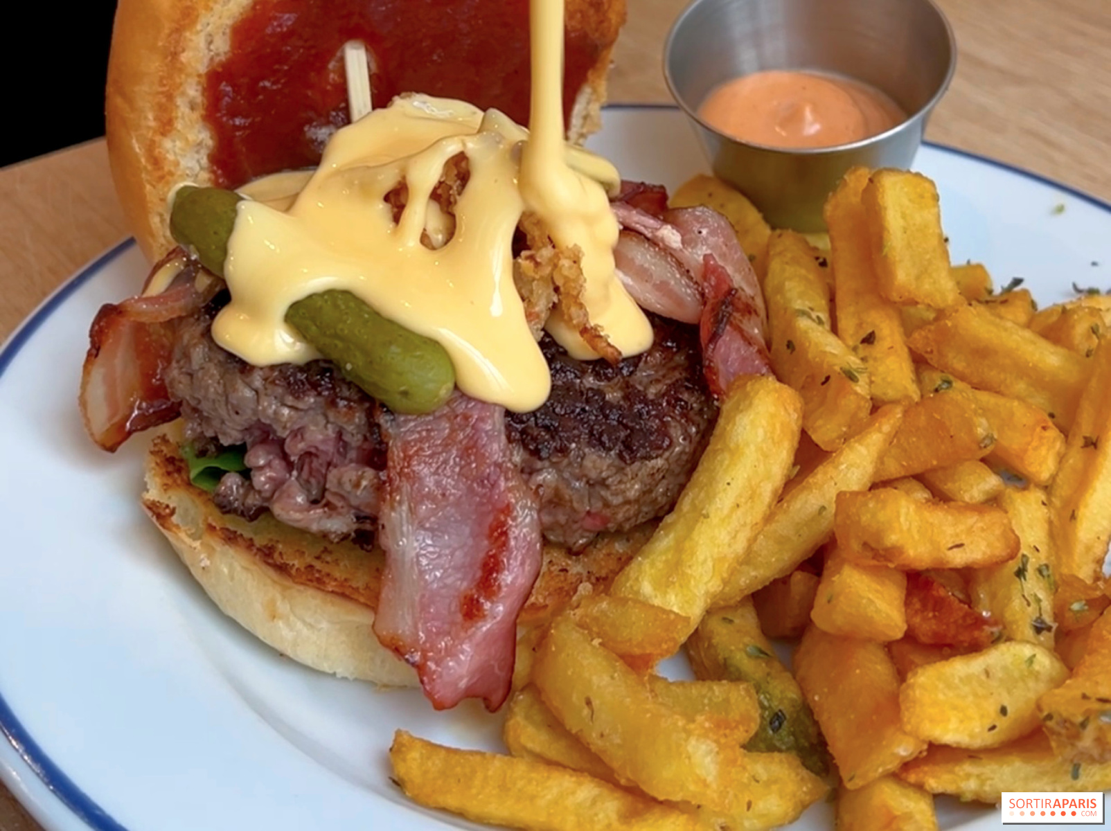 Composé de bœuf d'Aubrac, de bacon, d'oignons croustillants, de cornichons, de mesclun et sauce barbecue, le burger arrive sur table brûlant, escorté d’une petite casserole de cheddar versé à la louche. Spectacle pour les yeux, le fromage nappe sans noyer, enrobe sans écœurer, rien à voir avec certaines versions excessives parfois rencontrées sur les réseaux sociaux. Ici, l'équilibre prime.